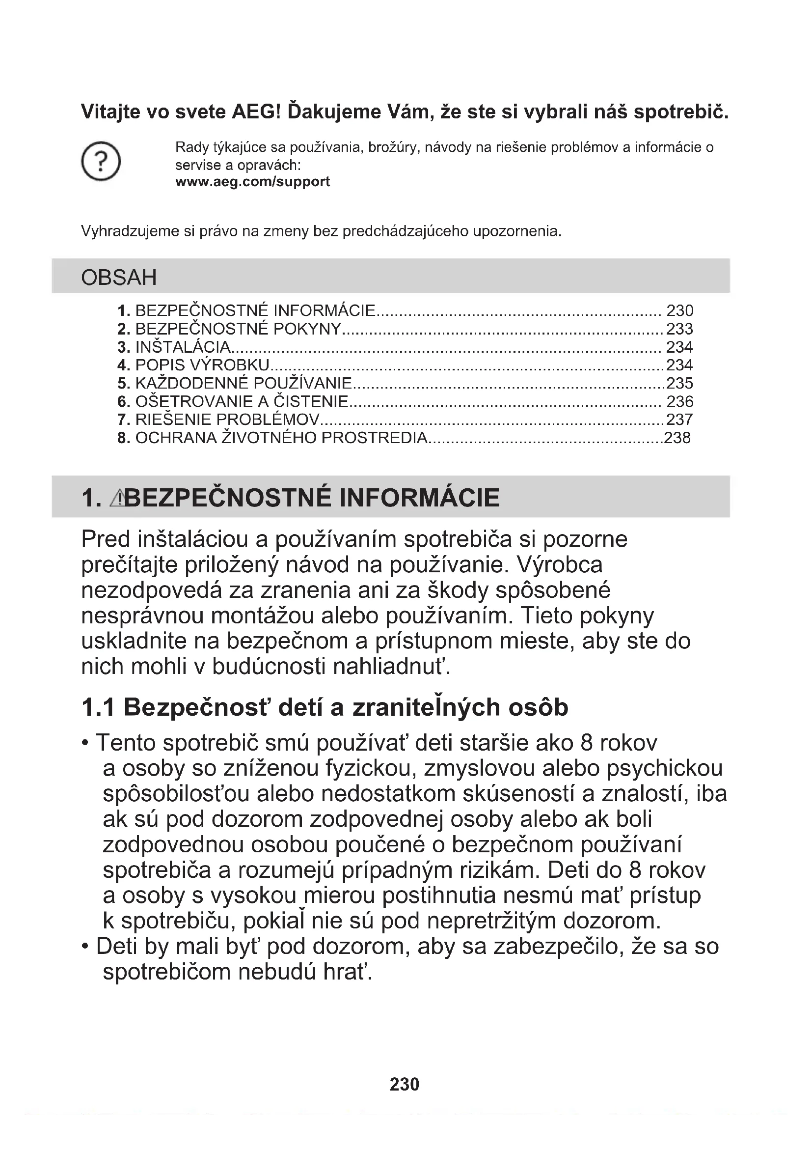 - Tento spotrebič smú používať deti staršie ako 8 rokov a osoby so zníženou fyzickou, zmyslovou alebo psychickou spôsobilosťou alebo nedostatkom skúseností a znalostí, iba ak sú pod dozorom zodpovednej osoby alebo ak boli zodpovednou osobou poučené o bezpečnom používaní spotrebiča a rozumejú prípadným rizikám. Deti do 8 rokov a osoby s vysokou mierou postihnutia nesmú mať prístup k spotrebiču, pokiaľ nie sú pod nepretržitým dozorom.