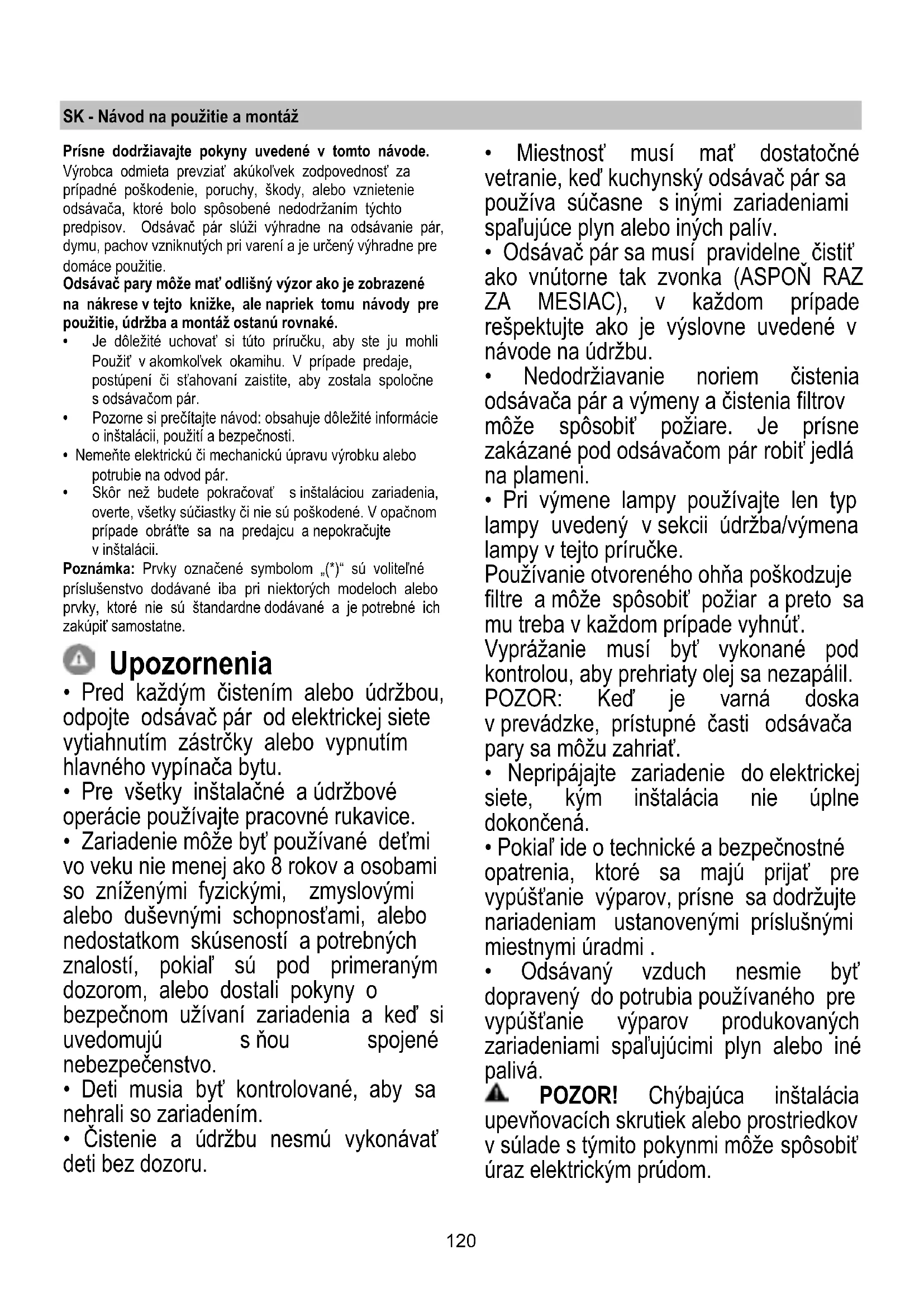 - Odsávaný vzduch nesmie byť dopravený do potrubia používaného pre vypúšťanie výparov produkovaných zariadeniami spaľujúcimi plyn alebo iné palivá. POZOR! Chýbajúca inštalácia upevňovacích skrutiek alebo prostriedkov v súlade s týmito pokynmi môže spôsobiť úraz elektrickým prúdom.121