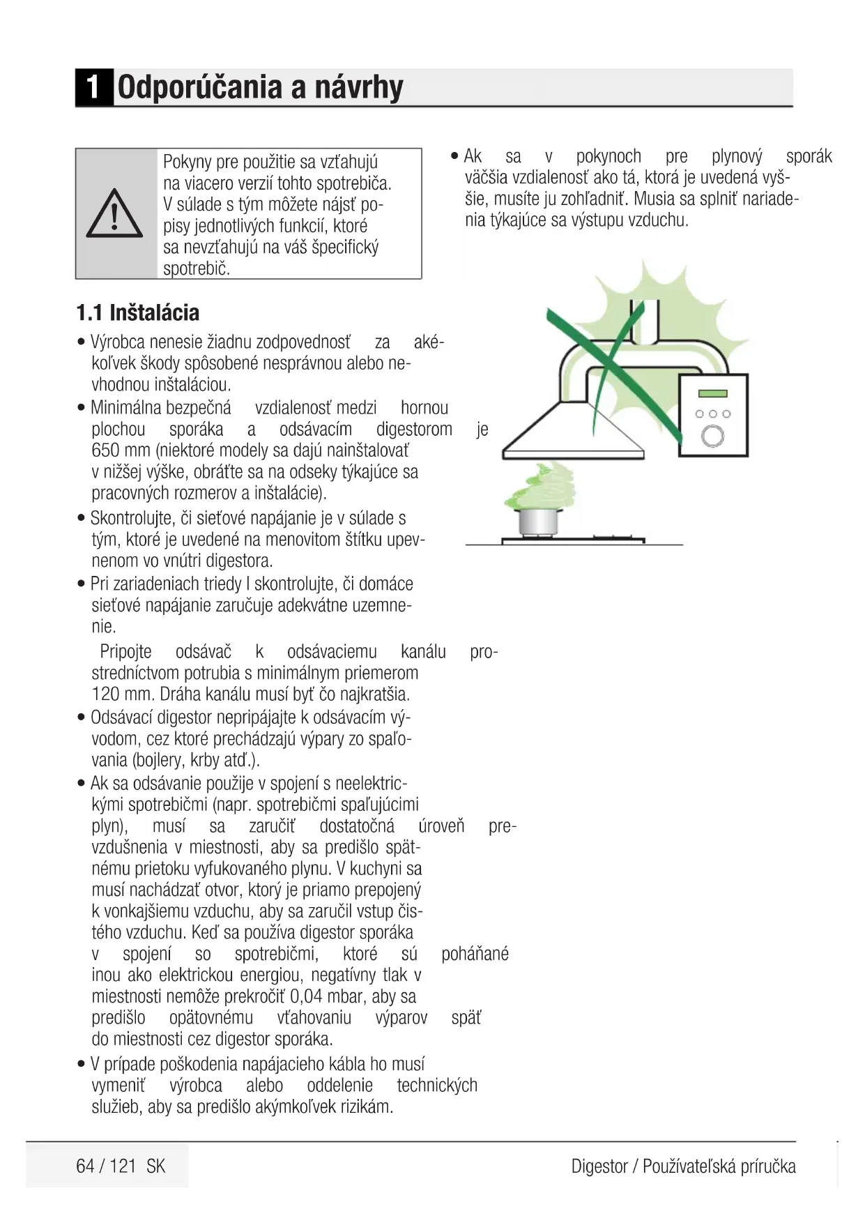 Výstrahypredzásahomelektrickým prúdom. Baliacemateriályproduktusavyrobili zrecyklovateľnýchmateriálovvsúlade snašiminárodnýminariadeniamina ochranu životného prostredia. Baliacimateriálnelikvidujtespoluskomunálnymaleboinýmodpadom.Zobertehonazbernémiesto baliacehomateriálu,ktorévytvorilimiestneúrady. Tentoproduktsavyrobilzapoužitianajnovšejtechnológievpodmienkachšetrnýchnaživotnéprostredie.63 / 121 SKDigestor / Používateľská príručka 1 Odporúčania a návrhy 64 1.1Inštalácia . . . . . . . . . . . . . . . . . . . . . . . . . .64