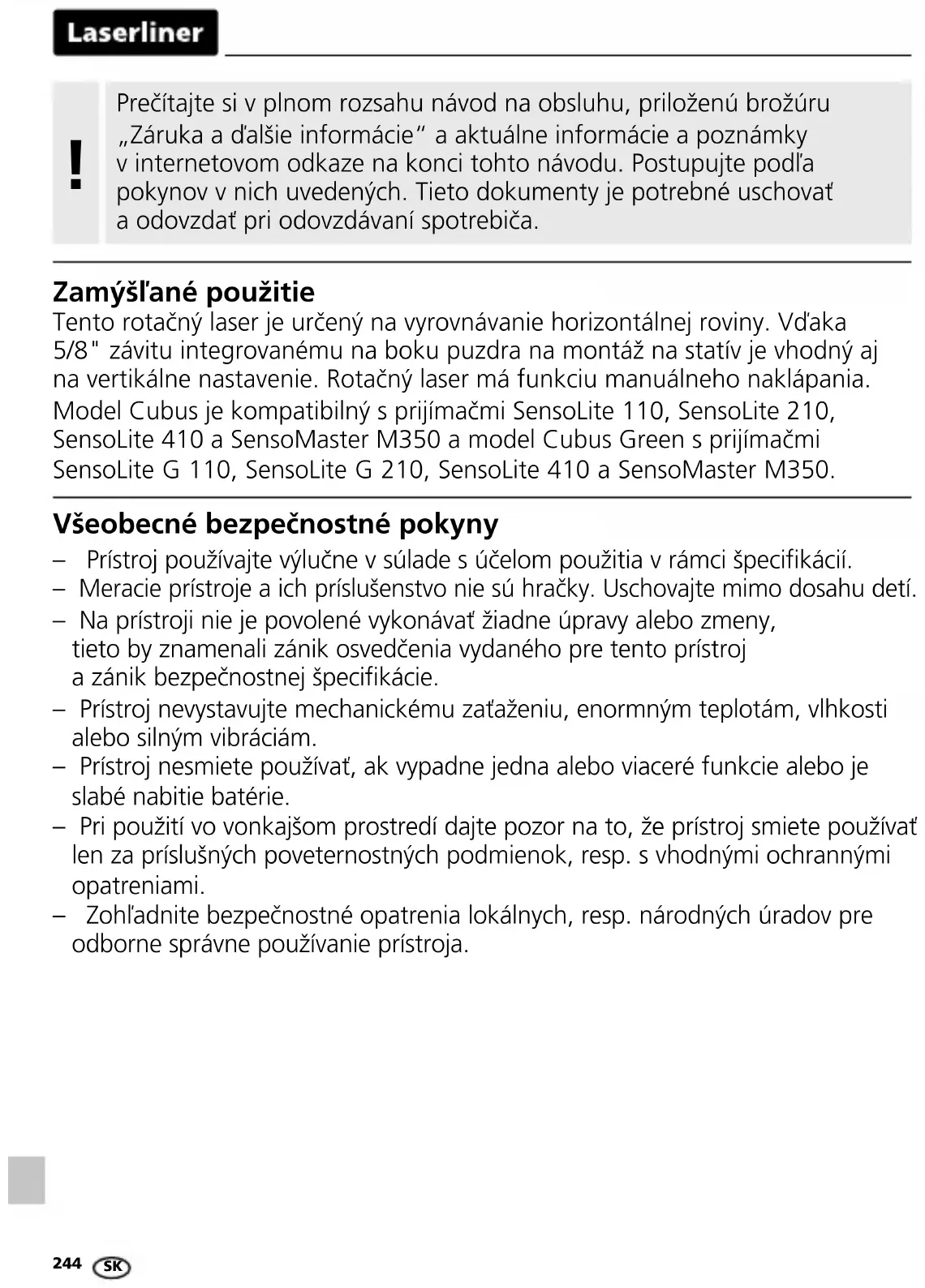 – Prístroj používajte výlučne v súlade s účelom použitia v rámci špecikácií. – Meracie prístroje a ich príslušenstvo nie sú hračky. Uschovajte mimo dosahu detí. – Na prístroji nie je povolené vykonávať žiadne úpravy alebo zmeny, tieto by znamenali zánik osvedčenia vydaného pre tento prístroj a zánik bezpečnostnej špecikácie. – Prístroj nevystavujte mechanickému zaťaženiu, enormným teplotám, vlhkosti alebo silným vibráciám. – Prístroj nesmiete používať, ak vypadne jedna alebo viaceré funkcie alebo je slabé nabitie batérie. – Pri použití vo vonkajšom prostredí dajte pozor na to, že prístroj smiete používať len za príslušných poveternostných podmienok, resp. s vhodnými ochrannými opatreniami. – Zohľadnite bezpečnostné opatrenia lokálnych, resp. národných úradov pre odborne správne používanie prístroja. Všeobecné bezpečnostné pokyny Zamýšľané použitie Tento rotačný laser je určený na vyrovnávanie horizontálnej roviny. Vďaka 5/8" závitu integrovanému na boku puzdra na montáž na statív je vhodný aj na vertikálne nastavenie. Rotačný laser má funkciu manuálneho naklápania. Model Cubus je kompatibilný s prijímačmi SensoLite 110, SensoLite 210, SensoLite 410 a SensoMaster M350 a model Cubus Green s prijímačmi SensoLite G 110, SensoLite G 210, SensoLite 410 a SensoMaster M350. Prečítajte si v plnom rozsahu návod na obsluhu, priloženú brožúru „Záruka a ďalšie informácie“ a aktuálne informácie a poznámky v internetovom odkaze na konci tohto návodu. Postupujte podľa pokynov v nich uvedených. Tieto dokumenty je potrebné uschovať a odovzdať pri odovzdávaní spotrebiča. !Cubus / Cubus Green