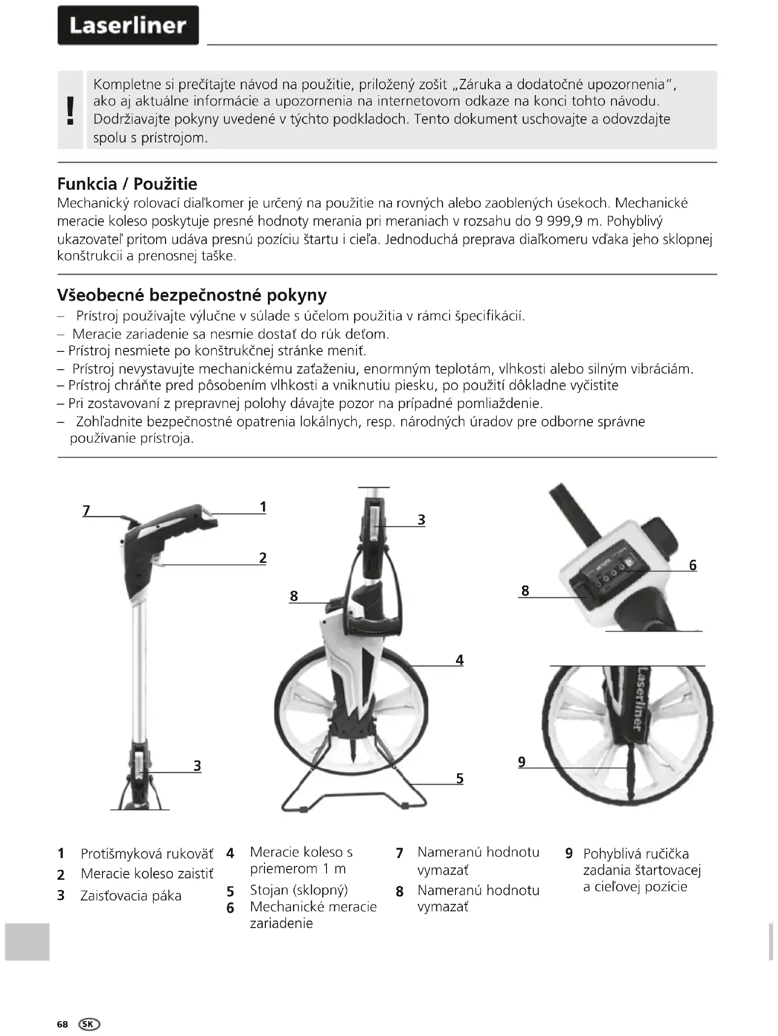 Funkcia / Použitie Mechanický rolovací diaľkomer je určený na použitie na rovných alebo zaoblených úsekoch. Mechanické meracie koleso poskytuje presné hodnoty merania pri meraniach v rozsahu do 9999,9 m. Pohyblivý ukazovateľ pritom udáva presnú pozíciu štartu i cieľa. Jednoduchá preprava diaľkomeru vďaka jeho sklopnej konštrukcii a prenosnej taške. Všeobecné bezpečnostné pokyny – Prístroj používajte výlučne v súlade s účelom použitia v rámci špecikácií. – Meracie zariadenie sa nesmie dostať do rúk deťom. – Prístroj nesmiete po konštrukčnej stránke meniť. – Prístroj nevystavujte mechanickému zaťaženiu, enormným teplotám, vlhkosti alebo silným vibráciám. – Prístroj chráňte pred pôsobením vlhkosti a vniknutiu piesku, po použití dôkladne vyčistite – Pri zostavovaní z prepravnej polohy dávajte pozor na prípadné pomliaždenie. – Zohľadnite bezpečnostné opatrenia lokálnych, resp. národných úradov pre odborne správne používanie prístroja.