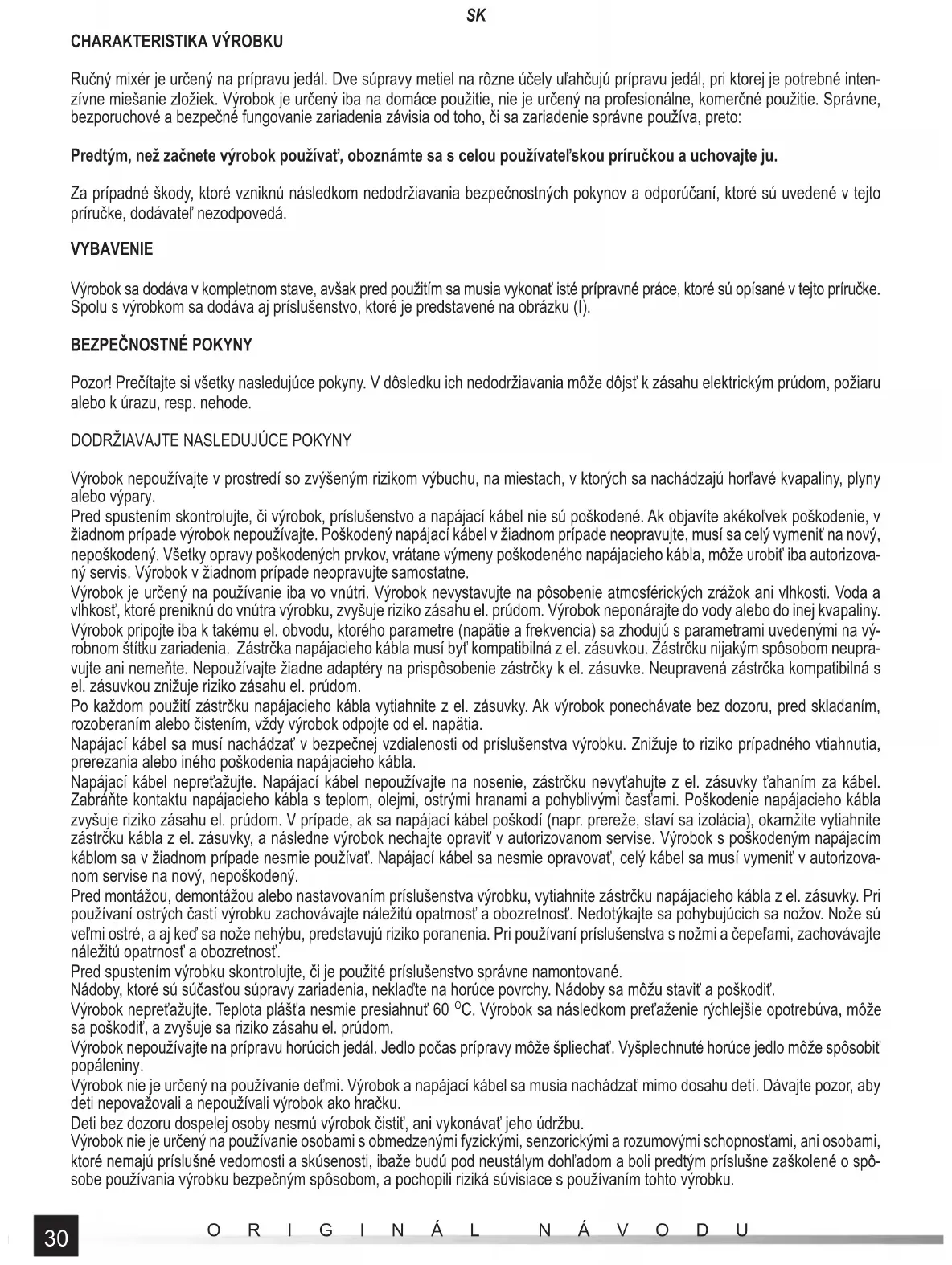 Ručný mixér je určený na prípravu jedál. Dve súpravy metiel na rôzne účely uľahčujú prípravu jedál, pri ktorej je potrebné inten- zívne miešanie zložiek. Výrobok je určený iba na domáce použitie, nie je určený na profesionálne, komerčné použitie. Správne, bezporuchové a bezpečné fungovanie zariadenia závisia od toho, či sa zariadenie správne používa, preto: Predtým, než začnete výrobok používať, oboznámte sa s celou používateľskou príručkou a uchovajte ju. Za prípadné škody, ktoré vzniknú následkom nedodržiavania bezpečnostných pokynov a odporúčaní, ktoré sú uvedené v tejto príručke, dodávateľ nezodpovedá. VYBAVENIE Výrobok sa dodáva v kompletnom stave, avšak pred použitím sa musia vykonať isté prípravné práce, ktoré sú opísané v tejto príručke. Spolu s výrobkom sa dodáva aj príslušenstvo, ktoré je predstavené na obrázku (I).
