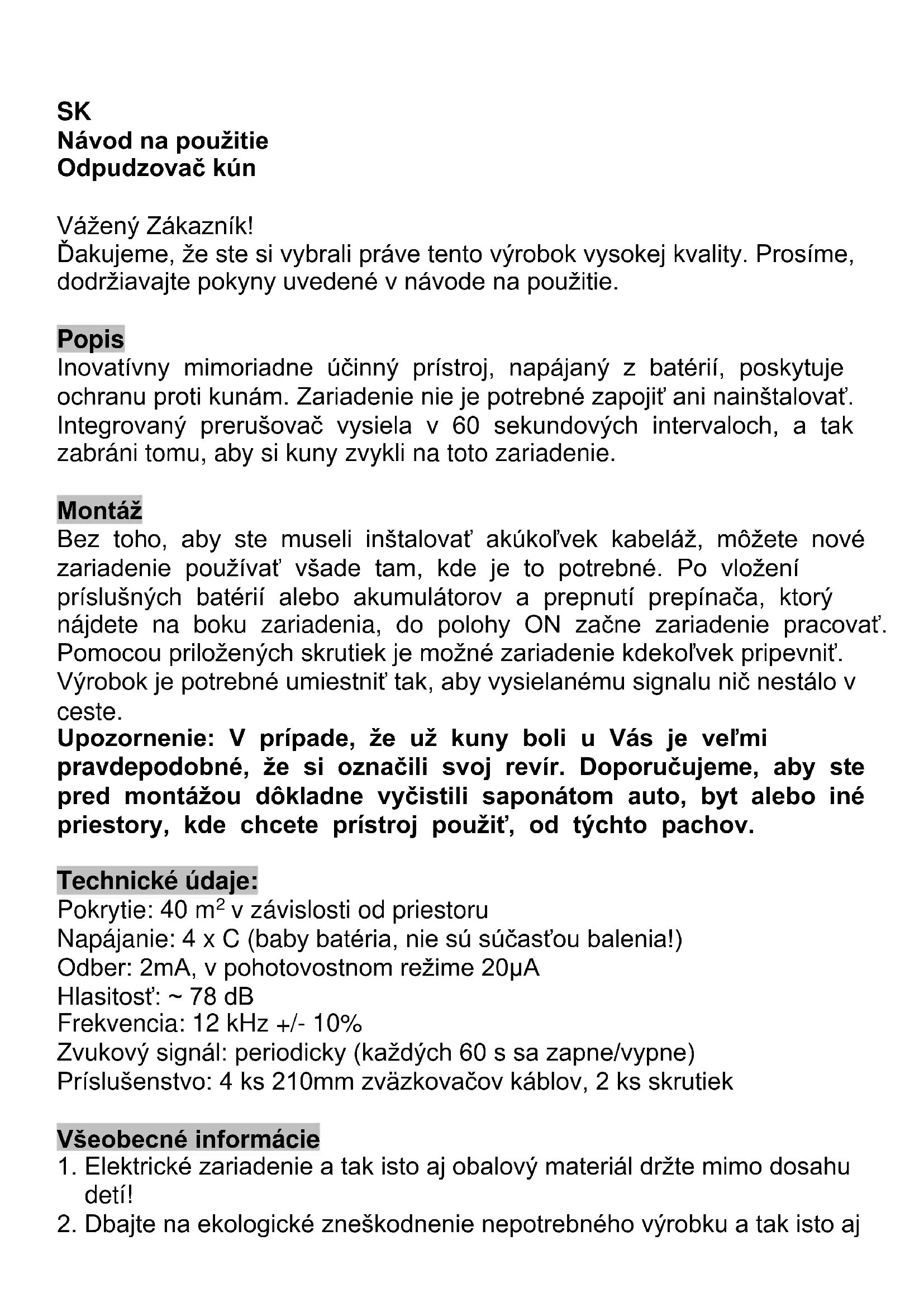 technických údajov alebo zmene vonkajšieho vzhľadu výrobku ! Bezpečnostné pokyny Dôležité! Za škody spôsobené nedodržaním návodu na použitie nepreberá zodpovednosť výrobca a ani dovozca! Na poškodenie vzniknuté nesprávnym používaním sa nevzťahuje záruka. - Výrobok používajte pripojený na predpísané napätie. - V prípade, že je potrebné výrobok opravovať, v každom prípade používajte iba originálne náhradné diely, preto aby ste predišli prípadným vážnym škodám. - Zkontrolujte, prívodný kábel výrobku, v prípade že je poškodený nepoužívajte ho! Obráťte sa na servis prípadne na predajcu, ktorý Vám pomôžu zaobstarať originálny nepoškodený napájací kábel. - Opravy, údržbu napr. výmenu poistiek a pod., môže vykonávať iba odborník s potrebným vzdelaním a skúsenosťami. - Pozor! Za škody spôsobené nesprávnym pripojením alebo prevádzkou výrobca a ani dovozca nepreberá zodpovednosť! - Pred vložením výrobku do sieťovej zásuvky sa ubezpečte o tom, že výrobok je kompaktibilný so sieťovým napätím. - Používanie tohto výrobku môže znamenať nebezpečenstvo pre také osoby, ktoré sú fyzicky, duševne alebo mentálne hendikepované, alebo pre deti, prípadne pre tých, ktorý nemajú skúsenosti a dostatočné vedomosti ohľadom používania tohto výrobku. Výrobok používajte iba v prítomnosti osôb, ktoré sú spôsobilé zodpovedať za ich bezpečnosť. - Výrobok nie je hračka, preto ho držte mimo dosah detí, respektíve nenechajte deti bez dohľadu!