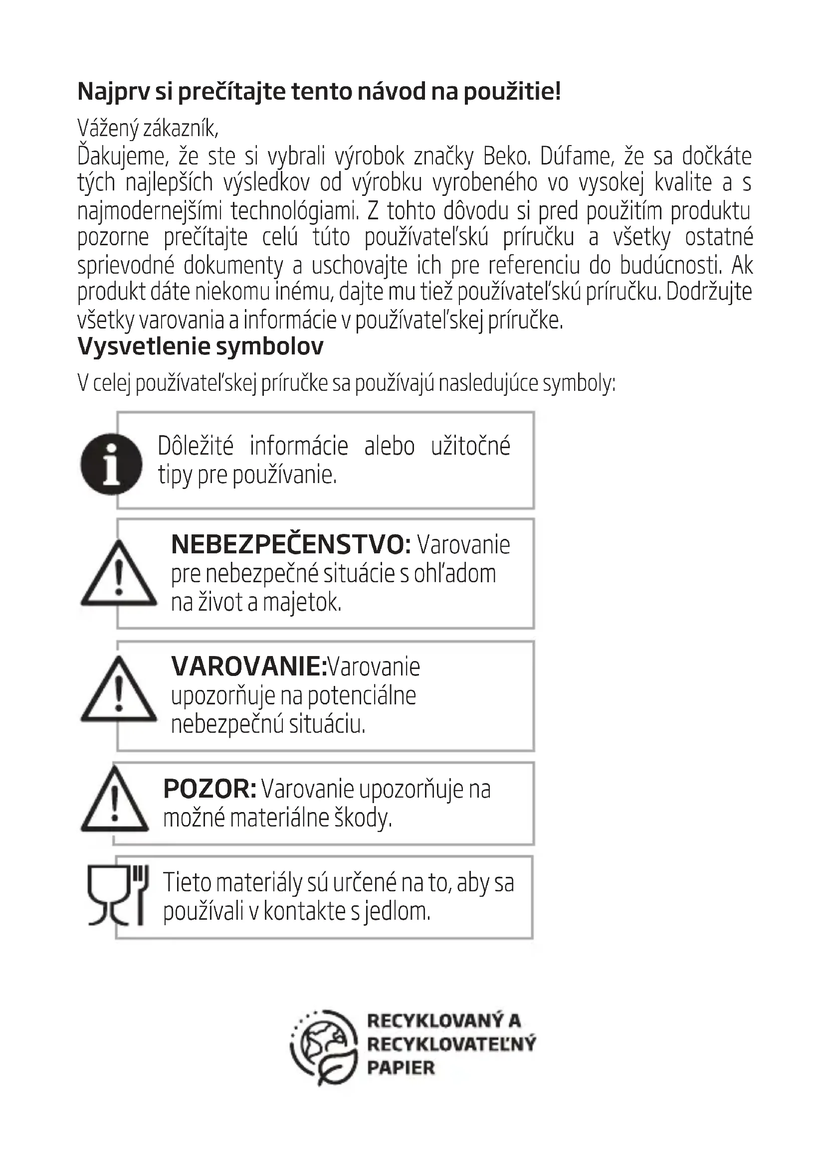 Plne automatický kávovar Beko je určený na použitie v domácnostiach a podobných prostrediach, napríklad v kuchynkách pre zamestnancov, obcho- doch, kanceláriách a podobných oblastiach alebo zákazníkmi v ubytovaní typu bed & breakfast, hoteloch, moteloch a iných typoch ubytovania. Tento kávo- var nie je určený na komerčné použitie. Stroj je určený iba na prípravu kávy a ohrievanie mlieka a vody. Akékoľvek iné použitie, než je uvedené predtým, je považované za nesprávne použitie. Riziká vyplývajúce z nesprávneho použitia! Ak nie je použitý na určený účel alebo ak sa používa akýmkoľvek iným spôso- bom, kávovar môže byť alebo sa môže stať zdrojom nebezpečenstva.1 Dôležité pokyny pre bezpečnosť a životné prostredie 265 / SK Plne automatický kávovar/Návod na použitie