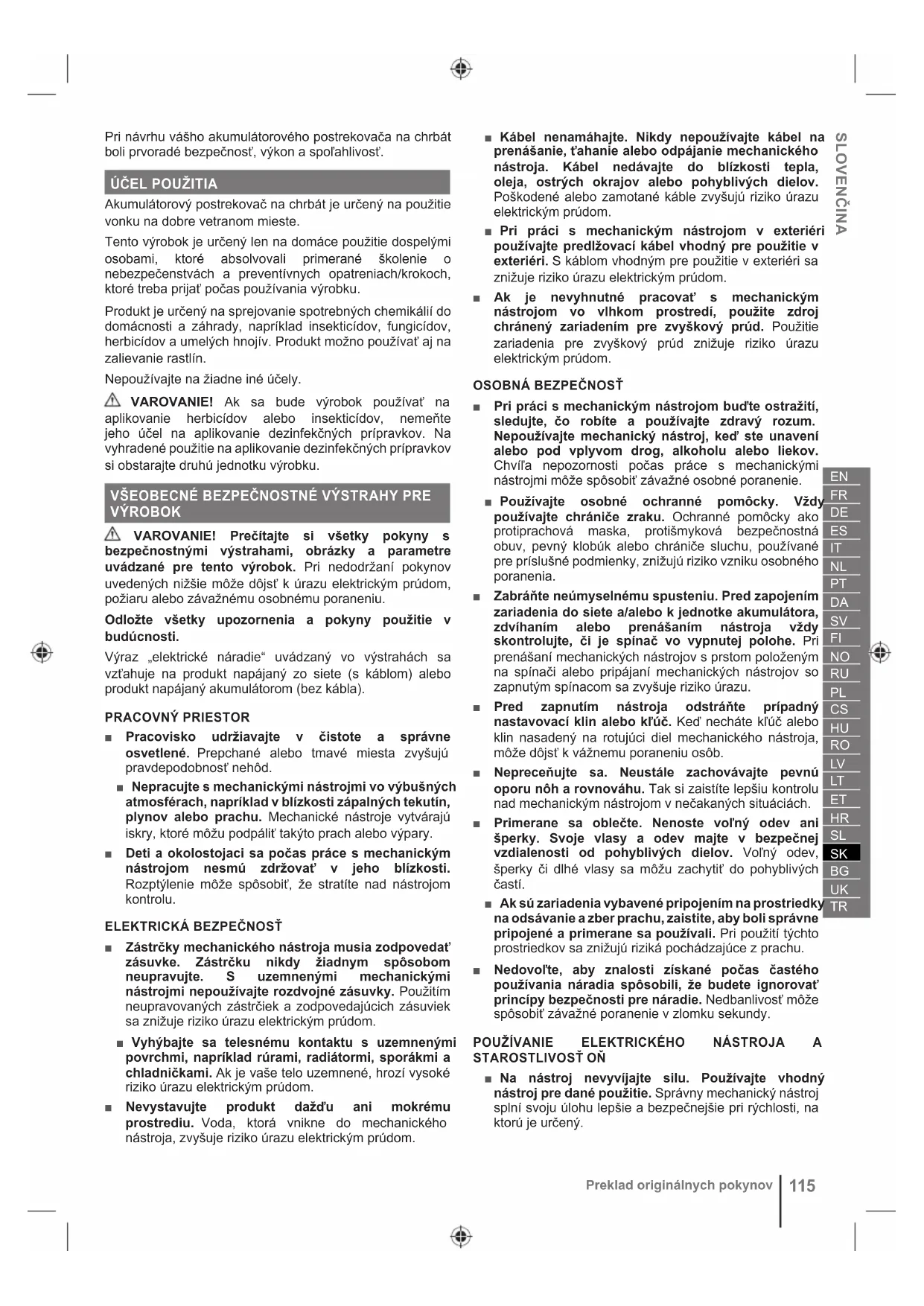 ■ Pozorne si prečítajte pokyny. Oboznámte sa s ovládacími prvkami a správnou obsluhou produktu. ■ Nikdy nedovoľte deťom, osobám so zníženými fyzickými, duševnými alebo zmyslovými schopnosťami alebo s nedostatočnými skúsenosťami a znalosťami alebo osobám, ktoré nie sú oboznámené s týmto návodom, používať produkt. ■ Tento výrobok sa smie používať len v spojení s produktmi na ochranu rastlín schválenými miestnymi/ štátnymi regulačnými orgánmi pre produkty na ochranu rastlín, ktoré sú určené pre postrekovače na chrbát. ■ Pokiaľ ide o osobné ochranné prostriedky, dodržiavajte pokyny výrobcu týkajúce sa chemikálií. ■ Aby ste znížili riziko nehôd a poškodení výrobku, nikdy nepoužívajte s: ● horľavými kvapalinami ● viskóznymi alebo lepkavými kvapalinami ● žieravými alebo korozívnymi chemikáliami ● horúci kvapalinami s teplou vyššou ako 50 °C ■ Nesprejujte v priestoroch, kde sú iskry, plamene či iný zápalný zdroj. ■ Nikdy nepracujte so zariadením, ktoré má poškodené ochranné vodidlá alebo kryty alebo nemá nasadené bezpečnostné zariadenia. Nikdy nepoužívajte neúplný či upravený výrobok. Používanie chybného, neúplného či upraveného výrobku by mohlo mať za následok nebezpečnú situáciu. ■ Nesprejujte v smere ľudí alebo zvierat. Podľa možností nesprejujte vo veterných dňoch. Sprejovacie materiály sa môžu neúmyselne rozprášiť na rastliny alebo predmety, ktoré ste nechceli nasprejovať. Vždy sprejujte po vetre. ■ V prípade nehody alebo poškodenia okamžite výrobok vypnite a vyberte z neho súpravu batérií. Nepoužívajte výrobok znovu, pokiaľ nebude úplne skontrolovaný autorizovaným servisným strediskom. ■ Ak dýza nestrieka postrekový materiál alebo sa objem postreku znížil, mohlo dôjsť k zablokovaniu hadice a systému tyčky. Čistou vodou prepláchnite všetky diely hadice a systému tyčky (striekacia pištoľ, filter v nádrži, postrekovacia tyčka, hadica). Nikdy neprefukujte trysky alebo iné súčasti ústami.SLOVENČINA