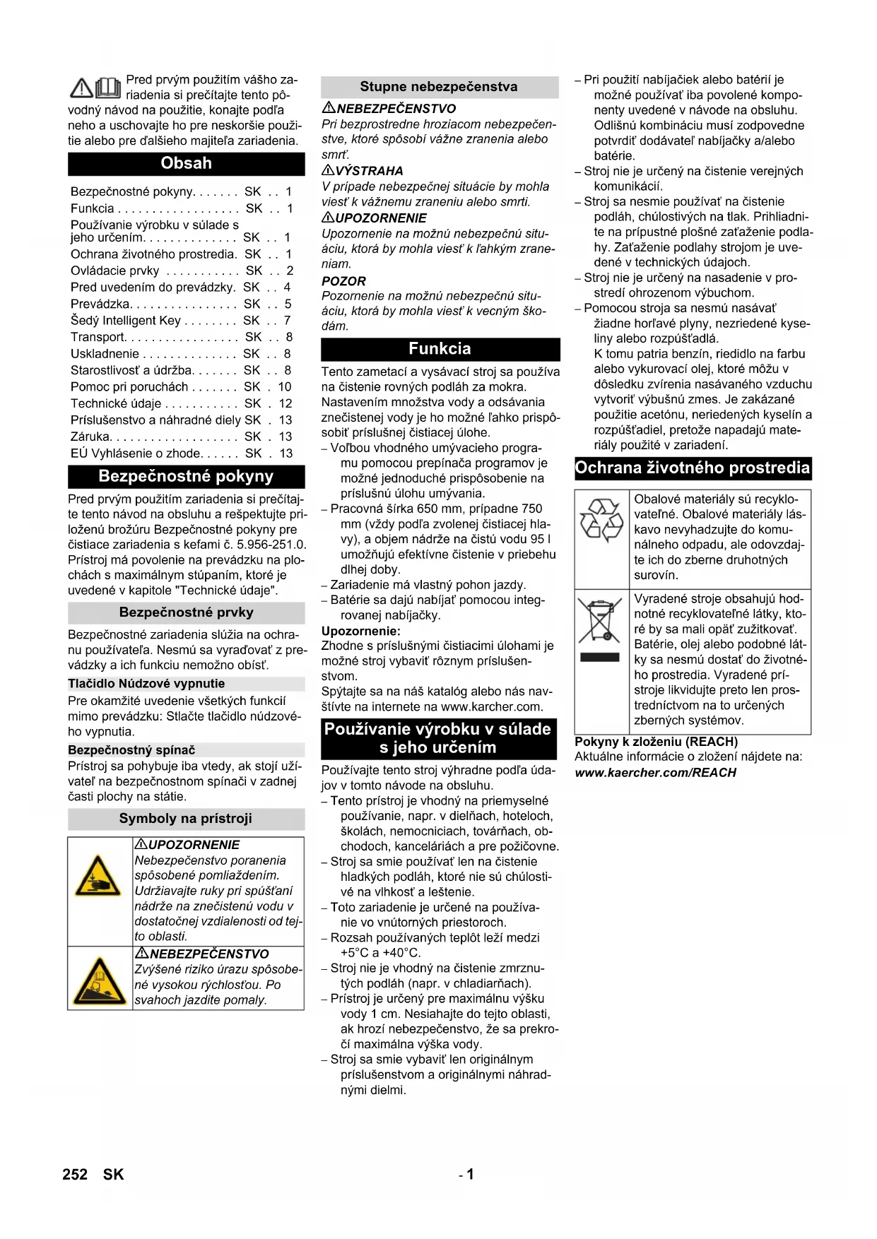 Chairman of the Board of Management Director Regulatory Affairs & Certification 251RO- 1 Pred prvým použitím vášho za- riadenia si prečítajte tento pô- vodný návod na použitie, konajte podľa neho a uschovajte ho pre neskoršie použi- tie alebo pre ďalšieho majiteľa zariadenia. Pred prvým použitím zariadenia si prečítaj- te tento návod na obsluhu a rešpektujte pri- loženú brožúru Bezpečnostné pokyny pre čistiace zariadenia s kefami č. 5.956-251.0. Prístroj má povolenie na prevádzku na plo- chách s maximálnym stúpaním, ktoré je uvedené v kapitole "Technické údaje". Bezpečnostné zariadenia slúžia na ochra- nu používateľa. Nesmú sa vyraďovať z pre- vádzky a ich funkciu nemožno obísť. Pre okamžité uvedenie všetkých funkcií mimo prevádzku: Stlačte tlačidlo núdzové- ho vypnutia. Prístroj sa pohybuje iba vtedy, ak stojí uží- vateľ na bezpečnostnom spínači v zadnej časti plochy na státie. NEBEZPEČENSTVO Pri bezprostredne hroziacom nebezpečen- stve, ktoré spôsobí vážne zranenia alebo smrť. 몇 VÝSTRAHA V prípade nebezpečnej situácie by mohla viesť k vážnemu zraneniu alebo smrti. 몇 UPOZORNENIE Upozornenie na možnú nebezpečnú situ- áciu, ktorá by mohla viesť k ľahkým zrane- niam. POZOR Pozornenie na možnú nebezpečnú situ- áciu, ktorá by mohla viesť k vecným ško- dám. Tento zametací a vysávací stroj sa používa na čistenie rovných podláh za mokra. Nastavením množstva vody a odsávania znečistenej vody je ho možné ľahko prispô- sobiť príslušnej čistiacej úlohe. – Voľbou vhodného umývacieho progra- mu pomocou prepínača programov je možné jednoduché prispôsobenie na príslušnú úlohu umývania. – Pracovná šírka 650 mm, prípadne 750 mm (vždy podľa zvolenej čistiacej hla- vy), a objem nádrže na čistú vodu 95 l umožňujú efektívne čistenie v priebehu dlhej doby. – Zariadenie má vlastný pohon jazdy. – Batérie sa dajú nabíjať pomocou integ- rovanej nabíjačky. Upozornenie: Zhodne s príslušnými čistiacimi úlohami je možné stroj vybaviť rôznym príslušen- stvom. Spýtajte sa na náš katalóg alebo nás nav- štívte na internete na www.karcher.com. Používajte tento stroj výhradne podľa úda- jov v tomto návode na obsluhu. – Tento prístroj je vhodný na priemyselné používanie, napr. v dielňach, hoteloch, školách, nemocniciach, továrňach, ob- chodoch, kanceláriách a pre požičovne. – Stroj sa smie používať len na čistenie hladkých podláh, ktoré nie sú chúlosti- vé na vlhkosť a leštenie. – Toto zariadenie je určené na používa- nie vo vnútorných priestoroch. – Rozsah používaných teplôt leží medzi +5°C a +40°C. – Stroj nie je vhodný na čistenie zmrznu- tých podláh (napr. v chladiarňach). – Prístroj je určený pre maximálnu výšku vody 1 cm. Nesiahajte do tejto oblasti, ak hrozí nebezpečenstvo, že sa prekro- čí maximálna výška vody. – Stroj sa smie vybaviť len originálnym príslušenstvom a originálnymi náhrad- nými dielmi. – Pri použití nabíjačiek alebo batérií je možné používať iba povolené kompo- nenty uvedené v návode na obsluhu. Odlišnú kombináciu musí zodpovedne potvrdiť dodávateľ nabíjačky a/alebo batérie. – Stroj nie je určený na čistenie verejných komunikácií. – Stroj sa nesmie používať na čistenie podláh, chúlostivých na tlak. Prihliadni- te na prípustné plošné zaťaženie podla- hy. Zaťaženie podlahy strojom je uve- dené v technických údajoch. – Stroj nie je určený na nasadenie v pro- stredí ohrozenom výbuchom. – Pomocou stroja sa nesmú nasávať žiadne horľavé plyny, nezriedené kyse- liny alebo rozpúšťadlá. K tomu patria benzín, riedidlo na farbu alebo vykurovací olej, ktoré môžu v dôsledku zvírenia nasávaného vzduchu vytvoriť výbušnú zmes. Je zakázané použitie acetónu, neriedených kyselín a rozpúšťadiel, pretože napadajú mate- riály použité v zariadení. Pokyny k zloženiu (REACH) Aktuálne informácie o zložení nájdete na: www.kaercher.com/REACH Obsah Bezpečnostné pokyny. . . . . . . SK . . 1 Funkcia . . . . . . . . . . . . . . . . . . SK . . 1 Používanie výrobku v súlade s jeho určením. . . . . . . . . . . . . . SK . . 1 Ochrana životného prostredia. SK . . 1 Ovládacie prvky . . . . . . . . . . . SK . . 2 Pred uvedením do prevádzky. SK . . 4 Prevádzka. . . . . . . . . . . . . . . . SK . . 5 Šedý Intelligent Key . . . . . . . . SK . . 7 Transport. . . . . . . . . . . . . . . . . SK . . 8 Uskladnenie . . . . . . . . . . . . . . SK . . 8 Starostlivosť a údržba. . . . . . . SK . . 8 Pomoc pri poruchách . . . . . . . SK . 10 Technické údaje . . . . . . . . . . . SK . 12 Príslušenstvo a náhradné diely SK . 13 Záruka. . . . . . . . . . . . . . . . . . . SK . 13 EÚ Vyhlásenie o zhode. . . . . . SK . 13 Bezpečnostné pokyny Bezpečnostné prvky Tlačidlo Núdzové vypnutie Bezpečnostný spínač Symboly na prístroji 몇 UPOZORNENIE Nebezpečenstvo poranenia spôsobené pomliaždením. Udržiavajte ruky pri spúšťaní nádrže na znečistenú vodu v dostatočnej vzdialenosti od tej- to oblasti. NEBEZPEČENSTVO Zvýšené riziko úrazu spôsobe- né vysokou rýchlosťou. Po svahoch jazdite pomaly. Stupne nebezpečenstva Funkcia Používanie výrobku v súlade s jeho určením Ochrana životného prostredia Obalové materiály sú recyklo- vateľné. Obalové materiály lás- kavo nevyhadzujte do komu- nálneho odpadu, ale odovzdaj- te ich do zberne druhotných surovín. Vyradené stroje obsahujú hod- notné recyklovateľné látky, kto- ré by sa mali opäť zužitkovať. Batérie, olej alebo podobné lát- ky sa nesmú dostať do životné- ho prostredia. Vyradené prí- stroje likvidujte preto len pros- tredníctvom na to určených zberných systémov. 252 SK- 2 1 Volant 2 Systém plnenia 3 Uzáver, nádrž na znečisten