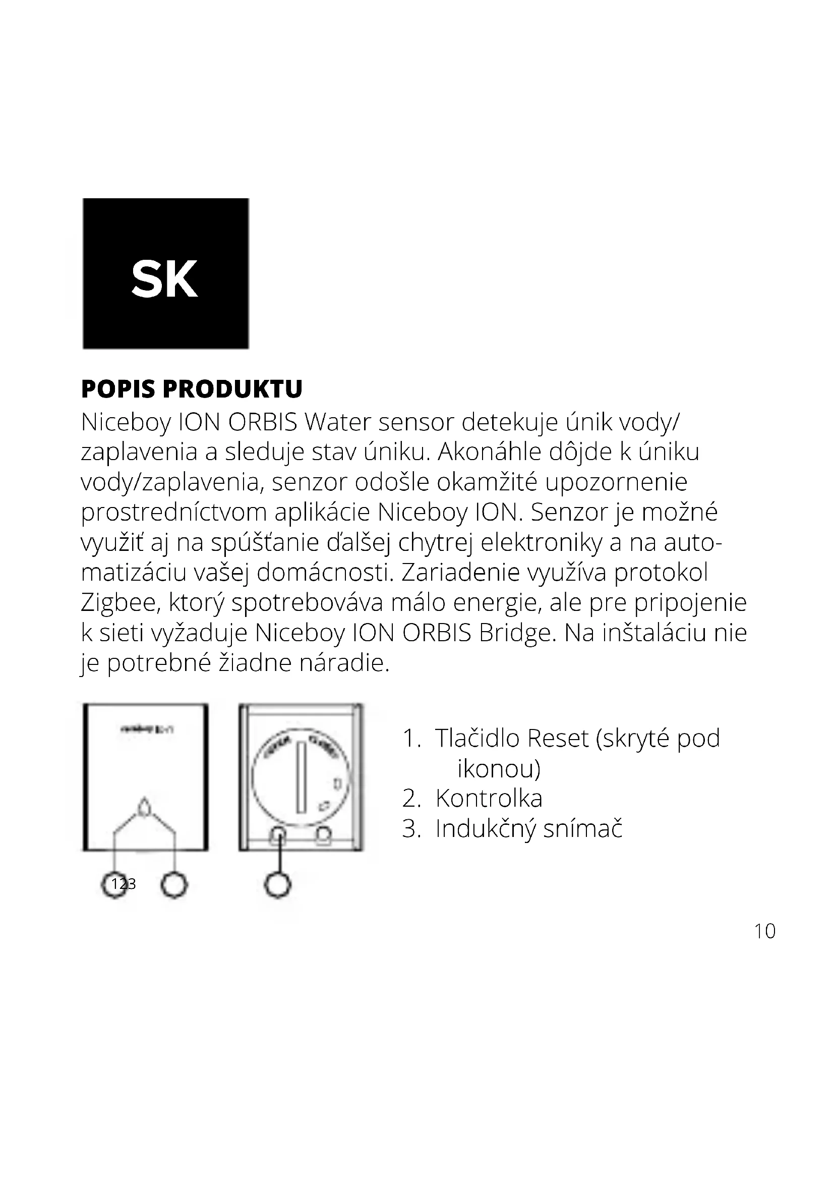POPIS PRODUKTU Niceboy ION ORBIS Water sensor detekuje únik vody/ zaplavenia asleduje stav úniku. Akonáhle dôjde kúniku vody/zaplavenia, senzor odošle okamžité upozornenie prostredníctvom aplikácie Niceboy ION. Senzor je možné využiť aj na spúšťanie ďalšej chytrej elektroniky ana auto- matizáciu vašej domácnosti. Zariadenie využíva protokol Zigbee, ktorý spotrebováva málo energie, ale pre pripojenie ksieti vyžaduje Niceboy ION ORBIS Bridge. Na inštaláciu nie je potrebné žiadne náradie.