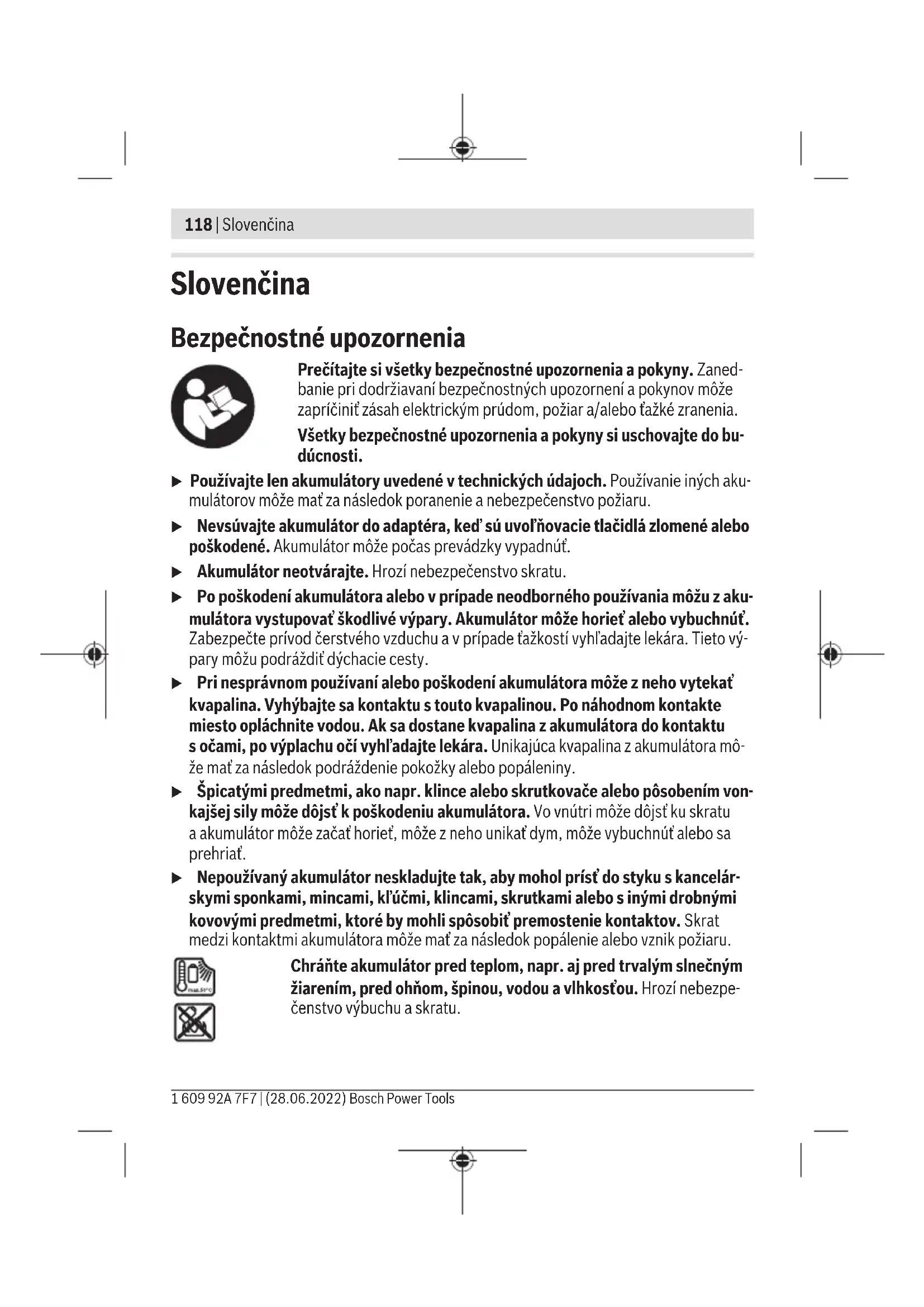 GBA 18V... ProCORE18V... Odporúčané nabíjačky GAL 18... GAX 18... GAL 36... A) Skutočný výstupný prúd závisí od pripojeného USB zariadenia. B) Skutočný výstupný prúd závisí od nastavenia vyhrievaného pracovného oblečenia. C) Obmedzený výkon pri teplotách <0°C. D) S týmto adaptérom akumulátora sa nesmú používať nasledujúce akumulátory: – 1607A350BG – 1607A350MA – 1607A350MR – 1607A350M0 – 2607336815 – 2607337069 – 1607A350AN – 1607A350ET Akumulátor Vkladanie avyberanie akumulátora (pozriobrázkyA1–A2) u Pri vkladaní akumulátora nepoužívajte násilie. Akumulátor je skonštruovaný tak, aby sa dal vsunúť do adaptéra len vsprávnej polohe. Na vloženie akumulátora (6) zasuňte akumulátor až na doraz do akumulátorového adap- téra (1). Ak chcete akumulátor (6) vybrať, stlačte uvoľňovacie tlačidlá (7) na akumulátore avy- tiahnite ho zadaptéra (1). 1 609 92A 7F7 | (28.06.2022) Bosch Power ToolsSlovenčina | 121 Indikácia stavu nabitia akumulátora Zelené LED kontrolky indikácie stavu nabitia akumulátora zobrazujú stav nabitia akumu- látora. Zbezpečnostných dôvodov je zisťovanie stavu nabitia možné len vtedy, keď je elektrické náradie zastavené. Stlačte tlačidlo pre indikáciu stavu nabitia alebo , aby sa zobrazil stav nabitia. Je to možné aj vtedy, keď je akumulátor vybratý. Ak po stlačení tlačidla pre indikáciu stavu nabitia nesvieti žiadna LED kontrolka, akumulá- tor je chybný amusí sa vymeniť. Typ akumulátora GBA 18V... LED Kapacita Trvalé svietenie 3× zelená 60–100% Trvalé svietenie 2× zelená 30–60% Trvalé svietenie 1× zelená 5–30% Blikanie 1× zelená 0–5% Typ akumulátora ProCORE18V... LED Kapacita Trvalé svietenie 5× zelená 80–100% Trvalé svietenie 4× zelená 60–80% Trvalé svietenie 3× zelená 40–60% Trvalé svietenie 2× zelená 20–40% Trvalé svietenie 1× zelená 5–20% Blikanie 1× zelená 0–5% Pokyny na optimálne zaobchádzanie sakumulátorom Chráňte akumulátor pred vlhkosťou avodou. Akumulátor skladujte iba pri teplote vrozsahu od –20°C do 50°C. Nenechávajte akumu- látor napríklad vlete položený vautomobile. Bosch Power Tools 1 609 92A 7F7 | (28.06.2022)122 | Slovenčina Príležitostne vyčistite vetracie štrbiny akumulátora čistým, mäkkým asuchým štetcom. Výrazne skrátená doba prevádzky akumulátora po nabití signalizuje, že akumulátor je opotrebovaný atreba ho vymeniť za nový. Dodržiavajte upozornenia týkajúce sa likvidácie. Prevádzka Nabíjanie externých USB zariadení (pozri obrázokB) Pomocou USB prípojok na akumulátorovom adaptéri(1) môžete predĺžiť čas chodu rôz- nych USB zariadení napájaných zakumulátora, ako je napríklad mobilný telefón, MP3 prehrávač alebo PC tablet. u Uistite sa, že vaše externé USB zariadenie sUSBprípojkou sa môže nabíjať na akumulátorovom adaptéri. Venujte pritom pozornosť údajom uvedeným včasti Technické údaje. – Zasuňte nabíjací kábel vášho USB zariadenia do USB zásuvky(2) na akumulátorovom adaptéri(1). – Stlačte tlačidlo vypínača(5), aby ste aktivovali akumulátorový adaptér. Tlačidlo vypínača(5) svieti. Keď nie je pripojený žiadny nabíjací kábel, po 30sekundách sa USB prípojky auto- maticky deaktivujú. Tlačidlo vypínača(5) zhasne. Kvôli úspore energie sa po ukončení nabíjania USB prípojky automaticky deaktivujú. Pripojenie vyhrievacieho článku (pozri obrázokB) – Zasuňte pripájaciu zástrčku vyhrievacieho článku do zásuvky(3) na akumulátorovom adaptéri(1). – Stlačte tlačidlo vypínača(5), aby ste aktivovali akumulátorový adaptér. Tlačidlo vypínača(5) svieti. Urobte nastavenie na vyhrievanom pracovnom oblečení. Dodržujte návod na obsluhu vyhrievaného pracovného oblečenia. – Zasuňte akumulátorový adaptér(1) do určeného vrecka na odeve alebo akumulátoro- vý adaptér zaveste pomocou spony(4) na opasok. Odstránenie porúch Problém Pomoc Externé USB zariadenie sa nedá nabíjať na USB prípojke. Nabite akumulátor 1 609 92A 7F7 | (28.06.2022) Bosch Power ToolsSlovenčina | 123 Problém Pomoc Pripojte nabíjací kábel externého USB zariadenia doUSB zásuvky(2) na akumulátorovom adaptéri(1). Zapnite akumulátorový adaptér(1) tlačidlom vypínača(5). Externé USBzariadenie nemožno nabíjať svyužitím USBprípojky na akumulátorovom adaptéri (venujte pozornosť údajom uvedeným včasti Technické úda-