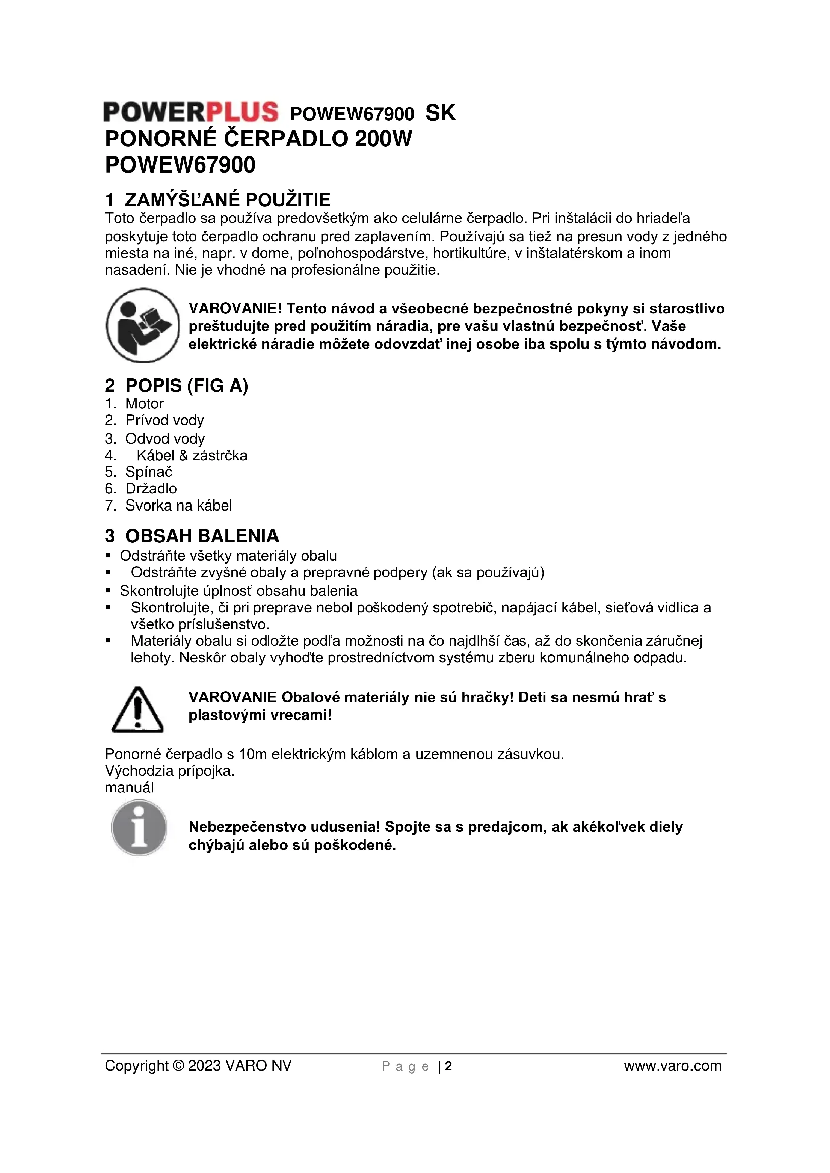 - Pomocou vhodných opatrení zabráňte, aby mali k zariadeniu prístup deti. Konzistencia Vaše ponorné čerpadlo je určené na cirkuláciu vody s maximálnou teplotou 35 °C. Toto čerpadlo sa nemôže používať pre iné kvapaliny, hlavne nie pre motorové palivá, čistiace kvapaliny a iné chemické produkty!POWEW67900 SK Copyright © 2023 VARO NV P a g e | 4 www.varo.com