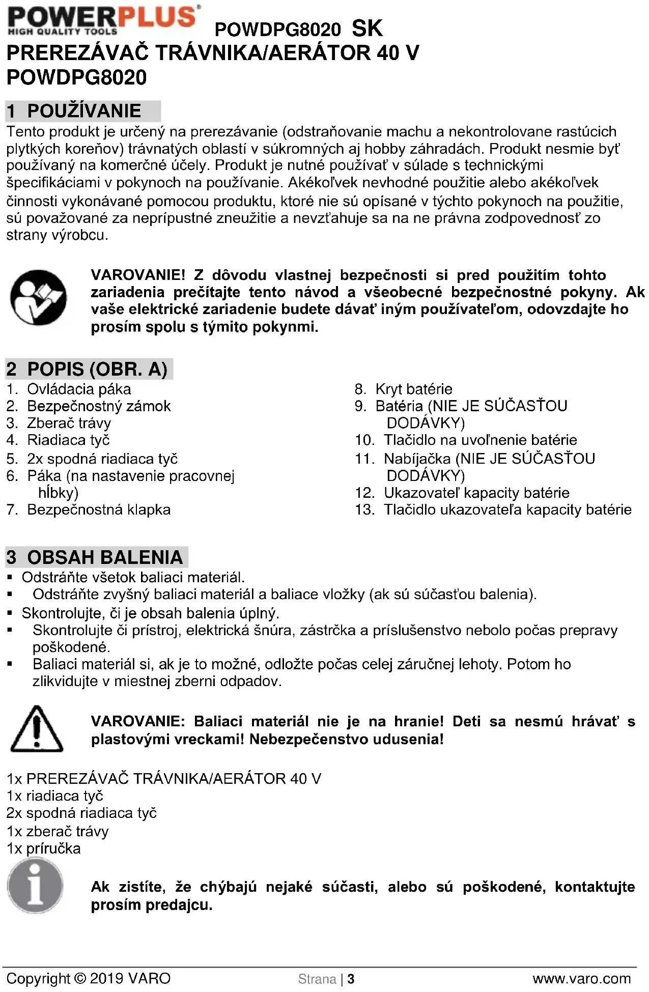 - Baliaci materiál si, ak je to možné, odložte počas celej záručnej lehoty. Potom ho zlikvidujte v miestnej zberni odpadov. VAROVANIE: Baliaci materiál nie je na hranie! Deti sa nesmú hrávať s plastovými vreckami! Nebezpečenstvo udusenia! 1x PREREZÁVAČ TRÁVNIKA/AERÁTOR 40 V 1x riadiaca tyč 2x spodná riadiaca tyč 1x zberač trávy 1x príručka Ak zistíte, že chýbajú nejaké súčasti, alebo sú poškodené, kontaktujte prosím predajcu.POWDPG8020 SK Copyright © 2019 VARO Strana | 4 www.varo.com 4 SYMBOLY V tomto návode a/alebo na stroji sa používajú nasledujúce symboly: