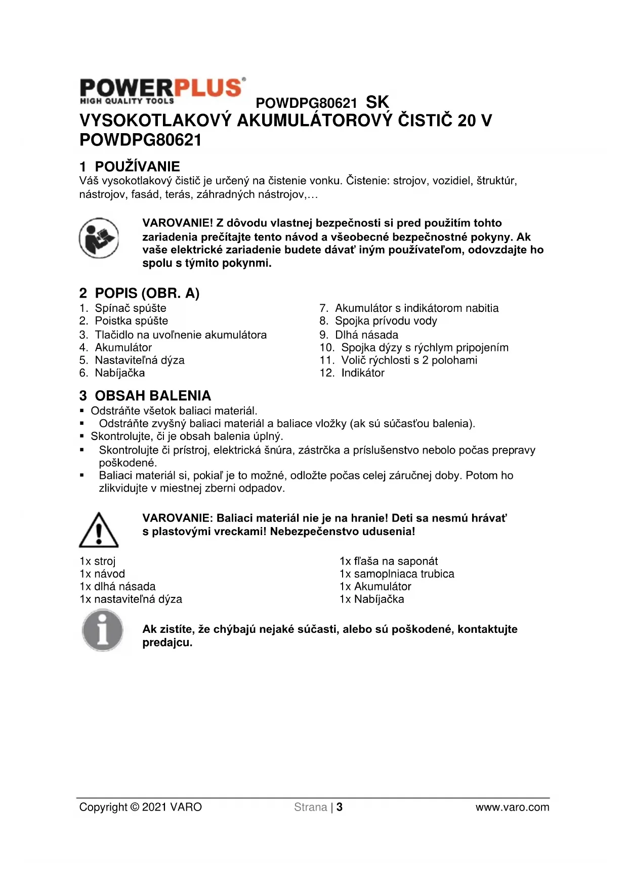 - Baliaci materiál si, pokiaľ je to možné, odložte počas celej záručnej doby. Potom ho zlikvidujte v miestnej zberni odpadov. VAROVANIE: Baliaci materiál nie je na hranie! Deti sa nesmú hrávať s plastovými vreckami! Nebezpečenstvo udusenia! 1x stroj 1x návod 1x dlhá násada 1x nastaviteľná dýza 1x fľaša na saponát 1x samoplniaca trubica 1x Akumulátor 1x Nabíjačka Ak zistíte, že chýbajú nejaké súčasti, alebo sú poškodené, kontaktujte predajcu.POWDPG80621 SK Copyright © 2021 VARO Strana | 4 www.varo.com 4 SYMBOLY V tomto návode a/alebo na stroji sa používajú nasledujúce symboly:
