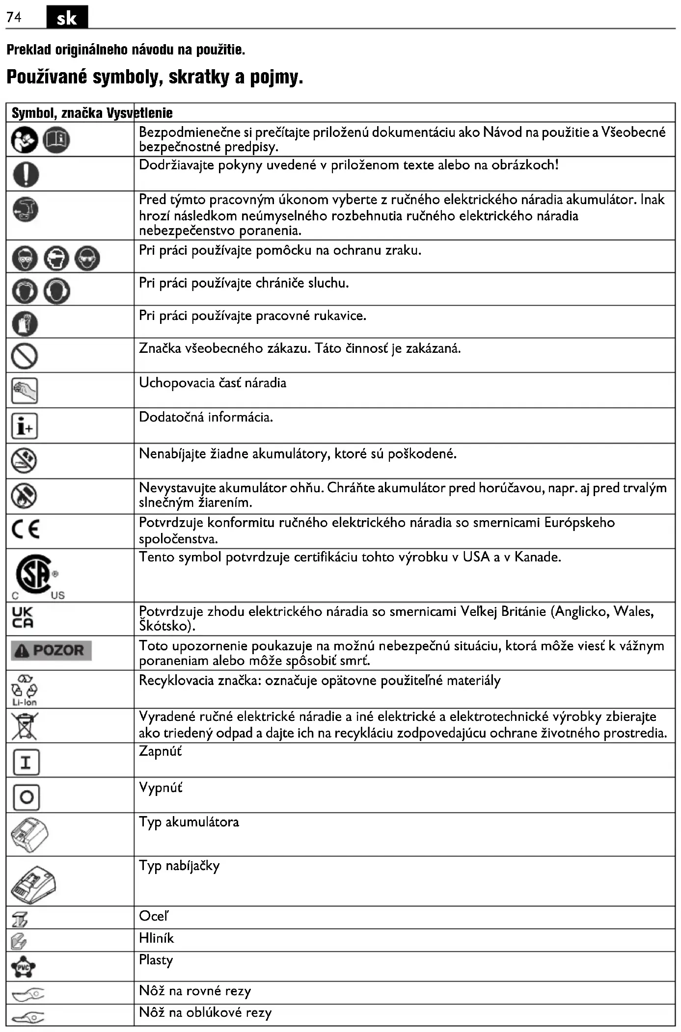 Preklad originálneho návodu na použitie. Používané symboly, skratky a pojmy. Symbol, značka Vysvetlenie Bezpodmienečne si prečítajte priloženú dokumentáciu ako Návod na použitie a Všeobecné bezpečnostné predpisy. Dodržiavajte pokyny uvedené v priloženom texte alebo na obrázkoch! Pred týmto pracovným úkonom vyberte z ručného elektrického náradia akumulátor. Inak hrozí následkom neúmyselného rozbehnutia ručného elektrického náradia nebezpečenstvo poranenia. Pri práci používajte pomôcku na ochranu zraku. Pri práci používajte chrániče sluchu. Pri práci používajte pracovné rukavice. Značka všeobecného zákazu. Táto činnosť je zakázaná. Uchopovacia časť náradia Dodatočná informácia. Nenabíjajte žiadne akumulátory, ktoré sú poškodené. Nevystavujte akumulátor ohňu. Chráňte akumulátor pred horúčavou, napr. aj pred trvalým slnečným žiarením. Potvrdzuje konformitu ručného elektrického náradia so smernicami Európskeho spoločenstva. Tento symbol potvrdzuje certifikáciu tohto výrobku v USA a v Kanade. Potvrdzuje zhodu elektrického náradia so smernicami Veľkej Británie (Anglicko, Wales, Škótsko). Toto upozornenie poukazuje na možnú nebezpečnú situáciu, ktorá môže viesť k vážnym poraneniam alebo môže spôsobiť smrť. Recyklovacia značka: označuje opätovne použiteľné materiály Vyradené ručné elektrické náradie a iné elektrické a elektrotechnické výrobky zbierajte ako triedený odpad a dajte ich na recykláciu zodpovedajúcu ochrane životného prostredia. Zapnúť Vypnúť Typ akumulátora Typ nabíjačky Oceľ Hliník Plasty Nôž na rovné rezy Nôž na oblúkové rezy75