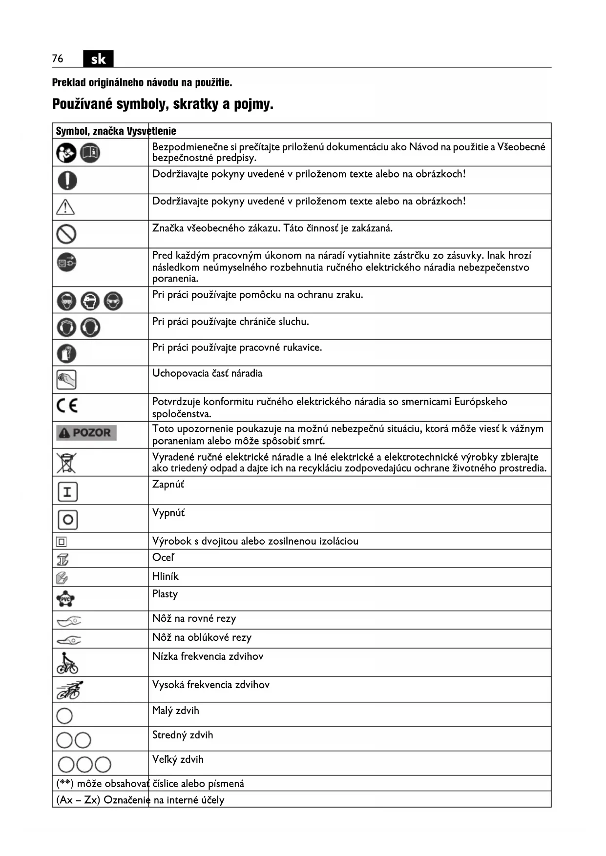 Preklad originálneho návodu na použitie. Používané symboly, skratky a pojmy. Symbol, značka Vysvetlenie Bezpodmienečne si prečítajte priloženú dokumentáciu ako Návod na použitie a Všeobecné bezpečnostné predpisy. Dodržiavajte pokyny uvedené v priloženom texte alebo na obrázkoch! Dodržiavajte pokyny uvedené v priloženom texte alebo na obrázkoch! Značka všeobecného zákazu. Táto činnosť je zakázaná. Pred každým pracovným úkonom na náradí vytiahnite zástrčku zo zásuvky. Inak hrozí následkom neúmyselného rozbehnutia ručného elektrického náradia nebezpečenstvo poranenia. Pri práci používajte pomôcku na ochranu zraku. Pri práci používajte chrániče sluchu. Pri práci používajte pracovné rukavice. Uchopovacia časť náradia Potvrdzuje konformitu ručného elektrického náradia so smernicami Európskeho spoločenstva. Toto upozornenie poukazuje na možnú nebezpečnú situáciu, ktorá môže viesť k vážnym poraneniam alebo môže spôsobiť smrť. Vyradené ručné elektrické náradie a iné elektrické a elektrotechnické výrobky zbierajte ako triedený odpad a dajte ich na recykláciu zodpovedajúcu ochrane životného prostredia. Zapnúť Vypnúť Výrobok s dvojitou alebo zosilnenou izoláciou Oceľ Hliník Plasty Nôž na rovné rezy Nôž na oblúkové rezy Nízka frekvencia zdvihov Vysoká frekvencia zdvihov Malý zdvih Stredný zdvih Veľký zdvih (**) môže obsahovať číslice alebo písmená (Ax – Zx) Označenie na interné účely77