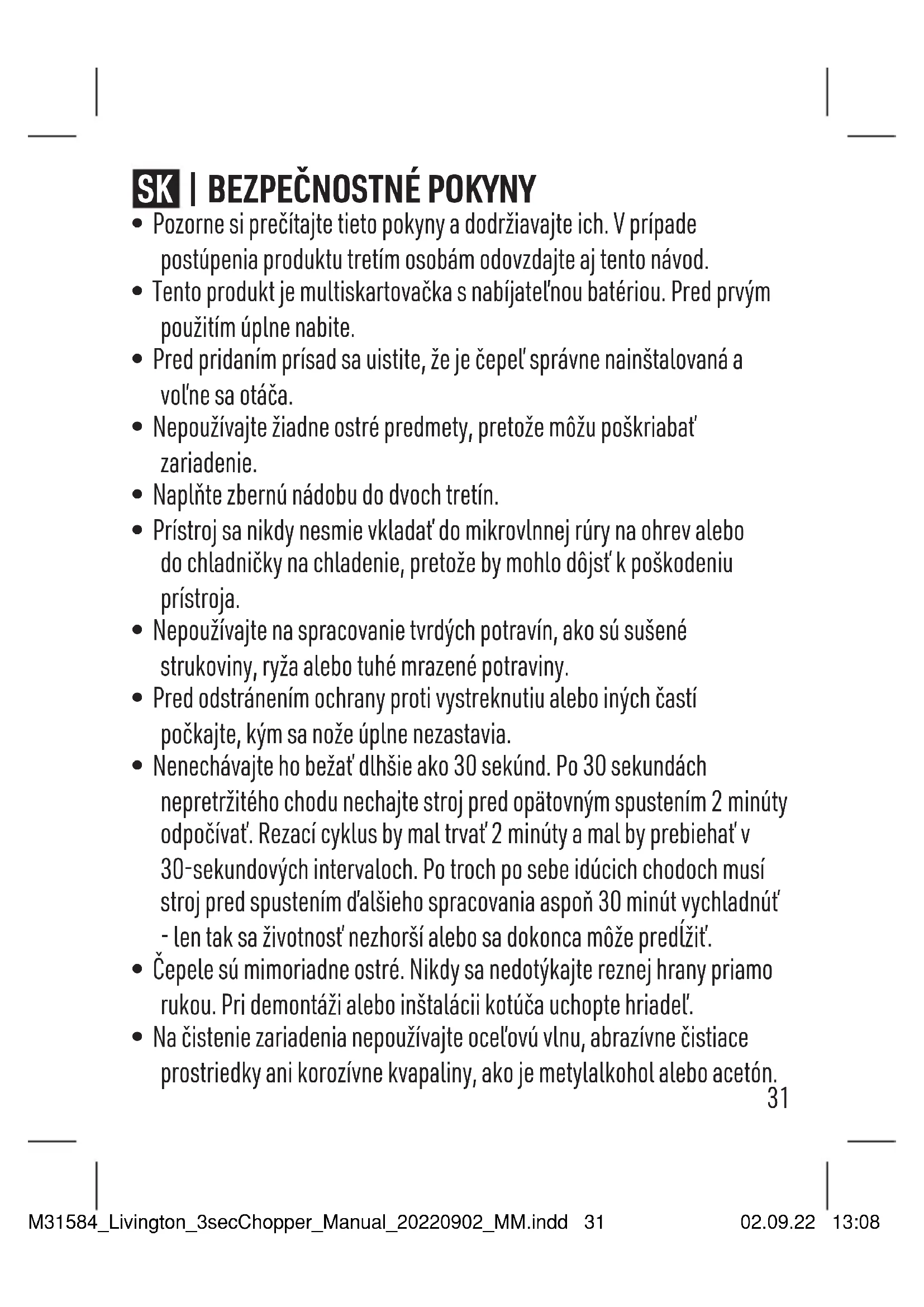 - Nikdy nedovoľte, aby sa ruky, vlasy, voľné oblečenie alebo iné M31584_Livington_3secChopper_Manual_20220902_MM.indd 32M31584_Livington_3secChopper_Manual_20220902_MM.indd 32 02.09.22 13:0802.09.22 13:0833 predmety dostali do kontaktu s nožmi.