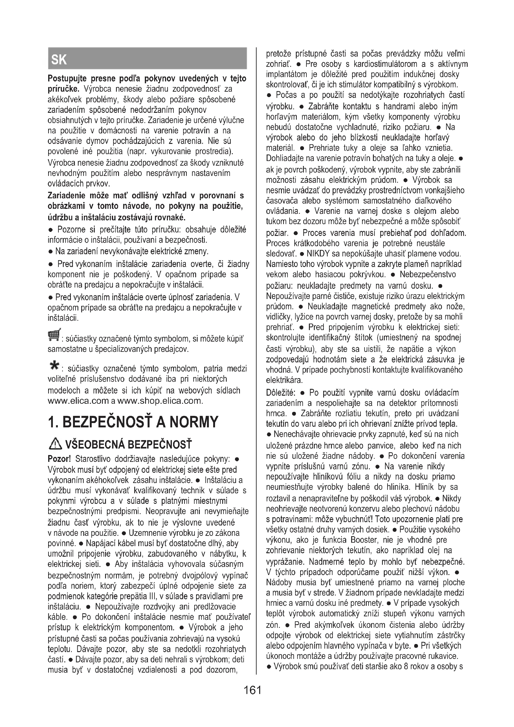Před kontaktováním servisního oddělení 1.Zkontrolujte, zda problém nemůžete vyřešit sami podle pokynů uvedených ve “Vyhledávání závad”. 2.Vypněte a znovu zapněte přístroj a zkontrolujte, zda závada přetrvává. Pokud i po těchto kontrolách závada bude přetrvávat, kontaktujte nejbližší servisní středisko. 160SK Postupujte presne podľa pokynov uvedených v tejto príručke. Výrobca nenesie žiadnu zodpovednosť za akékoľvek problémy, škody alebo požiare spôsobené zariadením spôsobené nedodržaním pokynov obsiahnutých vtejto príručke. Zariadenie je určené výlučne na použitie v domácnosti na varenie potravín a na odsávanie dymov pochádzajúcich z varenia. Nie sú povolené iné použitia (napr. vykurovanie prostredia). Výrobca nenesie žiadnu zodpovednosť za škody vzniknuté nevhodným použitím alebo nesprávnym nastavením ovládacích prvkov. Zariadenie môže mať odlišný vzhľad v porovnaní s obrázkami v tomto návode, no pokyny na použitie, údržbu a inštaláciu zostávajú rovnaké. ● Pozorne si prečítajte túto príručku: obsahuje dôležité informácie o inštalácii, používaní a bezpečnosti. ● Na zariadení nevykonávajte elektrické zmeny. ● Pred vykonaním inštalácie zariadenia overte, či žiadny komponent nie je poškodený. V opačnom prípade sa obráťte na predajcu a nepokračujte v inštalácii. ● Pred vykonaním inštalácie overte úplnosť zariadenia. V opačnom prípade sa obráťte na predajcu a nepokračujte v inštalácii. : súčiastky označené týmto symbolom, si môžete kúpiť samostatne u špecializovaných predajcov. : súčiastky označené týmto symbolom, patria medzi voliteľné príslušenstvo dodávané iba pri niektorých modeloch a môžete si ich kúpiť na webových sídlach www.elica.com a www.shop.elica.com.
