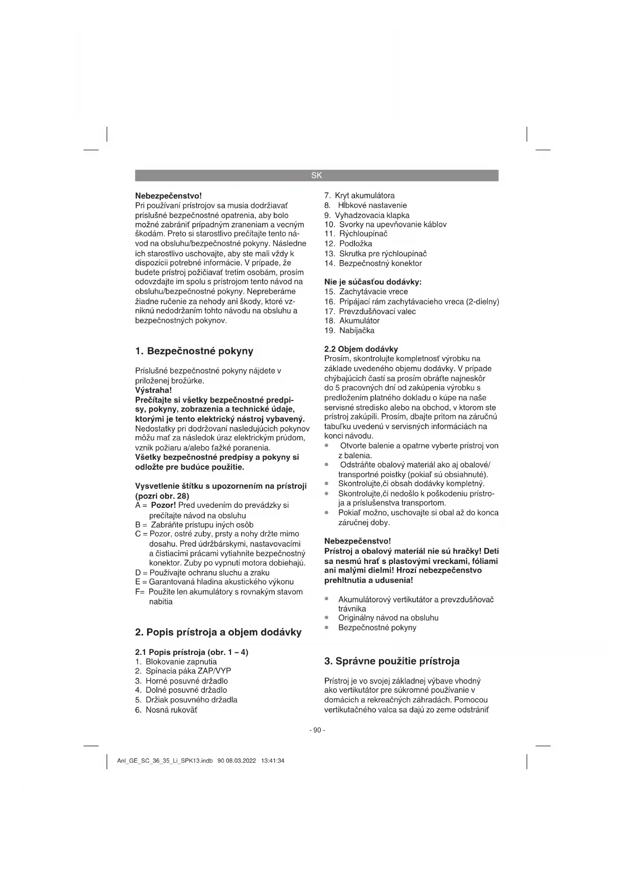 Prístroj je vo svojej základnej výbave vhodný ako vertikutátor pre súkromné používanie v domácich a rekreačných záhradách. Pomocou vertikutačného valca sa dajú zo zeme odstrániť Anl_GE_SC_36_35_Li_SPK13.indb 90 08.03.2022 13:41:34SK