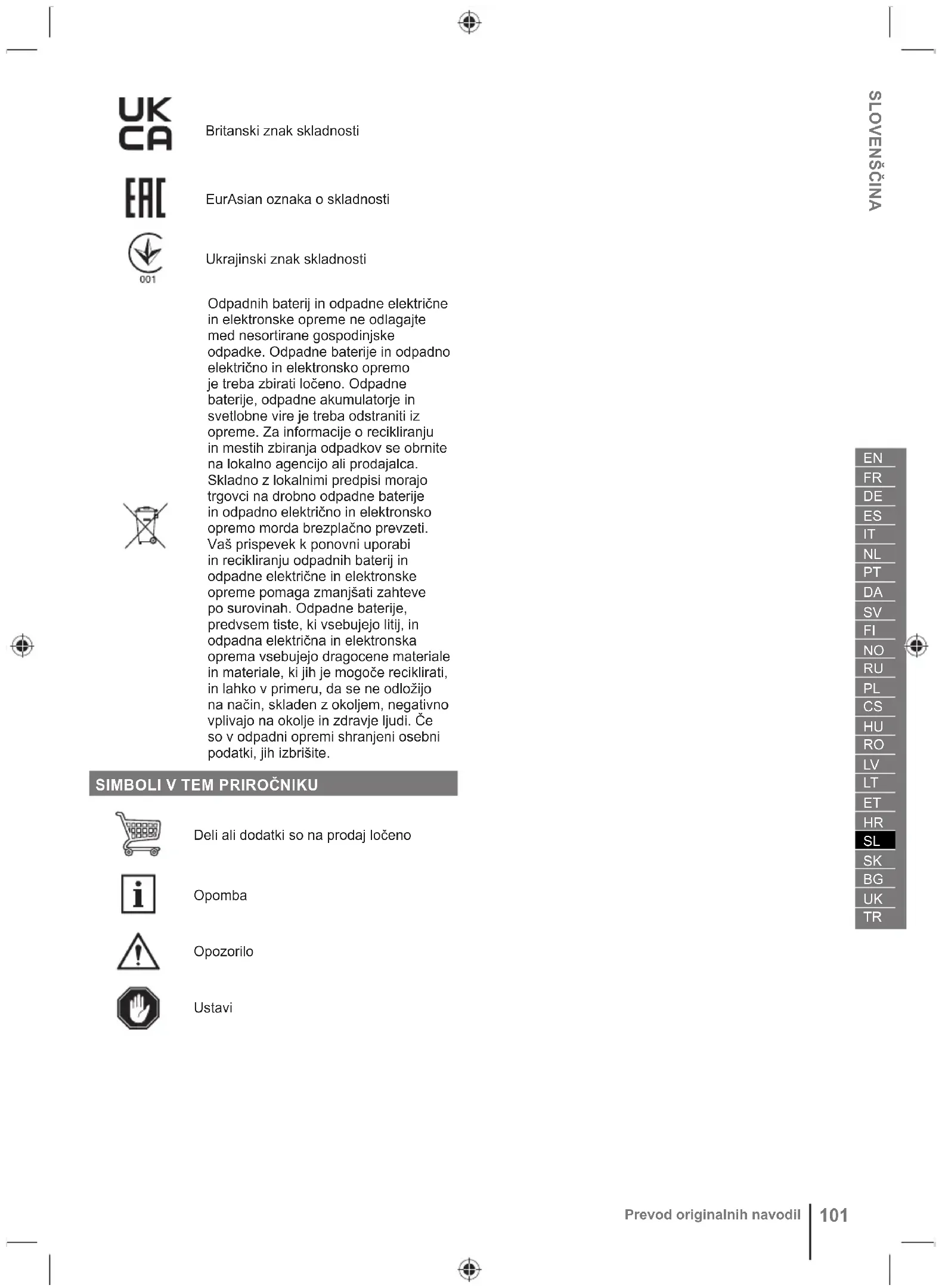 Garantovaná úroveň hluku Európske označenie zhody Britské označenie zhody Euroázijská značka zhody Ukrajinské označenie zhody Odpadové batérie a akumulátory a odpadové elektrické a elektronické zariadenia nelikvidujte ako netriedený komunálny odpad. Odpadové batérie a akumulátory a odpadové elektrické a elektronické zariadenia sa musia zbierať separovane. Odpadové batérie, odpadové akumulátory a svetelné zdroje treba z výrobku vybrať. Informácie o zbernom mieste získate od miestneho orgánu verejnej správy alebo vám ich poskytne maloobchodný predajca. Podľa miestnych predpisov môžu mať maloobchodníci povinnosť bezplatne prevziať odpadové batérie a akumulátory a odpadové elektrické a elektronické zariadenia. Váš príspevok k opätovnému použitiu a recyklácii odpadových batérií a akumulátorov a odpadových elektrických a elektronických zariadení pomáha znižovať dopyt po surovinách. Odpadové batérie a akumulátory, konkrétne tie, ktoré obsahujú lítium, a odpadové elektrické a elektronické zariadenia obsahujú cenné a recyklovateľné materiály, ktoré môžu mať nepriaznivý vplyv na životné prostredie a ľudské zdravie, ak sa nelikvidujú ekologicky vhodným spôsobom. Odstráňte prípadné osobné údaje z odpadového zariadenia.