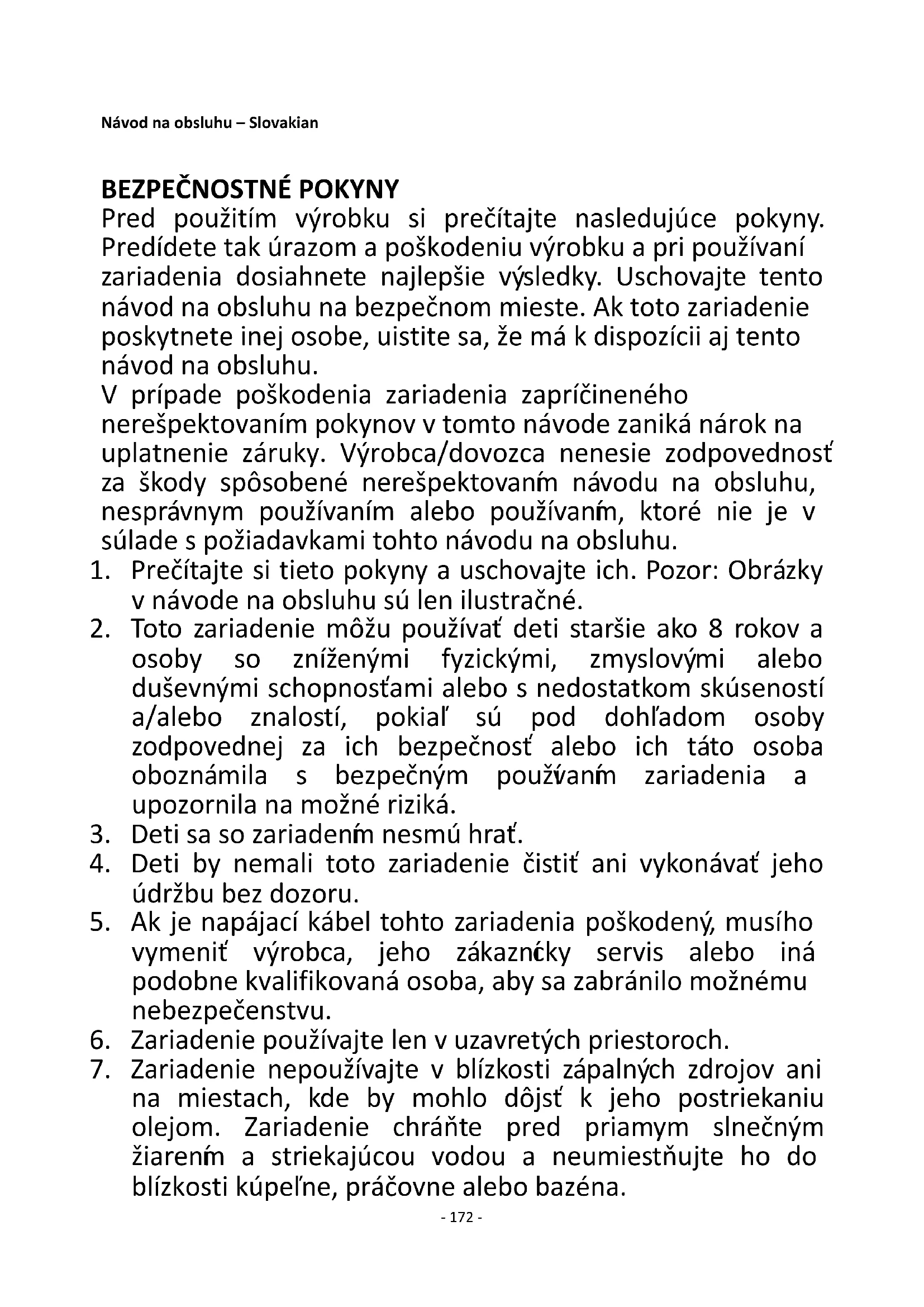 Pred použitím výrobku si prečítajte nasledujúce pokyny. Predídete tak úrazom a poškodeniu výrobku a pri používaní zariadenia dosiahnete najlepšie výsledky. Uschovajte tento návod na obsluhu na bezpečnom mieste. Ak toto zariadenie poskytnete inej osobe, uistite sa, že má k dispozícii aj tento návod na obsluhu. V prípade poškodenia zariadenia zapríčineného nerešpektovaním pokynov v tomto návode zaniká nárok na uplatnenie záruky. Výrobca/dovozca nenesie zodpovednosť za škody spôsobené nerešpektovaním návodu na obsluhu, nesprávnym používaním alebo používaním, ktoré nie je v súlade s požiadavkami tohto návodu na obsluhu.