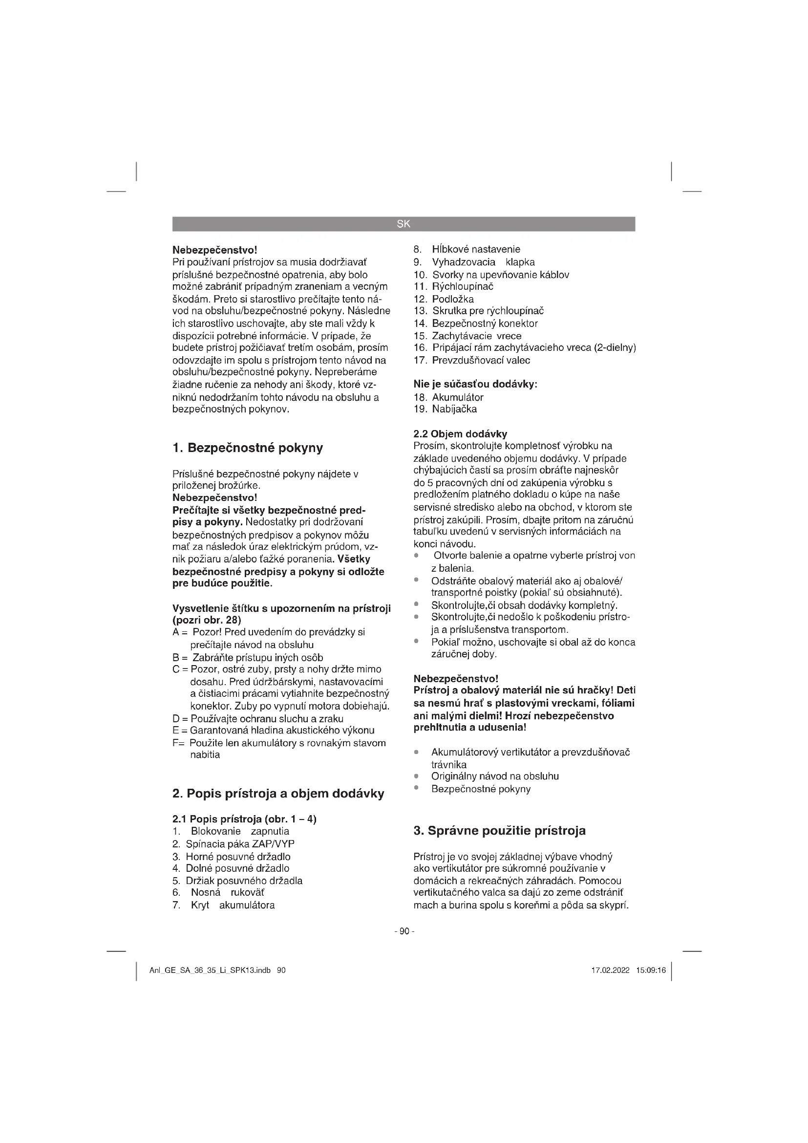 Používajte rukavice. Pozor! Zvyškové riziká Aj napriek tomu, že budete elektrický prístroj obsluhovať podľa predpisov, budú existovať zvyškové riziká. V súvislosti s konštrukciou Anl_GE_SA_36_35_Li_SPK13.indb 91Anl_GE_SA_36_35_Li_SPK13.indb 91 17.02.2022 15:09:1617.02.2022 15:09:16SK