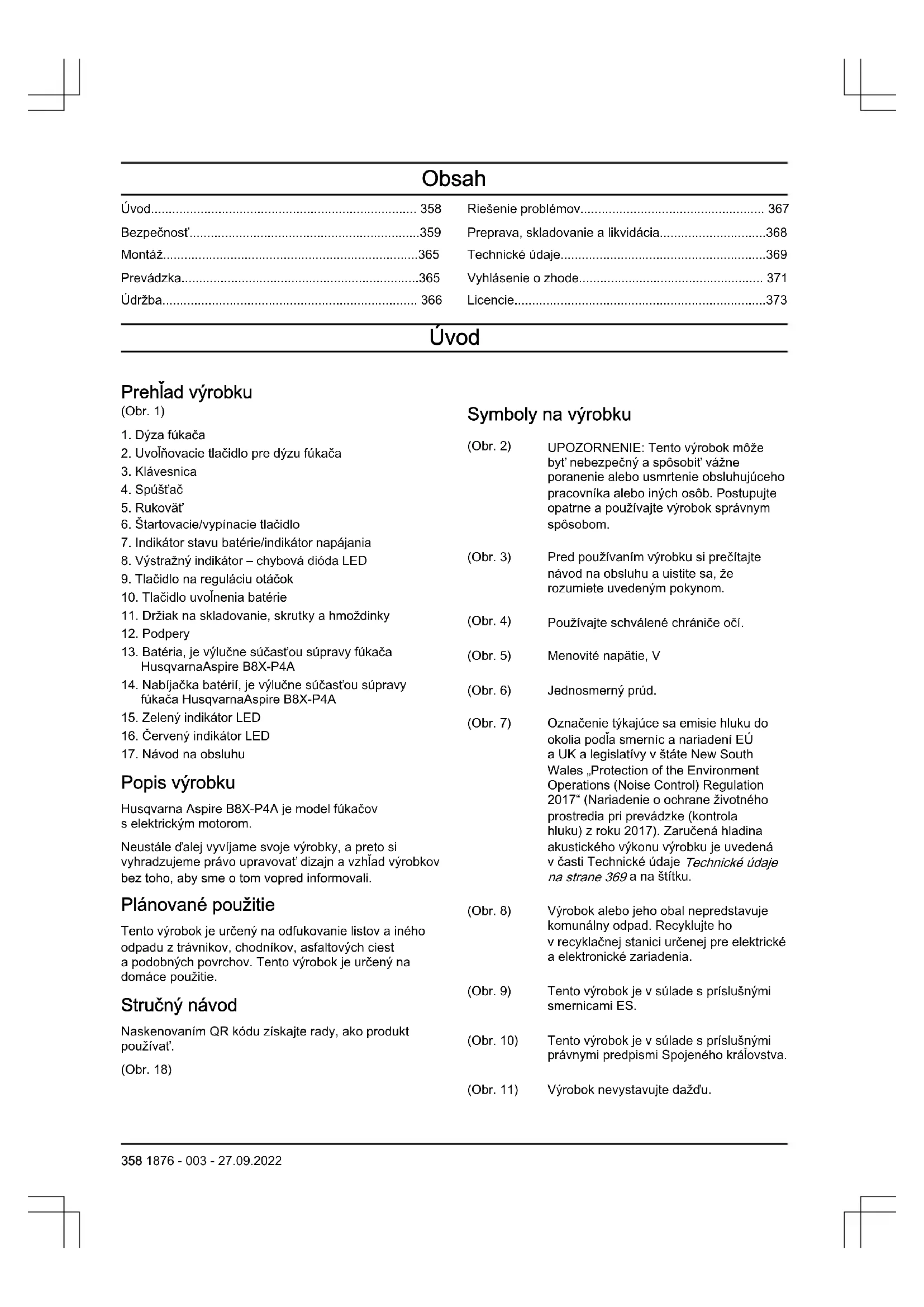 Popis výrobku Husqvarna Aspire B8X-P4A je model fúkačov selektrickým motorom. Neustále ďalej vyvíjame svoje výrobky, a preto si vyhradzujeme právo upravovať dizajn a vzhľad výrobkov bez toho, aby sme o tom vopred informovali. Plánované použitie Tento výrobok je určený na odfukovanie listov ainého odpadu ztrávnikov, chodníkov, asfaltových ciest apodobných povrchov. Tento výrobok je určený na domáce použitie. Stručný návod Naskenovaním QR kódu získajte rady, ako produkt používať. (Obr. 18) Symboly na výrobku (Obr. 2) UPOZORNENIE: Tento výrobok môže byť nebezpečný a spôsobiť vážne poranenie alebo usmrtenie obsluhujúceho pracovníka alebo iných osôb. Postupujte opatrne apoužívajte výrobok správnym spôsobom. (Obr. 3) Pred používaním výrobku si prečítajte návod na obsluhu a uistite sa, že rozumiete uvedeným pokynom. (Obr. 4) Používajte schválené chrániče očí. (Obr. 5) Menovité napätie, V (Obr. 6) Jednosmerný prúd. (Obr. 7) Označenie týkajúce sa emisie hluku do okolia podľa smerníc anariadení EÚ a UK alegislatívy vštáte New South Wales „Protection of the Environment Operations (Noise Control) Regulation 2017“ (Nariadenie oochrane životného prostredia pri prevádzke (kontrola hluku) zroku 2017). Zaručená hladina akustického výkonu výrobku je uvedená včasti Technické údaje Technické údaje na strane 369 ana štítku. (Obr. 8) Výrobok alebo jeho obal nepredstavuje komunálny odpad. Recyklujte ho vrecyklačnej stanici určenej pre elektrické aelektronické zariadenia. (Obr. 9) Tento výrobok je vsúlade spríslušnými smernicami ES. (Obr. 10) Tento výrobok je vsúlade spríslušnými právnymi predpismi Spojeného kráľovstva. (Obr. 11) Výrobok nevystavujte dažďu. 358 1876 - 003 - 27.09.2022(Obr. 15) Operátor fúkača musí zabezpečiť, aby sa žiadni ľudia alebo zvieratá nedosta- li bližšie ako 15 metrov od stroja. Ak vrovnakom priestore pracuje niekoľko operátorov, bezpečná vzdialenosť me- dzi nimi musí byť minimálne 15 me- trov. Fúkač môže odhodiť predmety, ktoré môžu odskočiť späť. Ak sa ne- používa odporúčané bezpečnostné vy- bavenie, môže to spôsobiť vážne po- ranenia očí. rrrr ttxxxxx Výkonový štítok zobrazuje výrobné číslo. yyyy je rok výroby, ww je týždeň výroby. Poznámka: Ostatné symboly/štítky na výrobku obsahujú údaje v súlade so zvláštnymi požiadavkami certifikácie pre určité trhy. Symboly na batérii a/alebo na nabíjačke batérií (Obr. 16) Tento výrobok re- cyklujte vrecyklač- nej stanici určenej pre elektrické aelek- tronické zariadenia. (Uplatňuje sa iba na Európu) (Obr. 17) Batériu používajte len vo výrobkoch od part- nerov systému PO- WER FOR ALL. (Obr. 12) Transformátor odolný voči poruchám. (Obr. 13) Nabíjačku batérie používajte a skladuje len vinteriéri. (Obr. 14) Dvojitá izolácia. Zodpovednosť za výrobok Vsúlade správnymi predpismi upravujúcimi zodpovednosť za výrobok nenesieme zodpovednosť za škody spôsobené naším výrobkom vdôsledku: