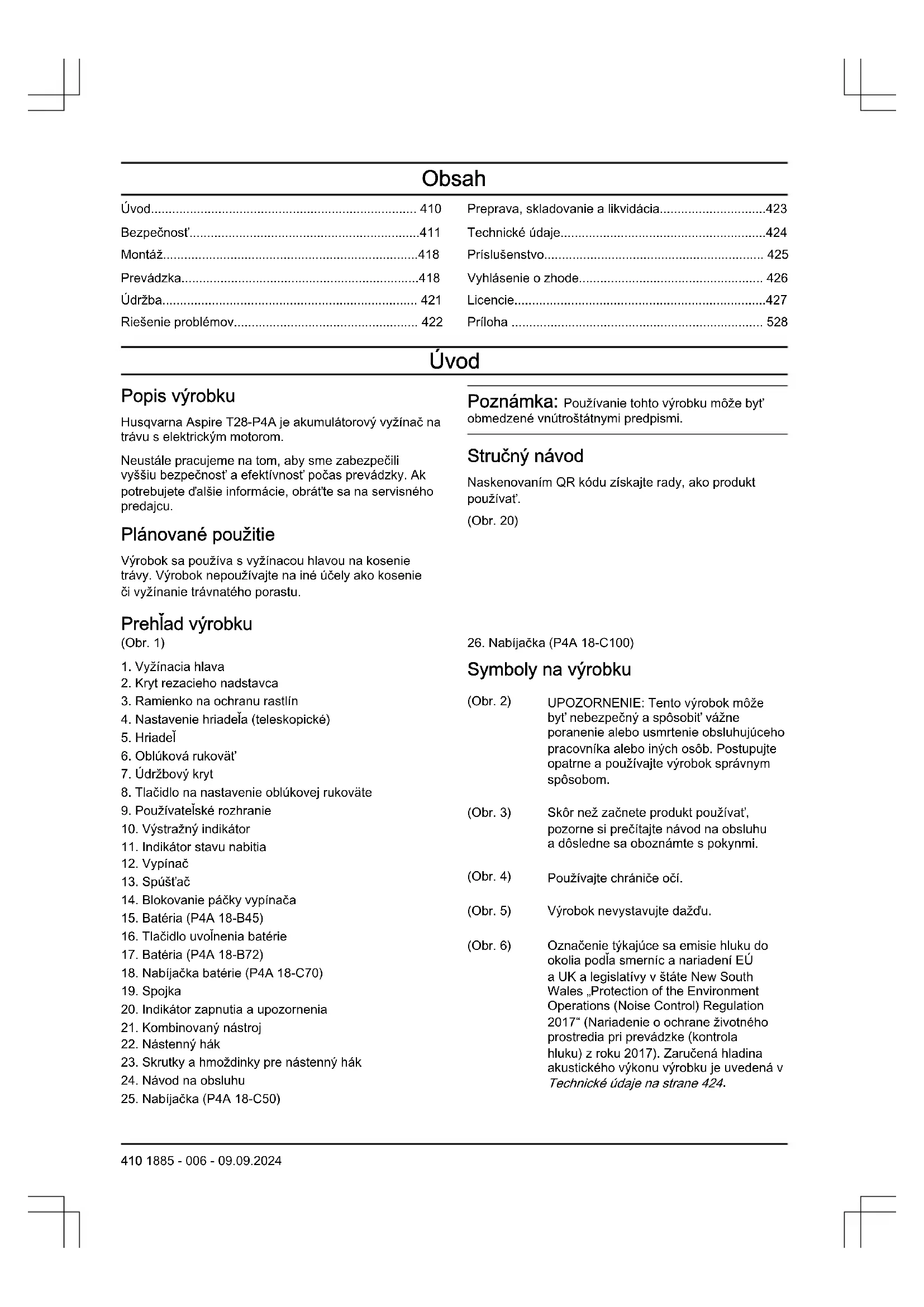 - Informácie odostupnom príslušenstve na skladovanie výrobku získate od servisného zástupcu spoločnosti Husqvarna. Prevádzka Úvod VÝSTRAHA: Pred používaním výrobku si prečítajte kapitolu obezpečnosti auistite sa, že rozumiete informáciám, ktoré sa vnej uvádzajú. 418 1885 - 006 - 09.09.2024Pred obsluhou zariadenia