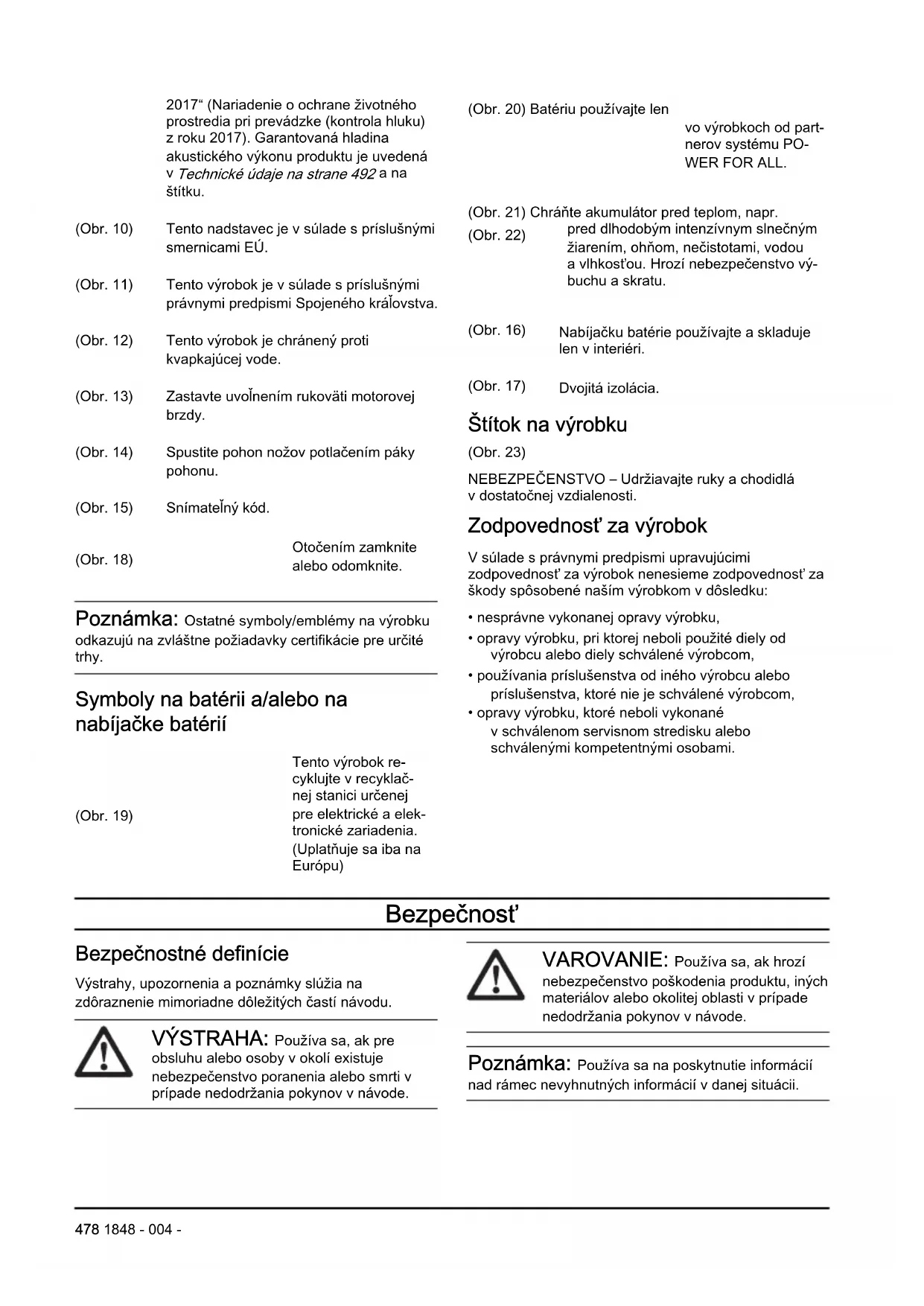 Technické údaje na strane 492 ana štítku. (Obr. 10) Tento nadstavec je v súlade s príslušnými smernicami EÚ. (Obr. 11) Tento výrobok je vsúlade spríslušnými právnymi predpismi Spojeného kráľovstva. (Obr. 12) Tento výrobok je chránený proti kvapkajúcej vode. (Obr. 13) Zastavte uvoľnením rukoväti motorovej brzdy. (Obr. 14) Spustite pohon nožov potlačením páky pohonu. (Obr. 15) Snímateľný kód. (Obr. 18) Otočením zamknite alebo odomknite. Poznámka: Ostatné symboly/emblémy na výrobku odkazujú na zvláštne požiadavky certifikácie pre určité trhy. Symboly na batérii a/alebo na nabíjačke batérií (Obr. 19) Tento výrobok re- cyklujte vrecyklač- nej stanici určenej pre elektrické aelek- tronické zariadenia. (Uplatňuje sa iba na Európu) (Obr. 20) Batériu používajte len vo výrobkoch od part- nerov systému PO- WER FOR ALL. (Obr. 21) Chráňte akumulátor pred teplom, napr. pred dlhodobým intenzívnym slnečným žiarením, ohňom, nečistotami, vodou avlhkosťou. Hrozí nebezpečenstvo vý- buchu a skratu. (Obr. 22) (Obr. 16) Nabíjačku batérie používajte a skladuje len vinteriéri. (Obr. 17) Dvojitá izolácia. Štítok na výrobku (Obr. 23) NEBEZPEČENSTVO – Udržiavajte ruky achodidlá vdostatočnej vzdialenosti. Zodpovednosť za výrobok Vsúlade správnymi predpismi upravujúcimi zodpovednosť za výrobok nenesieme zodpovednosť za škody spôsobené naším výrobkom vdôsledku: