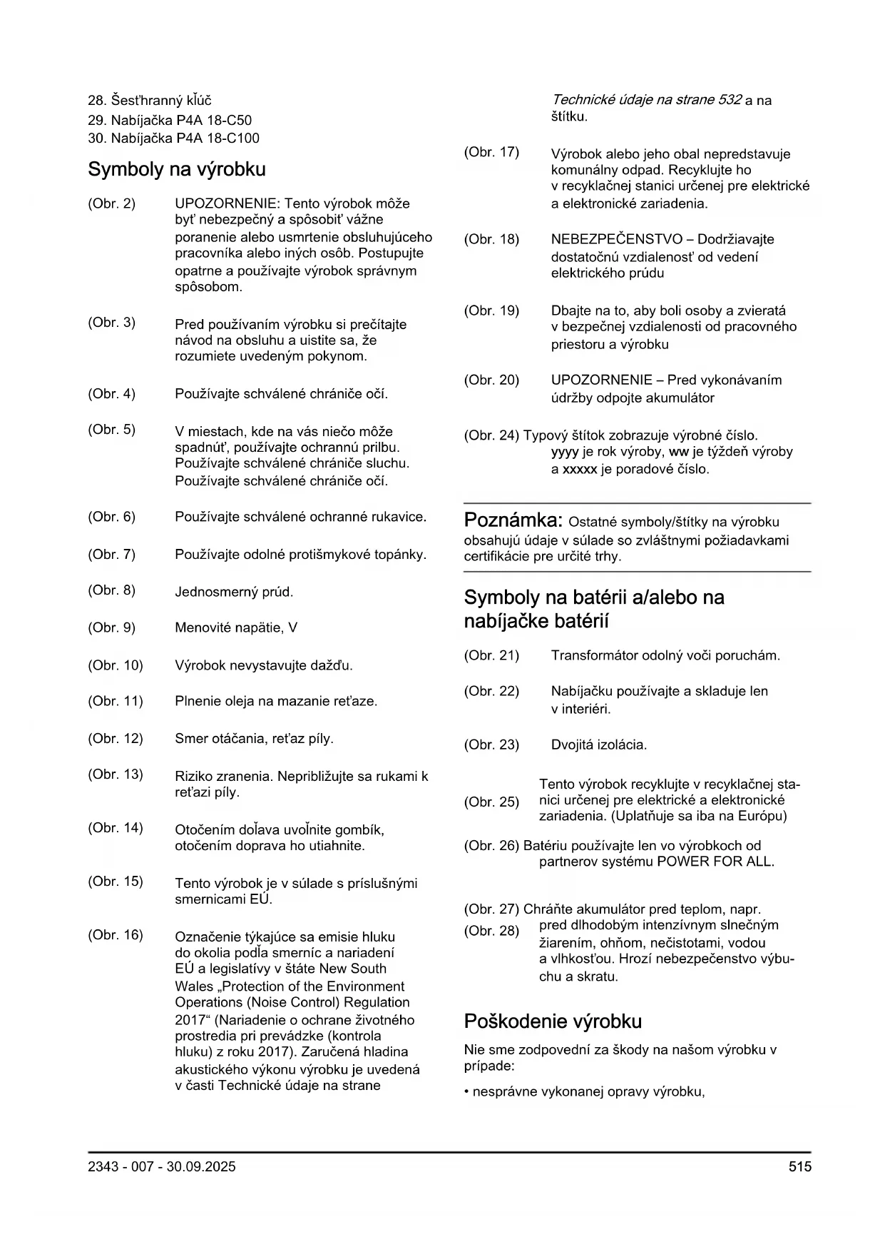 Symboly na výrobku (Obr. 2) UPOZORNENIE: Tento výrobok môže byť nebezpečný a spôsobiť vážne poranenie alebo usmrtenie obsluhujúceho pracovníka alebo iných osôb. Postupujte opatrne apoužívajte výrobok správnym spôsobom. (Obr. 3) Pred používaním výrobku si prečítajte návod na obsluhu a uistite sa, že rozumiete uvedeným pokynom. (Obr. 4) Používajte schválené chrániče očí. (Obr. 5) Vmiestach, kde na vás niečo môže spadnúť, používajte ochrannú prilbu. Používajte schválené chrániče sluchu. Používajte schválené chrániče očí. (Obr. 6) Používajte schválené ochranné rukavice. (Obr. 7) Používajte odolné protišmykové topánky. (Obr. 8) Jednosmerný prúd. (Obr. 9) Menovité napätie, V (Obr. 10) Výrobok nevystavujte dažďu. (Obr. 11) Plnenie oleja na mazanie reťaze. (Obr. 12) Smer otáčania, reťaz píly. (Obr. 13) Riziko zranenia. Nepribližujte sa rukami k reťazi píly. (Obr. 14) Otočením doľava uvoľnite gombík, otočením doprava ho utiahnite. (Obr. 15) Tento výrobok je vsúlade spríslušnými smernicami EÚ. (Obr. 16) Označenie týkajúce sa emisie hluku do okolia podľa smerníc anariadení EÚ alegislatívy vštáte New South Wales „Protection of the Environment Operations (Noise Control) Regulation 2017“ (Nariadenie oochrane životného prostredia pri prevádzke (kontrola hluku) zroku 2017). Zaručená hladina akustického výkonu výrobku je uvedená v časti Technické údaje na strane Technické údaje na strane 532 a na štítku. (Obr. 17) Výrobok alebo jeho obal nepredstavuje komunálny odpad. Recyklujte ho vrecyklačnej stanici určenej pre elektrické aelektronické zariadenia. (Obr. 18) NEBEZPEČENSTVO – Dodržiavajte dostatočnú vzdialenosť od vedení elektrického prúdu (Obr. 19) Dbajte na to, aby boli osoby azvieratá vbezpečnej vzdialenosti od pracovného priestoru avýrobku (Obr. 20) UPOZORNENIE – Pred vykonávaním údržby odpojte akumulátor (Obr. 24) Typový štítok zobrazuje výrobné číslo. yyyy je rok výroby, ww je týždeň výroby a xxxxx je poradové číslo. Poznámka: Ostatné symboly/štítky na výrobku obsahujú údaje v súlade so zvláštnymi požiadavkami certifikácie pre určité trhy. Symboly na batérii a/alebo na nabíjačke batérií (Obr. 21) Transformátor odolný voči poruchám. (Obr. 22) Nabíjačku používajte a skladuje len vinteriéri. (Obr. 23) Dvojitá izolácia. (Obr. 25) Tento výrobok recyklujte vrecyklačnej sta- nici určenej pre elektrické aelektronické zariadenia. (Uplatňuje sa iba na Európu) (Obr. 26) Batériu používajte len vo výrobkoch od partnerov systému POWER FOR ALL. (Obr. 27) Chráňte akumulátor pred teplom, napr. pred dlhodobým intenzívnym slnečným žiarením, ohňom, nečistotami, vodou avlhkosťou. Hrozí nebezpečenstvo výbu- chu a skratu. (Obr. 28) Poškodenie výrobku Nie sme zodpovední za škody na našom výrobku v prípade:
