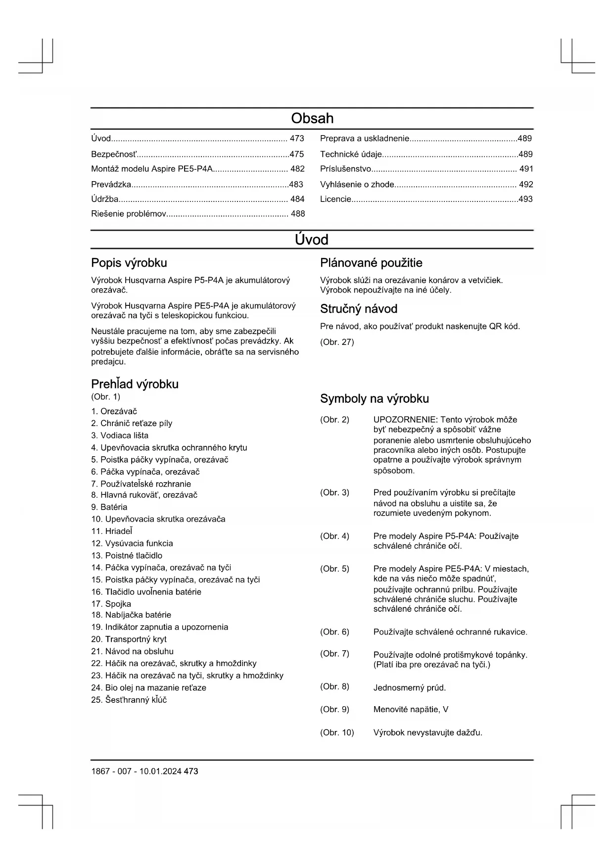 Symboly na výrobku (Obr. 2) UPOZORNENIE: Tento výrobok môže byť nebezpečný a spôsobiť vážne poranenie alebo usmrtenie obsluhujúceho pracovníka alebo iných osôb. Postupujte opatrne apoužívajte výrobok správnym spôsobom. (Obr. 3) Pred používaním výrobku si prečítajte návod na obsluhu a uistite sa, že rozumiete uvedeným pokynom. (Obr. 4) Pre modely Aspire P5-P4A: Používajte schválené chrániče očí. (Obr. 5) Pre modely Aspire PE5-P4A: Vmiestach, kde na vás niečo môže spadnúť, používajte ochrannú prilbu. Používajte schválené chrániče sluchu. Používajte schválené chrániče očí. (Obr. 6) Používajte schválené ochranné rukavice. (Obr. 7) Používajte odolné protišmykové topánky. (Platí iba pre orezávač na tyči.) (Obr. 8) Jednosmerný prúd. (Obr. 9) Menovité napätie, V (Obr. 10) Výrobok nevystavujte dažďu. 1867 - 007 - 10.01.2024 473(Obr. 11) Plnenie oleja na mazanie reťaze. (Obr. 12) Smer otáčania, reťaz píly. (Obr. 13) Riziko zranenia. Nepribližujte sa rukami k reťazi píly. (Obr. 14) Otočením doľava uvoľnite gombík, otočením doprava ho utiahnite. (Obr. 15) Tento výrobok je vsúlade spríslušnými smernicami EÚ. (Obr. 16) Tento výrobok je vsúlade spríslušnými právnymi predpismi Spojeného kráľovstva. (Obr. 17) Označenie týkajúce sa emisie hluku do okolia podľa smerníc anariadení EÚ a UK alegislatívy vštáte New South Wales „Protection of the Environment Operations (Noise Control) Regulation 2017“ (Nariadenie oochrane životného prostredia pri prevádzke (kontrola hluku) zroku 2017). Zaručená hladina akustického výkonu výrobku je uvedená v Technických údajoch na strane Technické údaje na strane 489 ana štítku. (Obr. 18) Výrobok alebo jeho obal nepredstavuje komunálny odpad. Recyklujte ho vrecyklačnej stanici určenej pre elektrické aelektronické zariadenia. (Obr. 21) Tento výrobok nie je elektricky izolovaný. Ak sa výrobok dotkne alebo sa dostane do blízkosti elektrických vedení vysokého napätia, môže dôjsť kúmrtiu alebo vážnemu poraneniu. Iskrením môže elektrina preskočiť z jedného miesta na dru- hé. Čím väčšie je elektrické napätie, tým väčšia je vzdialenosť, na ktorú môže elektrina preskočiť. Elektrinu môžu tiež viesť konáre a iné predmety, najmä ak sú mokré. Vždy dodržiavajte odstup aspoň 10metrov medzi výrobkom a vedením vysokého napätia a/alebo všetkých predmetov, ktoré sa ho dotýkajú. Ak musíte pracovať vo vzdialenosti, ktorá je menšia než bezpečná hranica, vždy zavolajte spoločnosť zodpovednú za správu vedenia, aby pred začatím práce vypli prúd. Používateľ výrobku musí počas jeho používania zaistiť, aby sa kvýrobku do vzdialenosti menšej ako 15metrov nepriblížili žiadne osoby ani zvieratá. (Platí iba pre orezávač na tyči.) (Obr. 22) Výkonový štítok alebo laserová tlač zobrazuje výrobné číslo. yyyy je rok výroby a ww je týždeň výroby. Poznámka: Ostatné symboly/štítky na výrobku obsahujú údaje v súlade so zvláštnymi požiadavkami certifikácie pre určité trhy. Symboly na batérii a/alebo na nabíjačke batérií (Obr. 23) Tento výrobok re- cyklujte vrecyklač- nej stanici určenej pre elektrické aelek- tronické zariadenia. (Uplatňuje sa iba na Európu) (Obr. 24) Batériu používajte len vo výrobkoch od part- nerov systému PO- WER FOR ALL. (Obr. 25) Chráňte akumulátor pred teplom, napr. pred dlhodobým intenzívnym slnečným žiarením, ohňom, nečistotami, vodou avlhkosťou. Hrozí nebezpečenstvo vý- buchu a skratu. (Obr. 26) (Obr. 19) Nabíjačku batérie používajte a skladuje len vinteriéri. (Obr. 20) Dvojitá izolácia. Poškodenie výrobku Nie sme zodpovední za škody na našom výrobku v prípade: