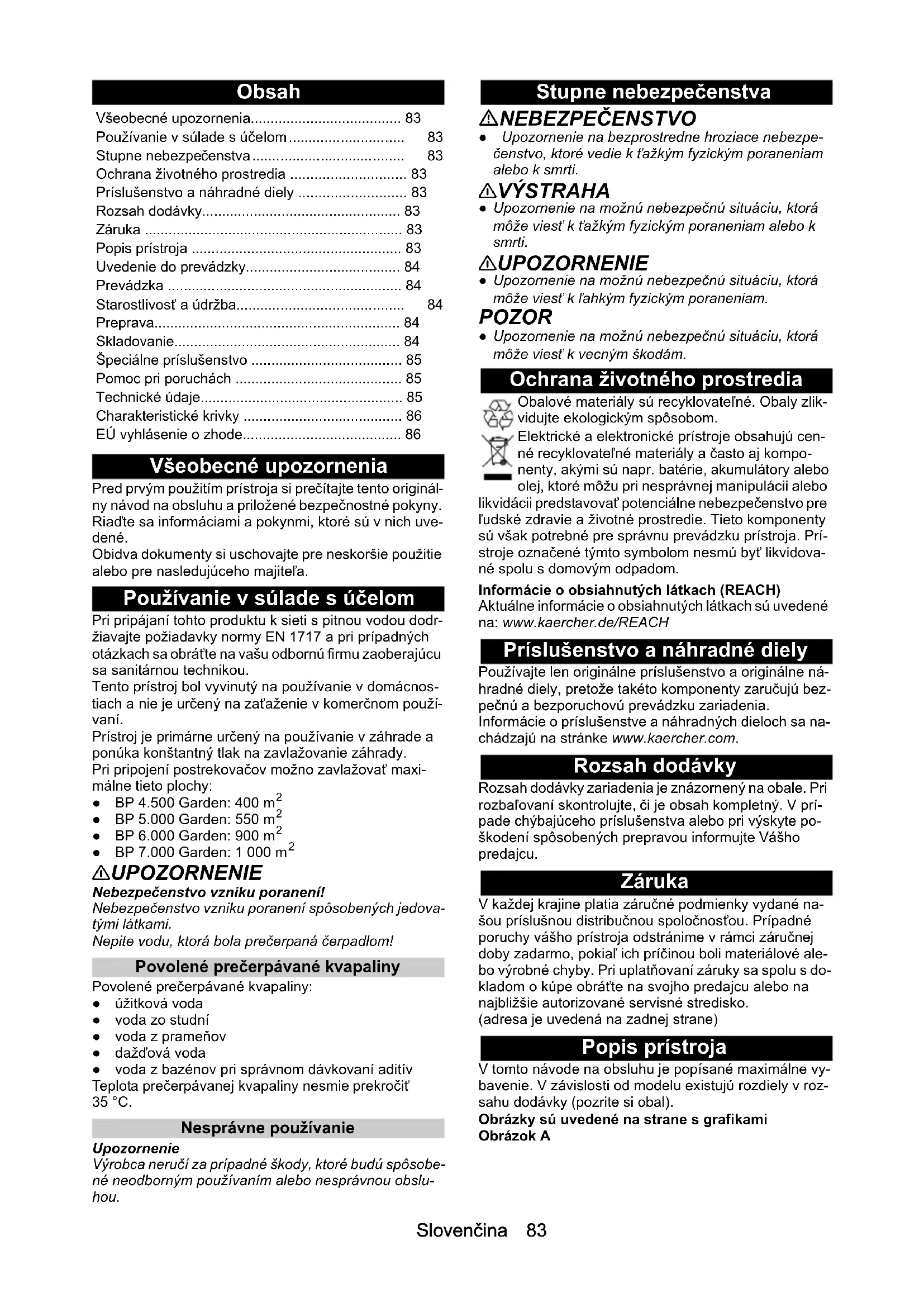- 몇 UPOZORNENIE Nebezpečenstvo vzniku poranení! Nebezpečenstvo vzniku poranení spôsobených jedova- tými látkami. Nepite vodu, ktorá bola prečerpaná čerpadlom! Povolené prečerpávané kvapaliny Povolené prečerpávané kvapaliny: ● úžitková voda ● voda zo studní ● voda z prameňov ● dažďová voda ● voda z bazénov pri správnom dávkovaní aditív Teplota prečerpávanej kvapaliny nesmie prekročiť 35 °C. Nesprávne používanie Upozornenie Výrobca neručí za prípadné škody, ktoré budú spôsobe- né neodborným používaním alebo nesprávnou obslu- hou. Stupne nebezpečenstva NEBEZPEČENSTVO ● Upozornenie na bezprostredne hroziace nebezpe- čenstvo, ktoré vedie k ťažkým fyzickým poraneniam alebo k smrti. 몇 VÝSTRAHA ● Upozornenie na možnú nebezpečnú situáciu, ktorá môže viesť k ťažkým fyzickým poraneniam alebo k smrti. 몇 UPOZORNENIE ● Upozornenie na možnú nebezpečnú situáciu, ktorá môže viesť k ľahkým fyzickým poraneniam. POZOR ● Upozornenie na možnú nebezpečnú situáciu, ktorá môže viesť k vecným škodám. Ochrana životného prostredia Obalové materiály sú recyklovateľné. Obaly zlik- vidujte ekologickým spôsobom. Elektrické a elektronické prístroje obsahujú cen- né recyklovateľné materiály a často aj kompo- nenty, akými sú napr. batérie, akumulátory alebo olej, ktoré môžu pri nesprávnej manipulácii alebo likvidácii predstavovať potenciálne nebezpečenstvo pre ľudské zdravie a životné prostredie. Tieto komponenty sú však potrebné pre správnu prevádzku prístroja. Prí- stroje označené týmto symbolom nesmú byť likvidova- né spolu s domovým odpadom. Informácie o obsiahnutých látkach (REACH) Aktuálne informácie o obsiahnutých látkach sú uvedené na: www.kaercher.de/REACH Príslušenstvo a náhradné diely Používajte len originálne príslušenstvo a originálne ná- hradné diely, pretože takéto komponenty zaručujú bez- pečnú a bezporuchovú prevádzku zariadenia. Informácie o príslušenstve a náhradných dieloch sa na- chádzajú na stránke www.kaercher.com. Rozsah dodávky Rozsah dodávky zariadenia je znázornený na obale. Pri rozbaľovaní skontrolujte, či je obsah kompletný. V prí- pade chýbajúceho príslušenstva alebo pri výskyte po- škodení spôsobených prepravou informujte Vášho predajcu. Záruka V každej krajine platia záručné podmienky vydané na- šou príslušnou distribučnou spoločnosťou. Prípadné poruchy vášho prístroja odstránime v rámci záručnej doby zadarmo, pokiaľ ich príčinou boli materiálové ale- bo výrobné chyby. Pri uplatňovaní záruky sa spolu s do- kladom o kúpe obráťte na svojho predajcu alebo na najbližšie autorizované servisné stredisko. (adresa je uvedená na zadnej strane) Popis prístroja V tomto návode na obsluhu je popísané maximálne vy- bavenie. V závislosti od modelu existujú rozdiely v roz- sahu dodávky (pozrite si obal). Obrázky sú uvedené na strane s grafikami Obrázok A Všeobecné upozornenia p. 83