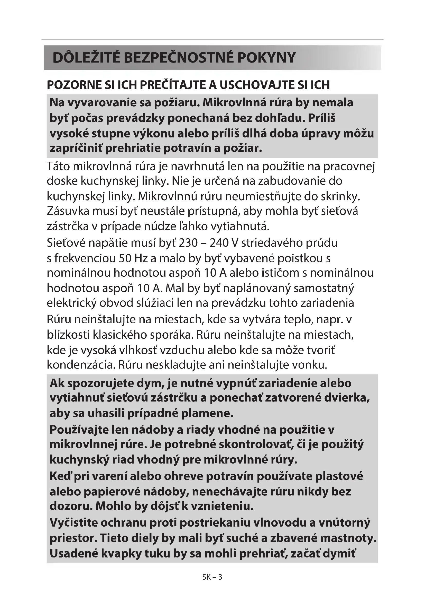 POZORNE SI ICH PREČÍTAJTE A USCHOVAJTE SI ICH Na vyvarovanie sa požiaru. Mikrovlnná rúra by nemala byť počas prevádzky ponechaná bez dohľadu. Príliš vysoké stupne výkonu alebo príliš dlhá doba úpravy môžu zapríčiniť prehriatie potravín a požiar. Táto mikrovlnná rúra je navrhnutá len na použitie na pracovnej doske kuchynskej linky. Nie je určená na zabudovanie do kuchynskej linky. Mikrovlnnú rúru neumiestňujte do skrinky. Zásuvka musí byť neustále prístupná, aby mohla byť sieťová zástrčka v prípade núdze ľahko vytiahnutá. Sieťové napätie musí byť 230 – 240 V striedavého prúdu s frekvenciou 50 Hz a malo by byť vybavené poistkou s nominálnou hodnotou aspoň 10 A alebo ističom s nominálnou hodnotou aspoň 10 A. Mal by byť naplánovaný samostatný elektrický obvod slúžiaci len na prevádzku tohto zariadenia Rúru neinštalujte na miestach, kde sa vytvára teplo, napr. v blízkosti klasického sporáka. Rúru neinštalujte na miestach, kde je vysoká vlhkosť vzduchu alebo kde sa môže tvoriť kondenzácia. Rúru neskladujte ani neinštalujte vonku. Ak spozorujete dym, je nutné vypnúť zariadenie alebo vytiahnuť sieťovú zástrčku a ponechať zatvorené dvierka, aby sa uhasili prípadné plamene. Používajte len nádoby a riady vhodné na použitie v mikrovlnnej rúre. Je potrebné skontrolovať, či je použitý kuchynský riad vhodný pre mikrovlnné rúry. Keď pri varení alebo ohreve potravín používate plastové alebo papierové nádoby, nenechávajte rúru nikdy bez dozoru. Mohlo by dôjsť k vznieteniu. Vyčistite ochranu proti postriekaniu vlnovodu a vnútorný priestor. Tieto diely by mali byť suché a zbavené mastnoty. Usadené kvapky tuku by sa mohli prehriať, začať dymiťSK – 6SK – 6