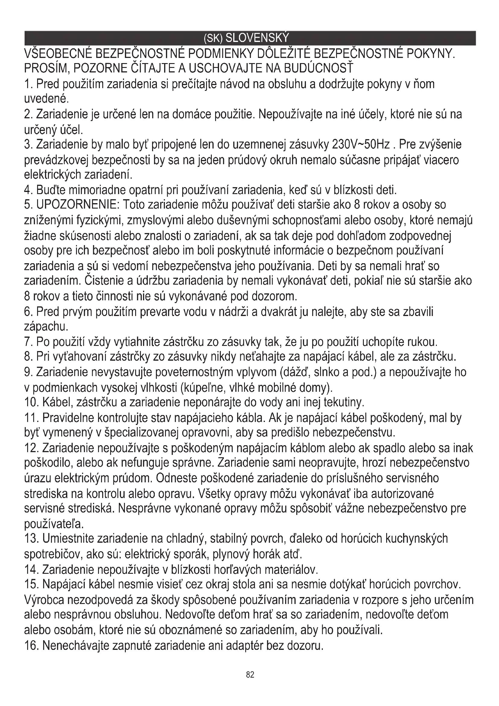 zníženými fyzickými, zmyslovými alebo duševnými schopnosťami alebo osoby, ktoré nemajú žiadne skúsenosti alebo znalosti o zariadení, ak sa tak deje pod dohľadom zodpovednej osoby pre ich bezpečnosť alebo im boli poskytnuté informácie o bezpečnom používaní zariadenia a sú si vedomí nebezpečenstva jeho používania. Deti by sa nemali hrať so zariadením. Čistenie a údržbu zariadenia by nemali vykonávať deti, pokiaľ nie sú staršie ako 8 rokov a tieto činnosti nie sú vykonávané pod dozorom.
