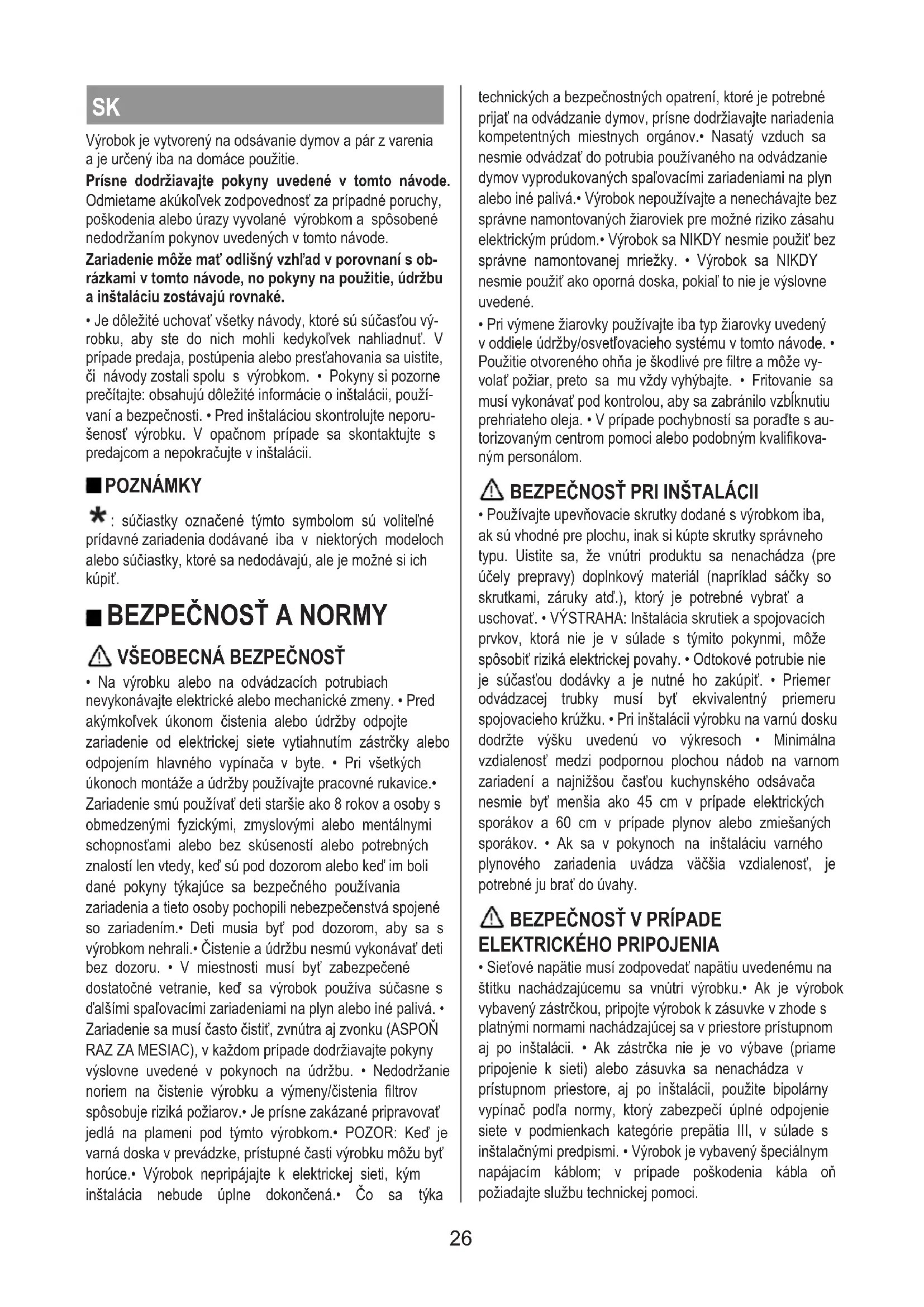 - Systém osvětlení je založen na technologii LED. LED diody poskytují optimální osvětlení, mají až desetkrát delší životnost než běžné žárovky a šetří 90 % elektrické energie. 25SK Výrobok je vytvorený na odsávanie dymov a pár z varenia a je určený iba na domáce použitie. Prísne dodržiavajte pokyny uvedené v tomto návode. Odmietame akúkoľvek zodpovednosť za prípadné poruchy, poškodenia alebo úrazy vyvolané výrobkom a spôsobené nedodržaním pokynov uvedených v tomto návode. Zariadenie môže mať odlišný vzhľad v porovnaní s ob- rázkami v tomto návode, no pokyny na použitie, údržbu a inštaláciu zostávajú rovnaké.