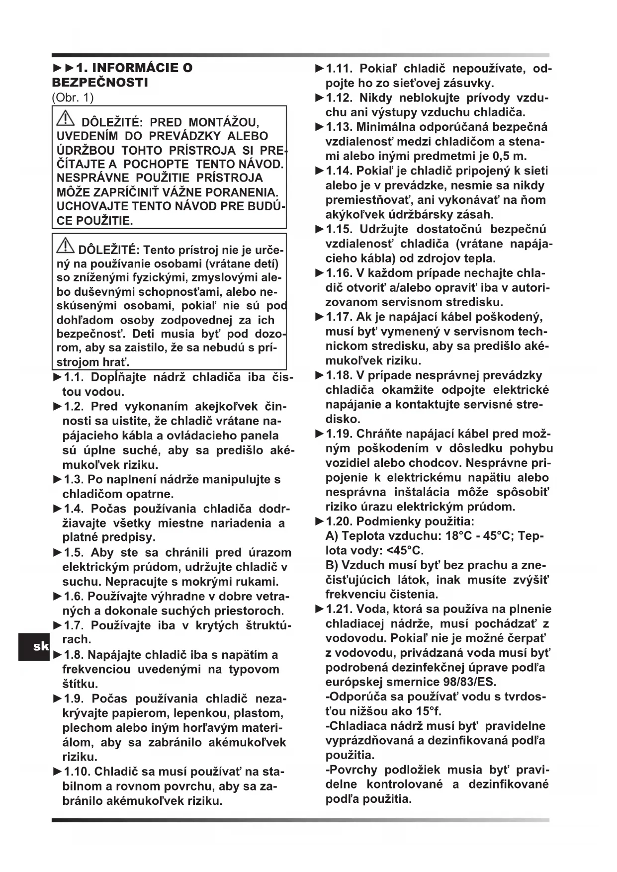 CE POUŽITIE. DÔLEŽITÉ: Tento prístroj nie je urče- ný na používanie osobami (vrátane detí) so zníženými fyzickými, zmyslovými ale- bo duševnými schopnosťami, alebo ne- skúsenými osobami, pokiaľ nie sú pod dohľadom osoby zodpovednej za ich bezpečnosť. Deti musia byť pod dozo- rom, aby sa zaistilo, že sa nebudú s prí- strojom hrať. ►1.1. Dopĺňajte nádrž chladiča iba čis- tou vodou. ►1.2. Pred vykonaním akejkoľvek čin- nosti sa uistite, že chladič vrátane na- pájacieho kábla a ovládacieho panela sú úplne suché, aby sa predišlo aké- mukoľvek riziku. ►1.3. Po naplnení nádrže manipulujte s chladičom opatrne. ►1.4. Počas používania chladiča dodr- žiavajte všetky miestne nariadenia a platné predpisy. ►1.5. Aby ste sa chránili pred úrazom elektrickým prúdom, udržujte chladič v suchu. Nepracujte s mokrými rukami. ►1.6. Používajte výhradne v dobre vetra- ných a dokonale suchých priestoroch. ►1.7. Používajte iba v krytých štruktú- rach. ►1.8. Napájajte chladič iba s napätím a frekvenciou uvedenými na typovom štítku. ►1.9. Počas používania chladič neza- krývajte papierom, lepenkou, plastom, plechom alebo iným horľavým materi- álom, aby sa zabránilo akémukoľvek riziku. ►1.10. Chladič sa musí používať na sta- bilnom a rovnom povrchu, aby sa za- bránilo akémukoľvek riziku. ►1.11. Pokiaľ chladič nepoužívate, od- pojte ho zo sieťovej zásuvky. ►1.12. Nikdy neblokujte prívody vzdu- chu ani výstupy vzduchu chladiča. ►1.13. Minimálna odporúčaná bezpečná vzdialenosť medzi chladičom a stena- mi alebo inými predmetmi je 0,5 m. ►1.14. Pokiaľ je chladič pripojený k sieti alebo je v prevádzke, nesmie sa nikdy premiestňovať, ani vykonávať na ňom akýkoľvek údržbársky zásah. ►1.15. Udržujte dostatočnú bezpečnú vzdialenosť chladiča (vrátane napája- cieho kábla) od zdrojov tepla. ►1.16. V každom prípade nechajte chla- dič otvoriť a/alebo opraviť iba v autori- zovanom servisnom stredisku. ►1.17. Ak je napájací kábel poškodený, musí byť vymenený v servisnom tech- nickom stredisku, aby sa predišlo aké- mukoľvek riziku. ►1.18. V prípade nesprávnej prevádzky chladiča okamžite odpojte elektrické napájanie a kontaktujte servisné stre- disko. ►1.19. Chráňte napájací kábel pred mož- ným poškodením v dôsledku pohybu vozidiel alebo chodcov. Nesprávne pri- pojenie k elektrickému napätiu alebo nesprávna inštalácia môže spôsobiť riziko úrazu elektrickým prúdom. ►1.20. Podmienky použitia: A) Teplota vzduchu: 18°C - 45°C; Tep- lota vody: <45°C. B) Vzduch musí byť bez prachu a zne- čisťujúcich látok, inak musíte zvýšiť frekvenciu čistenia. ►1.21. Voda, ktorá sa používa na plnenie chladiacej nádrže, musí pochádzať z vodovodu. Pokiaľ nie je možné čerpať z vodovodu, privádzaná voda musí byť podrobená dezinfekčnej úprave podľa európskej smernice 98/83/ES. -Odporúča sa používať vodu s tvrdos- ťou nižšou ako 15°f. -Chladiaca nádrž musí byť pravidelne vyprázdňovaná a dezinkovaná podľa použitia. -Povrchy podložiek musia byť pravi- delne kontrolované a dezinkované podľa použitia.sk -Pre dezinfekčné operácie musia byť použité biocídne výrobky, ktoré vy- hovujú európskemu nariadeniu č. 582/2012. ►►2. ROZBALENIE ►2.1. Odstráňte všetky obalové materiály, ktoré boli použité na zabalenie a dodanie chladiča a likvidujte ich podľa platných predpisov. ►2.2. Z obalu vyberte všetky diely. ►2.3. Skontrolujte prípadné škody, ktoré vznikli v priebehu prepravy. Ak sa vám zdá chladič poškodený, okamžite infor- mujte predajcu, u ktorého bol zakúpený. ►►3. MONTÁŽ Chladič je vybavený súpravou na prívod vzduchu a kolesami na uľahčenie manipu- lácie. V závislosti od modelu sú všetky kom- ponenty už namontované, alebo je potreb- né ich namontovať. Komponenty, vrátane zodpovedajúcich skrutiek pre montáž, sa nachádzajú vo vnútri balenia (Obr. 2). ►►4. PREVÁDZKA VAROVANIE: Pred zapnutím chladiča si pozorne prečítajte „INFORMÁCIE O BEZ- PEČNOSTI“. VAROVANIE: Používajte iba čistú vodu, aby ste sa vyhli poruchám alebo anomá- liám. VAROVANIE: Skontrolujte správne uzemnenie vášho elektrického systému. Zapojenie k elektrickej sieti sa musí vy- konávať v súlade s platnými národnými predpismi. Napájajte chladič iba s napä- tím a frekvenciou uvedenými na typovom štítku. ►►4.1. ZAPNUTIE: ►4.1.1. Pripojte chladič k prívodu vody po- mocou závitovej armatúry Obr. 3). ►4.1.2. Naplňte nádrž vodou. Keď nádrž dosiahne maximálnu hladinu, plavák au- tomaticky zablokuje prietok vody. UPOZORNENIE: Chladič je možné pre- vádzkovať pripojený a nepretržite napája- ný do vodovodnej siete. ►4.1.3. Pri plnení skontrolujte, či nedochá- dza k únikom. ►4.1.4. Pripojte napájaciu zástrčku k elek- trickej sieti (Obr. 4). ►4.1.5. Stlačte tlačidlo ON/OFF / POWER pre zapnutie chladiča (Obr. 6).