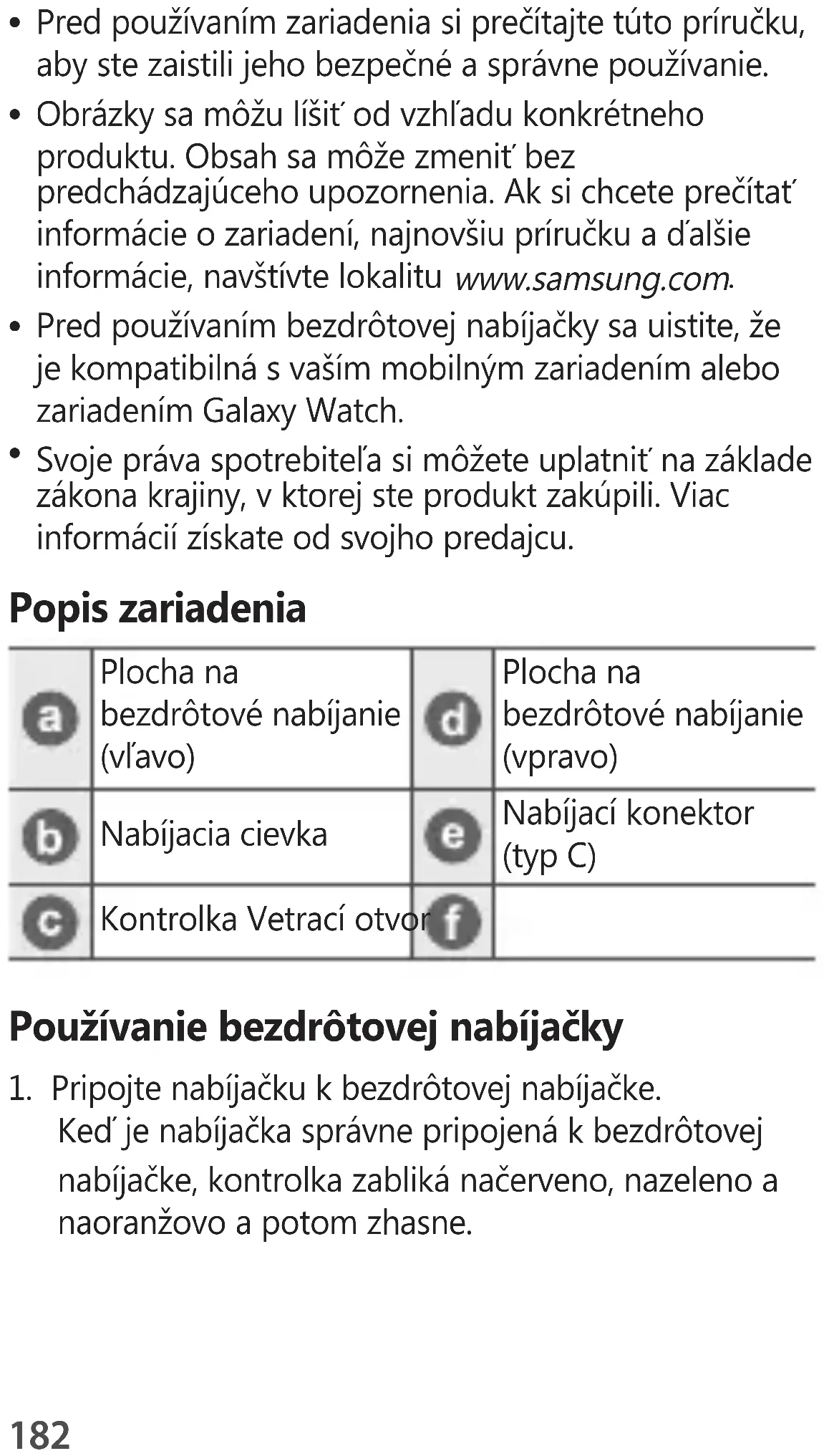 naoranžovo Pri pripojení k sieťovej zásuvke Červená Počas nabíjania Zelená Pri úplnom nabití Bliká načerveno Ak nabíjanie neprebieha správne z dôvodu všeobecnej chyby. Bliká na oranžovo Ak nabíjanie neprebieha správne z dôvodu neschválenej nabíjačky Zhasnutá Keď je mobilné zariadenie alebo zariadenie Galaxy Watch mimo bezdrôtovej nabíjačky alebo keď bezdrôtová nabíjačka nie je pripojená k sieťovej zásuvke