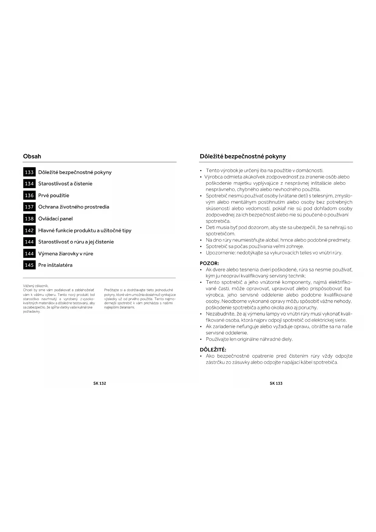 Vážený zákazník, Chceli by sme vám poďakovať a zablahoželať vám k vášmu výberu. Tento nový produkt bol starostlivo navrhnutý a vyrobený z vysoko-kvalitných materiálov a dôsledne testovaný, aby sa zabezpečilo, že spĺňa všetky vaše kulinárske požiadavky. Prečítajte si a dodržiavajte tieto jednoduché pokyny, ktoré vám umožnia dosiahnuť vynikajúce výsledky už od prvého použitia. Tento najmo- dernejší spotrebič k vám prichádza s našimi najlepšími želaniami. SK 133 Dôležité bezpečnostné pokyny