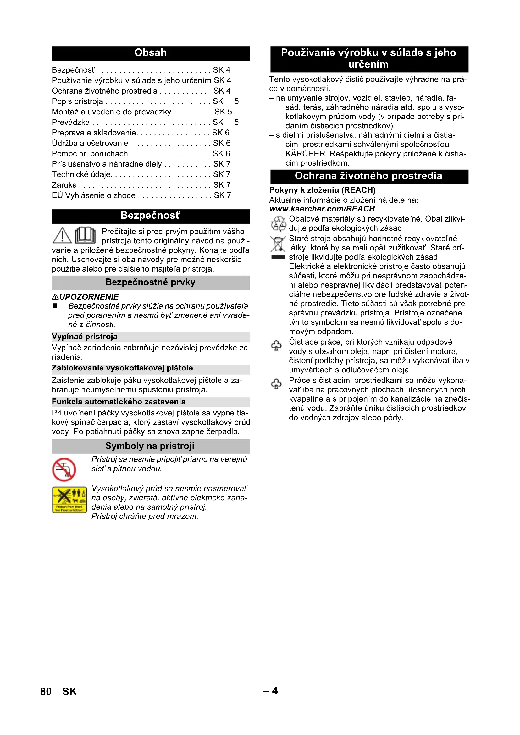 88 dB(A) Se rezervă dreptul la modificări tehnice. Garanţie Declaraţie UE de conformitate Produs: Aparat de curăţare sub presiune Tip: 1.676-xxx Directive UE respectate: 2000/14/CE 2014/30/UE 2006/42/CE (+2009/127/CE) 2011/65/UE Norme armonizate utilizate: EN 50581 EN 55014–1: 2006+A1: 2009+A2: 2011 EN 55014–2: 2015 EN 60335–1 EN 60335–2–79 EN 61000–3–2: 2014 EN 61000–3–3: 2013 EN 62233: 2008 Procedura de evaluare a conformităţii: 2000/14/CE: Anexa V Nivel de zgomot dB(A) măsurat: 85 garantat: 88 Winnenden, 2018/08/01 Chairman of the Board of Management Director Regulatory Affairs & Certification 79RO– 4 Prečítajte si pred prvým použitím vášho prístroja tento originálny návod na použí- vanie a priložené bezpečnostné pokyny. Konajte podľa nich. Uschovajte si oba návody pre možné neskoršie použitie alebo pre ďalšieho majiteľa prístroja. 몇 UPOZORNENIE Bezpečnostné prvky slúžia na ochranu používateľa pred poranením a nesmú byť zmenené ani vyrade- né z činnosti. Vypínač zariadenia zabraňuje nezávislej prevádzke za- riadenia. Zaistenie zablokuje páku vysokotlakovej pištole a za- braňuje neúmyselnému spusteniu prístroja. Pri uvoľnení páčky vysokotlakovej pištole sa vypne tla- kový spínač čerpadla, ktorý zastaví vysokotlakový prúd vody. Po potiahnutí páčky sa znova zapne čerpadlo. Tento vysokotlakový čistič používajte výhradne na prá- ce v domácnosti. – na umývanie strojov, vozidiel, stavieb, náradia, fa- sád, terás, záhradného náradia atď. spolu s vyso- kotlakovým prúdom vody (v prípade potreby s pri- daním čistiacich prostriedkov). – s dielmi príslušenstva, náhradnými dielmi a čistia- cimi prostriedkami schválenými spoločnosťou KÄRCHER. Rešpektujte pokyny priložené k čistia- cim prostriedkom. Pokyny k zloženiu (REACH) Aktuálne informácie o zložení nájdete na: www.kaercher.com/REACH Obsah Bezpečnosť . . . . . . . . . . . . . . . . . . . . . . . . . . SK 4 Používanie výrobku v súlade s jeho určením SK 4 Ochrana životného prostredia . . . . . . . . . . . . SK 4 Popis prístroja . . . . . . . . . . . . . . . . . . . . . . . . SK5 Montáž a uvedenie do prevádzky . . . . . . . . . SK 5 Prevádzka . . . . . . . . . . . . . . . . . . . . . . . . . . . SK5 Preprava a skladovanie. . . . . . . . . . . . . . . . . SK 6 Údržba a ošetrovanie . . . . . . . . . . . . . . . . . . SK 6 Pomoc pri poruchách . . . . . . . . . . . . . . . . . . SK 6 Príslušenstvo a náhradné diely . . . . . . . . . . . SK 7 Technické údaje. . . . . . . . . . . . . . . . . . . . . . . SK 7 Záruka . . . . . . . . . . . . . . . . . . . . . . . . . . . . . . SK 7 EÚ Vyhlásenie o zhode . . . . . . . . . . . . . . . . . SK 7 Bezpečnosť Bezpečnostné prvky Vypínač prístroja Zablokovanie vysokotlakovej pištole Funkcia automatického zastavenia Symboly na prístroji Prístroj sa nesmie pripojiť priamo na verejnú sieť s pitnou vodou. Vysokotlakový prúd sa nesmie nasmerovať na osoby, zvieratá, aktívne elektrické zaria- denia alebo na samotný prístroj. Prístroj chráňte pred mrazom. Používanie výrobku v súlade s jeho určením Ochrana životného prostredia Obalové materiály sú recyklovateľné. Obal zlikvi- dujte podľa ekologických zásad. Staré stroje obsahujú hodnotné recyklovateľné látky, ktoré by sa mali opäť zužitkovať. Staré prí- stroje likvidujte podľa ekologických zásad Elektrické a elektronické prístroje často obsahujú súčasti, ktoré môžu pri nesprávnom zaobchádza- ní alebo nesprávnej likvidácii predstavovať poten- ciálne nebezpečenstvo pre ľudské zdravie a život- né prostredie. Tieto súčasti sú však potrebné pre správnu prevádzku prístroja. Prístroje označené týmto symbolom sa nesmú likvidovať spolu s do- movým odpadom. Čistiace práce, pri ktorých vznikajú odpadové vody s obsahom oleja, napr. pri čistení motora, čistení podlahy prístroja, sa môžu vykonávať iba v umyvárkach s odlučovačom oleja. Práce s čistiacimi prostriedkami sa môžu vykoná- vať iba na pracovných plochách utesnených proti kvapaline a s pripojením do kanalizácie na znečis- tenú vodu. Zabráňte úniku čistiacich prostriedkov do vodných zdrojov alebo pôdy. 80 SK– 5 Rozsah dodávky zariadenia (v závislosti od modelu) je znázornený na obale. Tento návod na obsluhu popisuje všetky možné voliteľné vybavenia. Obrázky sú uvedené na stranách s obrázkami 1 Vysokotlaková prípojka 2 Vypínač zariadenia „0/OFF“ / „I/ON“ 3 Hák pre uschovanie 4 Rukoväť 5 Prenosný držiak, vysúvacia 6 Vysávacia hadica na čistiaci prostriedok s filtrom na čistiaci prostriedok a kryt 7 Nádrž čistiaceho prostriedku 8 Spojovací diel na pripojenie prívodu vody 9 Prípojka vody so zabudovaným sitkom 10 Uloženie trysky 11 Uschovanie vysokotlakovej pištole 12 Prípojka siete so sieťovou zástrčkou 13 Prepravné koliesko 14 Vysokotlaková pištoľ Full Control 15 Zobrazenie tlaku