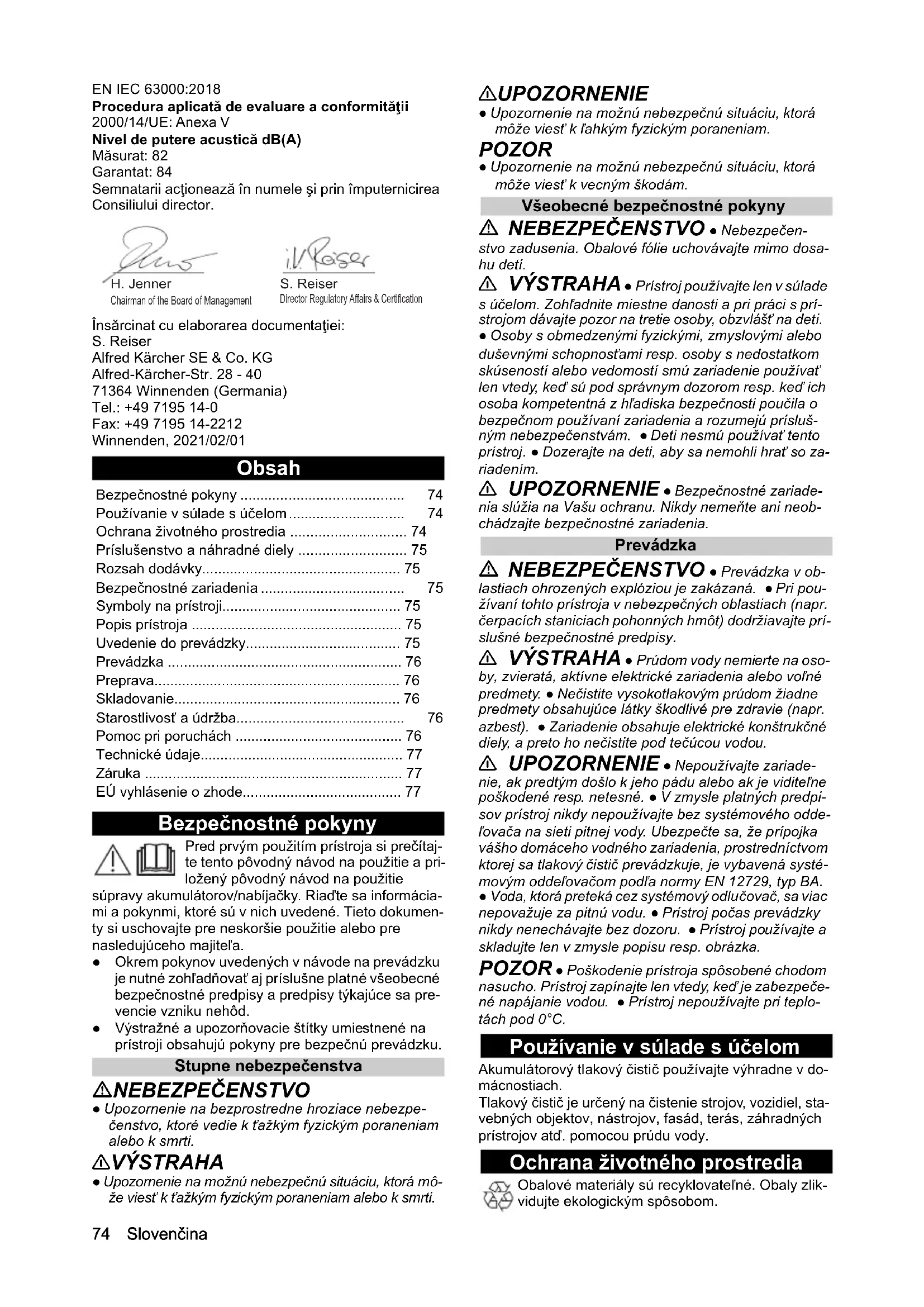 - dB(A) 8474 Slovenčina EN IEC 63000:2018 Procedura aplicată de evaluare a conformităţii 2000/14/UE: Anexa V Nivel de putere acustică dB(A) Măsurat: 82 Garantat: 84 Semnatarii acţionează în numele şi prin împuternicirea Consiliului director. Însărcinat cu elaborarea documentaţiei: S. Reiser Alfred Kärcher SE & Co. KG Alfred-Kärcher-Str. 28 - 40 71364 Winnenden (Germania) Tel.: +49 7195 14-0 Fax: +49 7195 14-2212 Winnenden, 2021/02/01 Obsah Bezpečnostné pokyny Pred prvým použitím prístroja si prečítaj- te tento pôvodný návod na použitie a pri- ložený pôvodný návod na použitie súpravy akumulátorov/nabíjačky. Riaďte sa informácia- mi a pokynmi, ktoré sú v nich uvedené. Tieto dokumen- ty si uschovajte pre neskoršie použitie alebo pre nasledujúceho majiteľa. ● Okrem pokynov uvedených v návode na prevádzku je nutné zohľadňovať aj príslušne platné všeobecné bezpečnostné predpisy a predpisy týkajúce sa pre- vencie vzniku nehôd. ● Výstražné a upozorňovacie štítky umiestnené na prístroji obsahujú pokyny pre bezpečnú prevádzku. Stupne nebezpečenstva NEBEZPEČENSTVO ● Upozornenie na bezprostredne hroziace nebezpe- čenstvo, ktoré vedie k ťažkým fyzickým poraneniam alebo k smrti. 몇 VÝSTRAHA ● Upozornenie na možnú nebezpečnú situáciu, ktorá mô- že viesť k ťažkým fyzickým poraneniam alebo k smrti. 몇 UPOZORNENIE ● Upozornenie na možnú nebezpečnú situáciu, ktorá môže viesť k ľahkým fyzickým poraneniam. POZOR ● Upozornenie na možnú nebezpečnú situáciu, ktorá môže viesť k vecným škodám. Všeobecné bezpečnostné pokyny NEBEZPEČENSTVO ● Nebezpečen- stvo zadusenia. Obalové fólie uchovávajte mimo dosa- hu detí. 몇 VÝSTRAHA ● Prístroj používajte len v súlade s účelom. Zohľadnite miestne danosti a pri práci s prí- strojom dávajte pozor na tretie osoby, obzvlášť na deti. ● Osoby s obmedzenými fyzickými, zmyslovými alebo duševnými schopnosťami resp. osoby s nedostatkom skúseností alebo vedomostí smú zariadenie používať len vtedy, keď sú pod správnym dozorom resp. keď ich osoba kompetentná z hľadiska bezpečnosti poučila o bezpečnom používaní zariadenia a rozumejú prísluš- ným nebezpečenstvám. ● Deti nesmú používať tento prístroj. ● Dozerajte na deti, aby sa nemohli hrať so za- riadením. 몇 UPOZORNENIE ● Bezpečnostné zariade- nia slúžia na Vašu ochranu. Nikdy nemeňte ani neob- chádzajte bezpečnostné zariadenia. Prevádzka NEBEZPEČENSTVO ● Prevádzka v ob- lastiach ohrozených explóziou je zakázaná. ● Pri pou- žívaní tohto prístroja v nebezpečných oblastiach (napr. čerpacích staniciach pohonných hmôt) dodržiavajte prí- slušné bezpečnostné predpisy. 몇 VÝSTRAHA ● Prúdom vody nemierte na oso- by, zvieratá, aktívne elektrické zariadenia alebo voľné predmety. ● Nečistite vysokotlakovým prúdom žiadne predmety obsahujúce látky škodlivé pre zdravie (napr. azbest). ● Zariadenie obsahuje elektrické konštrukčné diely, a preto ho nečistite pod tečúcou vodou. 몇 UPOZORNENIE ● Nepoužívajte zariade- nie, ak predtým došlo k jeho pádu alebo ak je viditeľne poškodené resp. netesné. ● V zmysle platných predpi- sov prístroj nikdy nepoužívajte bez systémového odde- ľovača na sieti pitnej vody. Ubezpečte sa, že prípojka vášho domáceho vodného zariadenia, prostredníctvom ktorej sa tlakový čistič prevádzkuje, je vybavená systé- movým oddeľovačom podľa normy EN 12729, typ BA. ● Voda, ktorá preteká cez systémový odlučovač, sa viac nepovažuje za pitnú vodu. ● Prístroj počas prevádzky nikdy nenechávajte bez dozoru. ● Prístroj používajte a skladujte len v zmysle popisu resp. obrázka. POZOR ● Poškodenie prístroja spôsobené chodom nasucho. Prístroj zapínajte len vtedy, keď je zabezpeče- né napájanie vodou. ● Prístroj nepoužívajte pri teplo- tách pod 0°C. Používanie v súlade s účelom Akumulátorový tlakový čistič používajte výhradne v do- mácnostiach. Tlakový čistič je určený na čistenie strojov, vozidiel, sta- vebných objektov, nástrojov, fasád, terás, záhradných prístrojov atď. pomocou prúdu vody. Ochrana životného prostredia Obalové materiály sú recyklovateľné. Obaly zlik- vidujte ekologickým spôsobom. Bezpečnostné pokyny p. 74