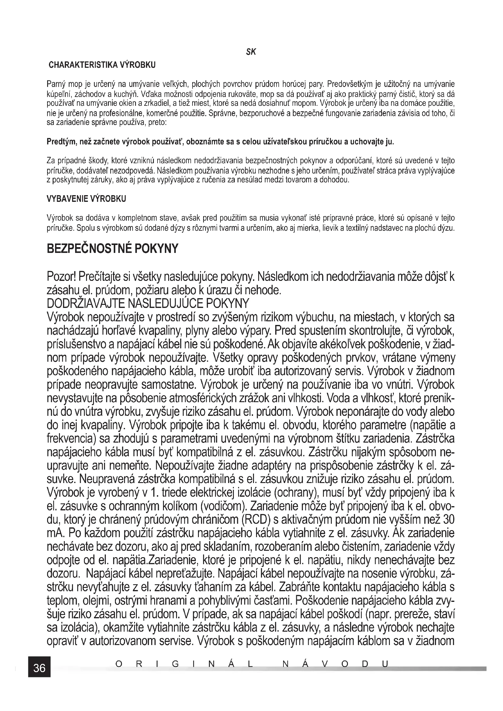 Parný mop je určený na umývanie veľkých, plochých povrchov prúdom horúcej pary. Predovšetkým je užitočný na umývanie kúpeľní, záchodov a kuchýň. Vďaka možnosti odpojenia rukoväte, mop sa dá používať aj ako praktický parný čistič, ktorý sa dá používať na umývanie okien a zrkadiel, a tiež miest, ktoré sa nedá dosiahnuť mopom. Výrobok je určený iba na domáce použitie, nie je určený na profesionálne, komerčné použitie. Správne, bezporuchové a bezpečné fungovanie zariadenia závisia od toho, či sa zariadenie správne používa, preto: Predtým, než začnete výrobok používať, oboznámte sa s celou užívateľskou príručkou a uchovajte ju. Za prípadné škody, ktoré vzniknú následkom nedodržiavania bezpečnostných pokynov a odporúčaní, ktoré sú uvedené v tejto príručke, dodávateľ nezodpovedá. Následkom používania výrobku nezhodne s jeho určením, používateľ stráca práva vyplývajúce z poskytnutej záruky, ako aj práva vyplývajúce z ručenia za nesúlad medzi tovarom a dohodou.