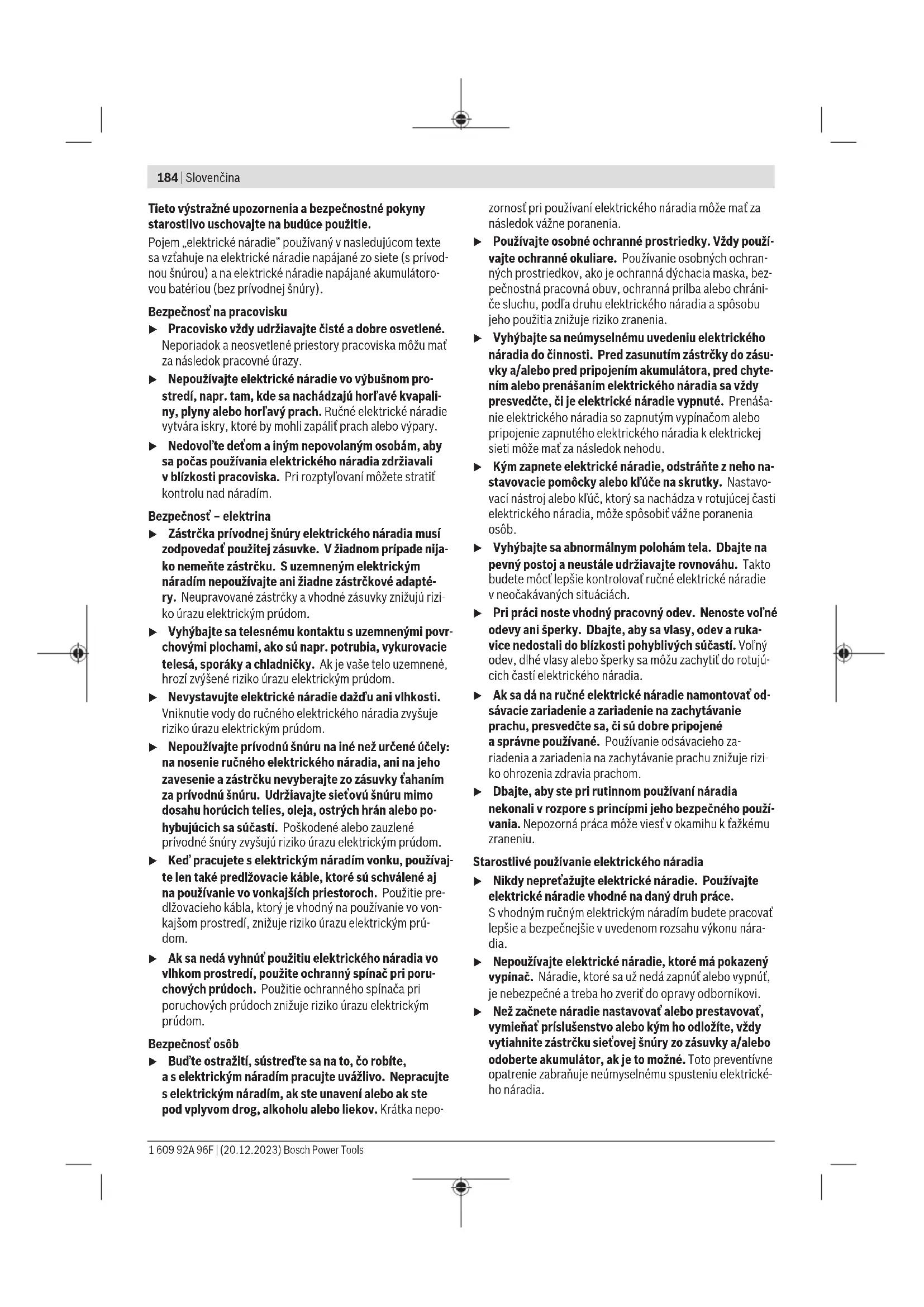 Vkladanie pracovného nástroja (pozri obrázok G) Upozornenie: Nástroje bez stopky SDS-plus nepoužívajte na vŕtanie sfunkciou kladiva ani na sekanie! Nástroje bez stop- ky SDS-plus aich skľučovadlo sa pri vŕtaní spríklepom apri sekaní poškodia. – Vložte skľučovadlo sozubeným vencom (31). – Otvorte skľučovadlo sozubeným vencom (31) otočením tak, aby sa nástroj dal vložiť. Vložte pracovný nástroj. – Zasuňte doťahovací kľúč (35) do príslušných otvorov sk- ľučovadla sozubeným vencom (31) anástroj rovnomerne utiahnite. – Prepínač pracovných režimov (17) otočte do polohy „Vŕ- tanie“. Vybratie pracovného nástroja (pozri obrázok H) – Otočte objímku skľučovadla sozubeným vencom (31) po- mocou doťahovacieho kľúča (35) proti smeru pohybu hodinových ručičiek tak, aby sa pracovný nástroj dal vy- brať. 1 609 92A 96F | (20.12.2023) Bosch Power ToolsSlovenčina | 191 Výmena nástroja, rýchloupínacie výmenné skľučovadlo