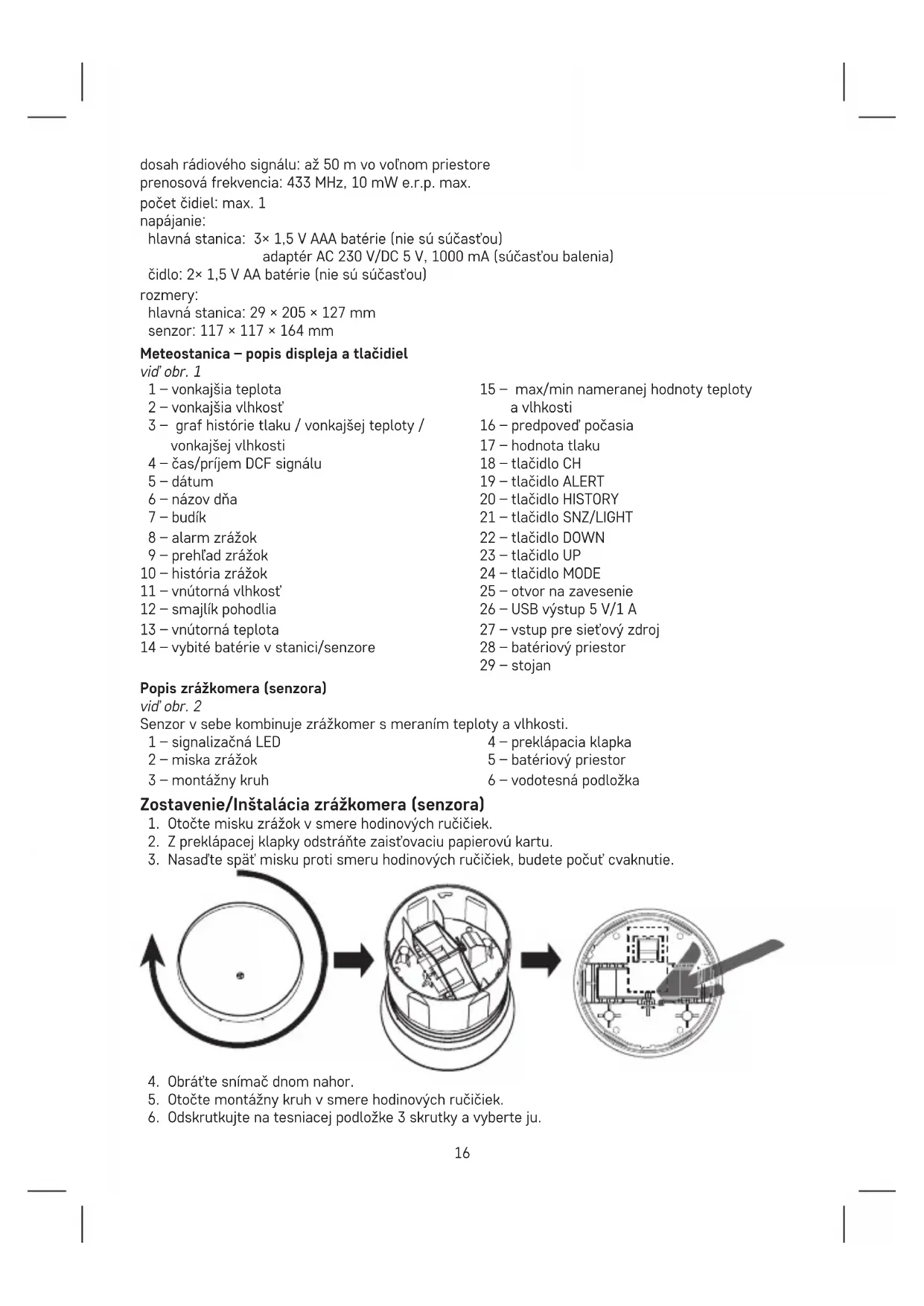 senzora. Používajte iba 1,5V alkalické batérie rovnakého typu, nepoužívajte 1,2V nabíjacie batérie. Nižšie napätie môže spôsobiť nefunkčnosť oboch jednotiek.