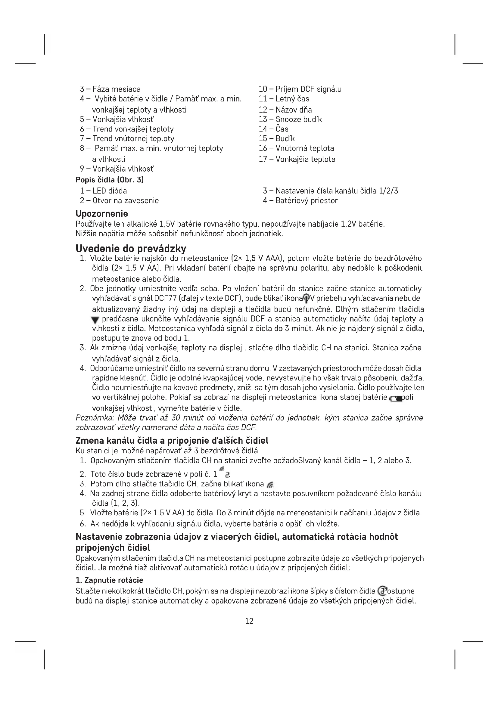 Stlačte tlačidlo CH, ikona šípky zmizne. Rádiom riadené hodiny (DCF77) Po vložení batérií do stanice začne stanica automaticky vyhľadávať signál DCF77 (ďalej v texte DCF), bude blikať ikona . V priebehu vyhľadávania nebude aktualizovaný žiadny iný údaj na displeji a tlačidlá budú nefunkčné. Dlhým stlačením tlačidla predčasne ukončíte vyhľadávanie signálu DCF a stanica automaticky načíta údaj teploty a vlhkosti z čidla. Signál DCF nájdený – ikona prestane blikať a zobrazí sa aktuálny čas a dátum s ikonou . Signál DCF nenájdený – ikona DCF nebude zobrazená. Pre opätovné vyhľadanie signálu DCF (3–8 minút) stlačte dlho tlačidlo , pre zrušenie vyhľadania signálu DCF stlačte znovu dlho tlačidlo . DCF signál bude denne priebežne synchronizovaný. V dobe platnosti letného času bude zobrazená ikona vedľa ikony DCF. V normálnych podmienkach (v bezpečnej vzdialenosti od zdrojov rušenia, ako sú napr. televízne prijímače, monitory počítačov) trvá zachytenie časového signálu niekoľko minút. V prípade, že meteostanica tento signál nezachytí, postupujte podľa nasledujúcich krokov: