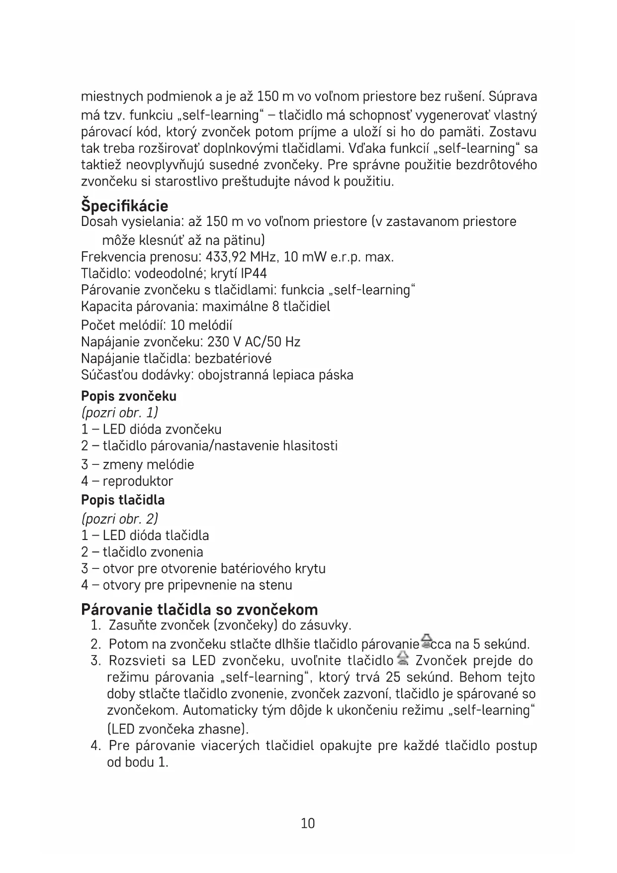 - Zvonček (prijímač) je určený len pre vnútorné použitie v suchých priestoroch.