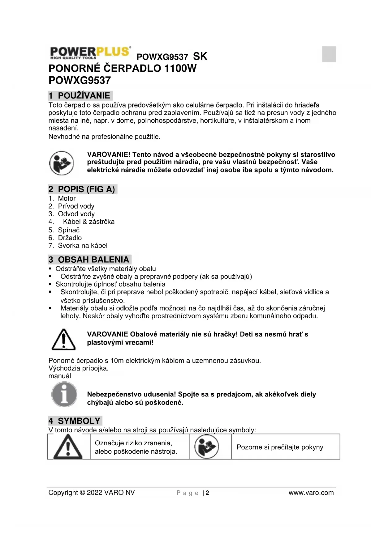 - v stacionárnej polohe s pružným hadicovým vedením. Pozor! Čerpadlo by ste nikdy nemali inštalovať tak, že ho zavesíte z dodávacieho potrubia alebo napájacieho kábla bez opory. Ponorné motorové čerpadlo musí byť zavesené za špeciálne dodanú rukoväť alebo umiestnené na spodku hriadeľa. Na zabezpečenie správneho fungovania čerpadla musí byť spodok hriadeľa udržiavaný v čistom stave bez usadenín a nečistôt. Ak hladina vody príliš klesne, nečistoty na hriadeli sa rýchlo vysušia a zabránia spusteniu čerpadla. Preto je potrebné ponorné čerpadlo pravidelne kontrolovať (vykonať spúšťacie testy). Plavák sa nastavuje takým spôsobom, aby bolo čerpadlo možné okamžite spustiť. Poznámka! Hriadeľ čerpadla by mal mať minimálne rozmery 40 x 40 x 50 cm, aby sa mohol plavákový spínač voľne pohybovať.POWXG9537 SK Copyright © 2022 VARO NV P a g e | 4 www.varo.com Sieťový zdroj Vaše ponorné čerpadlo je vybavené nárazuvzdornou zástrčkou podľa predpisov. Čerpadlo je dimenzované na pripojenie k bezpečnostnej zásuvke 220/230 V- 50 Hz. Zabezpečte dostatočné zaistenie (min. 6 A) a výborný stav zásuvky. Zástrčku zapojte do zásuvky a čerpadlo je pripravené na prevádzku. Dôležitá poznámka! Ak sa sieťový kábel alebo zástrčka poškodí nejakou externou činnosťou, je zakázané kábel opravovať.