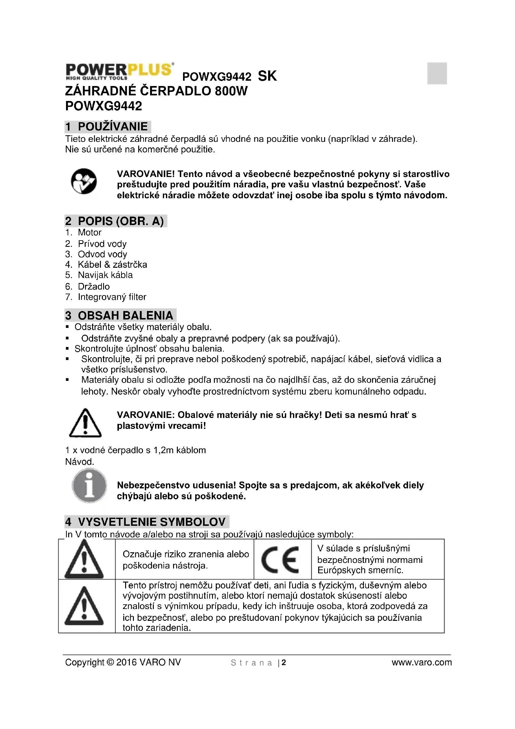 Napájací zdroj musí spĺňať technické požiadavky zobrazené na produkte. Podmienky pripojenia si pozrite v pokynoch vášho dodávateľa energie. Ak čerpadlo alebo napájací kábel nespĺňajú požiadavky, nepripájajte čerpadlo! Čerpadlo nikdy nenoste za kábel. Nikdy neodstraňujte zástrčku a neskracujte kábel. V opačnom prípade dôjde k zániku vašej záruky. Pripojenie (zástrčku a zásuvku) udržiavajte suché. Čerpadlo nie je vhodné na použitie v bazénoch a jazerách alebo pri iných situáciách, kde by mohli prísť ľudia do fyzického kontaktu s vodou, a preto sa nesmie používať na tento účel. Pri čistení alebo vykonávaní údržby jazierka čerpadlo vždy odpojte od napájacieho zdroja. Toto čerpadlo je vhodné na čerpanie vody s minimálnou teplotou 4°C a maximálnou teplotou 35°C. Čerpadlo nesmie bežať naprázdno, pretože by to spôsobilo trvalú škodu. Ak chcete čerpadlo čistiť alebo robiť na ňom údržbu, vždy ho odpojte od elektrickej siete. Z času na čas vyčistite komory, opláchnite ich čistou vodou, čím zabezpečíte, že nebudú upchaté nečistotami.POWXG9442 SK Copyright © 2016 VARO NV S t r a n a | 5 www.varo.com