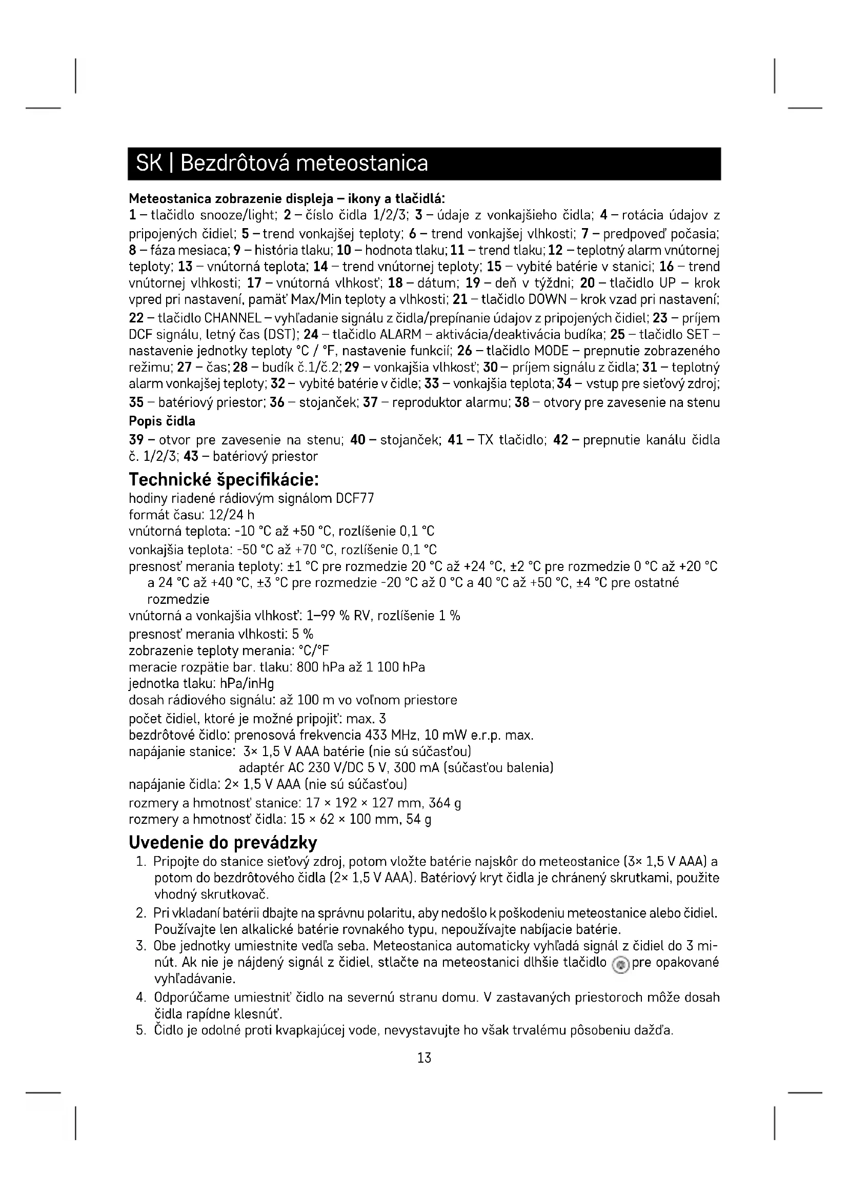 5. Čidlo je odolné proti kvapkajúcej vode, nevystavujte ho však trvalému pôsobeniu dažďa.14
