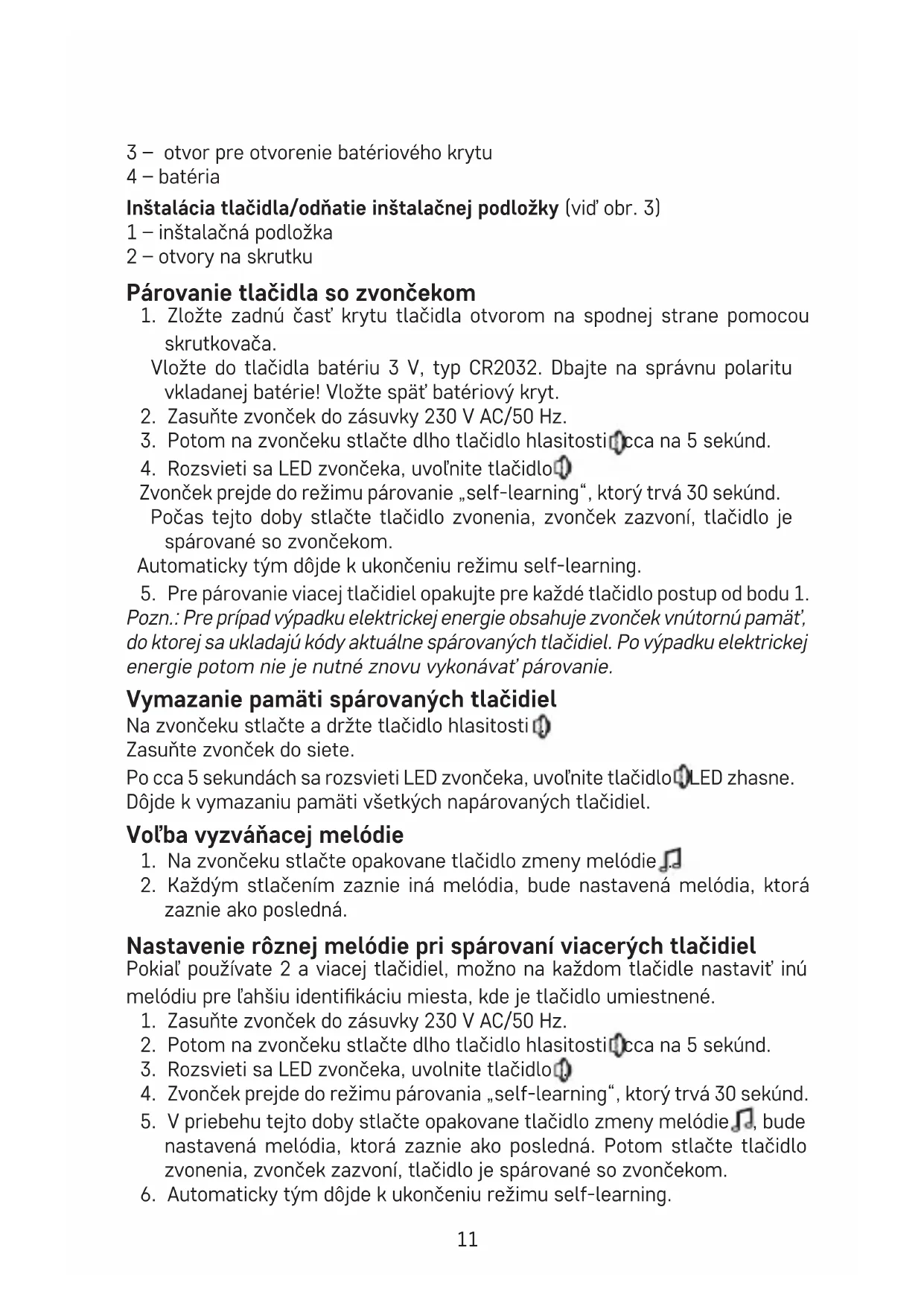 zaznie ako posledná. Nastavenie rôznej melódie pri spárovaní viacerých tlačidiel Pokiaľ používate 2 a viacej tlačidiel, možno na každom tlačidle nastaviť inú melódiu pre ľahšiu identikáciu miesta, kde je tlačidlo umiestnené.
