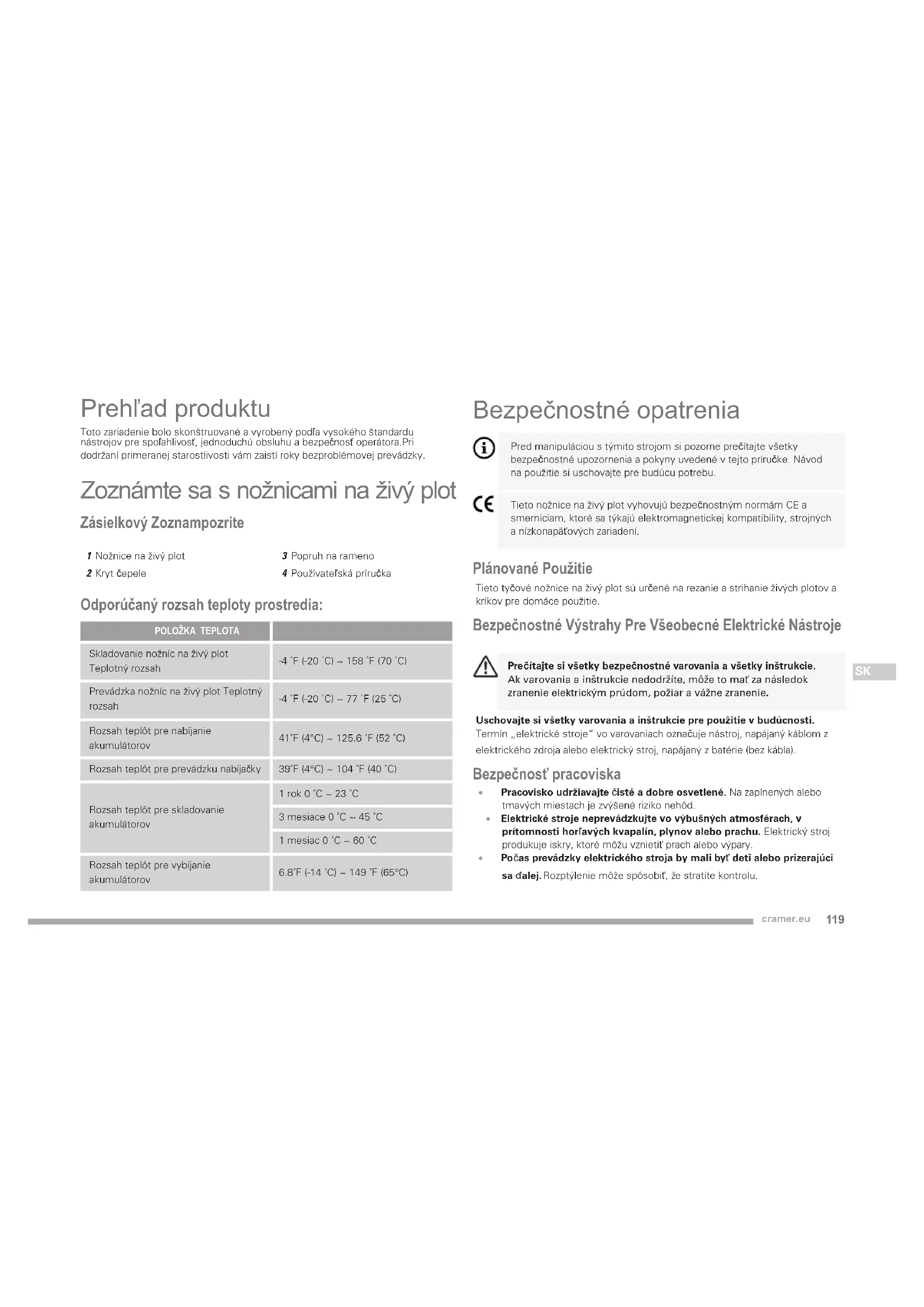 - Počas prevádzky elektrického stroja by mali byť deti alebo prizerajúci sa ďalej. Rozptýlenie môže spôsobiť, že stratíte kontrolu. Odporúčaný rozsah teploty prostredia: POLOŽKA TEPLOTASkladovanie nožníc na živý plot Teplotný rozsah-4 ˚F (-20 ˚C) ~ 158 ˚F (70 ˚C)Prevádzka nožníc na živý plot Teplotný rozsah-4 ˚F (-20 ˚C) ~ 77 ˚F (25 ˚C)Rozsah teplôt pre nabíjanie akumulátorov41˚F (4°C) ~ 125.6 ˚F (52 ˚C)Rozsah teplôt pre prevádzku nabíjačky39˚F (4°C) ~ 104 ˚F (40 ˚C)Rozsah teplôt pre skladovanie akumulátorov1 rok 0 ˚C ~ 23 ˚C3 mesiace 0 ˚C ~ 45 ˚C1 mesiac 0 ˚C ~ 60 ˚CRozsah teplôt pre vybíjanie akumulátorov6.8˚F (-14 ˚C) ~ 149 ˚F (65°C) Prehľad produktu Toto zariadenie bolo skonštruované a vyrobený podľa vysokého štandardu nástrojov pre spoľahlivosť, jednoduchú obsluhu a bezpečnosť operátora.Pri dodržaní primeranej starostlivosti vám zaistí roky bezproblémovej prevádzky. Zoznámte sa s nožnicami na živý plot Zásielkový Zoznampozrite120 cramer.eu