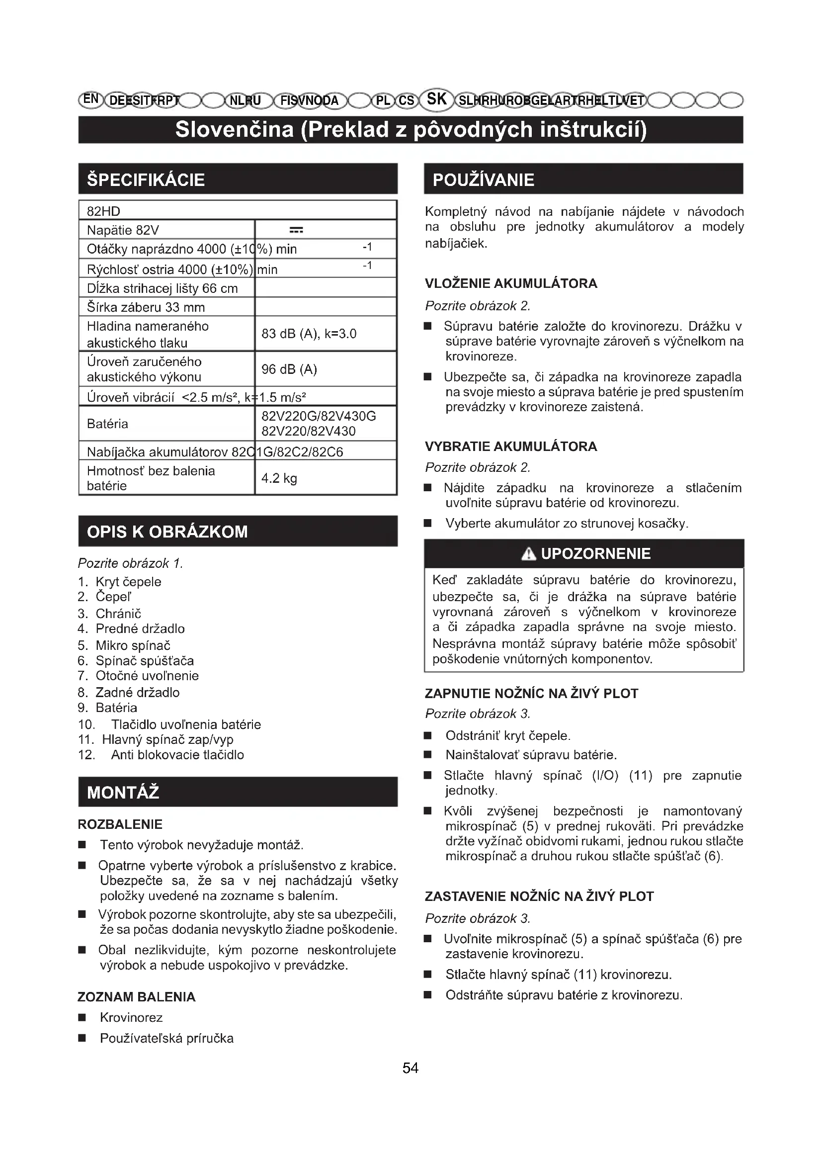 Pozrite obrázok 2. Nájdite západku na krovinoreze a stlačením uvoľnite súpravu batérie od krovinorezu. Vyberte akumulátor zo strunovej kosačky. UPOZORNENIE Keď zakladáte súpravu batérie do krovinorezu, ubezpečte sa, či je drážka na súprave batérie vyrovnaná zároveň s výčnelkom v krovinoreze a či západka zapadla správne na svoje miesto. Nesprávna montáž súpravy batérie môže spôsobiť poškodenie vnútorných komponentov. ZAPNUTIE NOŽNÍC NA ŽIVÝ PLOT Pozrite obrázok 3. Odstrániť kryt čepele. Nainštalovať súpravu batérie. Stlačte hlavný spínač (I/O) (11) pre zapnutie jednotky. Kvôli zvýšenej bezpečnosti je namontovaný mikrospínač (5) v prednej rukoväti. Pri prevádzke držte vyžínač obidvomi rukami, jednou rukou stlačte mikrospínač a druhou rukou stlačte spúšťač (6). ZASTAVENIE NOŽNÍC NA ŽIVÝ PLOT Pozrite obrázok 3. Uvoľnite mikrospínač (5) a spínač spúšťača (6) pre zastavenie krovinorezu. Stlačte hlavný spínač (11) krovinorezu. Odstráňte súpravu batérie z krovinorezu. 54Slovenčina (Preklad z pôvodných inštrukcií)