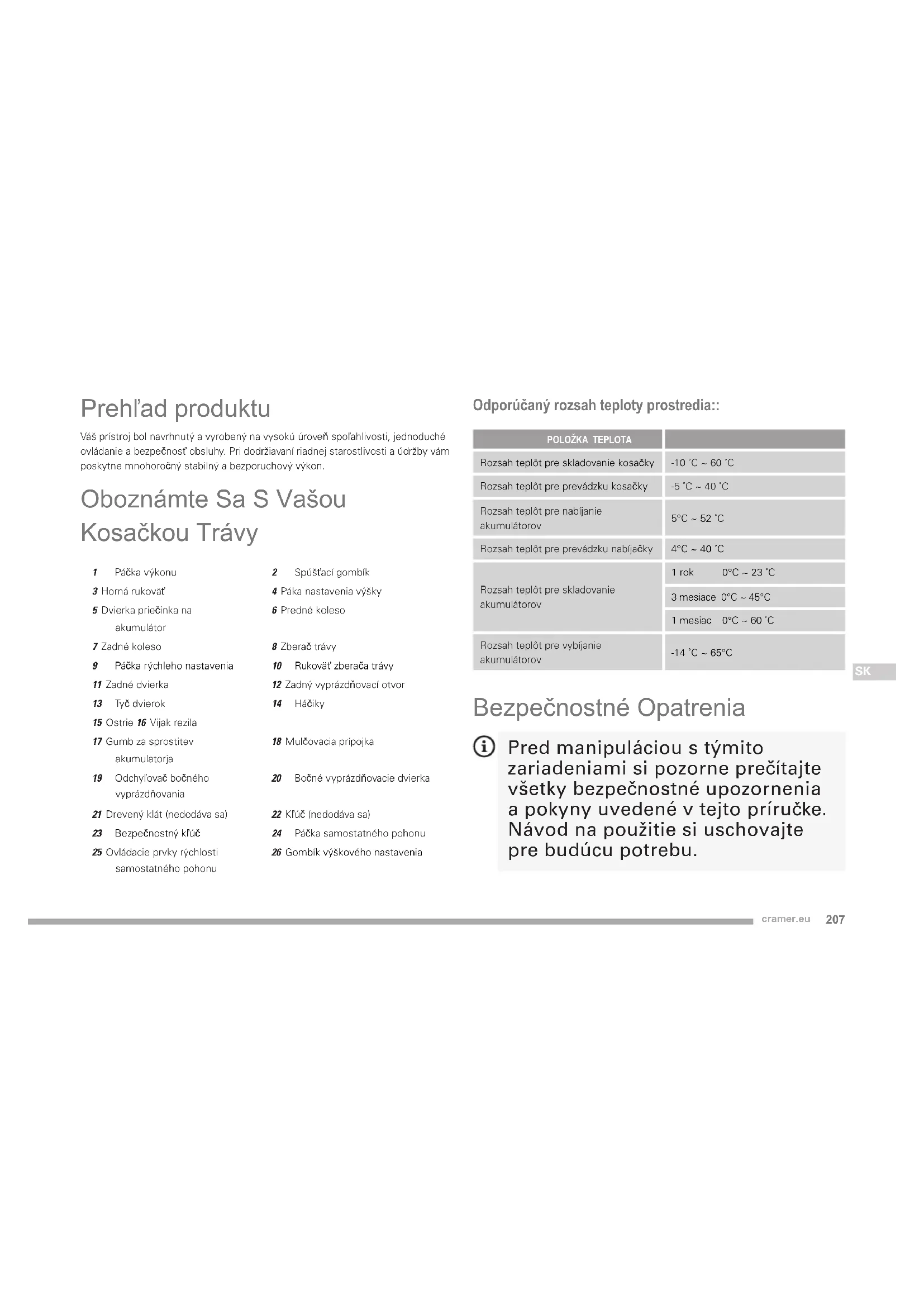Prehľad produktu Váš prístroj bol navrhnutý a vyrobený na vysokú úroveň spoľahlivosti, jednoduché ovládanie a bezpečnosť obsluhy. Pri dodržiavaní riadnej starostlivosti a údržby vám poskytne mnohoročný stabilný a bezporuchový výkon. Oboznámte Sa S Vašou Kosačkou Trávy 1 Páčka výkonu 2 Spúšťací gombík 3 Horná rukoväť4 Páka nastavenia výšky5 Dvierka priečinka na akumulátor6 Predné koleso7 Zadné koleso8 Zberač trávy 9 Páčka rýchleho nastavenia 10 Rukoväť zberača trávy 11 Zadné dvierka12 Zadný vyprázdňovací otvor 13 Tyč dvierok 14 Háčiky 15 Ostrie 16 Vijak rezila17 Gumb za sprostitev akumulatorja18 Mulčovacia prípojka 19 Odchyľovač bočného vyprázdňovania 20 Bočné vyprázdňovacie dvierka 21 Drevený klát (nedodáva sa)22 Kľúč (nedodáva sa) 23 Bezpečnostný kľúč 24 Páčka samostatného pohonu 25 Ovládacie prvky rýchlosti samostatného pohonu26 Gombík výškového nastavenia Odporúčaný rozsah teploty prostredia:: POLOŽKA TEPLOTARozsah teplôt pre skladovanie kosačky-10 ˚C ~ 60 ˚CRozsah teplôt pre prevádzku kosačky-5 ˚C ~ 40 ˚CRozsah teplôt pre nabíjanie akumulátorov5°C ~ 52 ˚CRozsah teplôt pre prevádzku nabíjačky4°C ~ 40 ˚CRozsah teplôt pre skladovanie akumulátorov1 rok 0°C ~ 23 ˚C3 mesiace 0°C ~ 45°C1 mesiac 0°C ~ 60 ˚CRozsah teplôt pre vybíjanie akumulátorov-14 ˚C ~ 65°C Bezpečnostné Opatrenia Pred manipuláciou s týmito zariadeniami si pozorne prečítajte všetky bezpečnostné upozornenia a pokyny uvedené v tejto príručke. Návod na použitie si uschovajte pre budúcu potrebu.208 cramer.eu