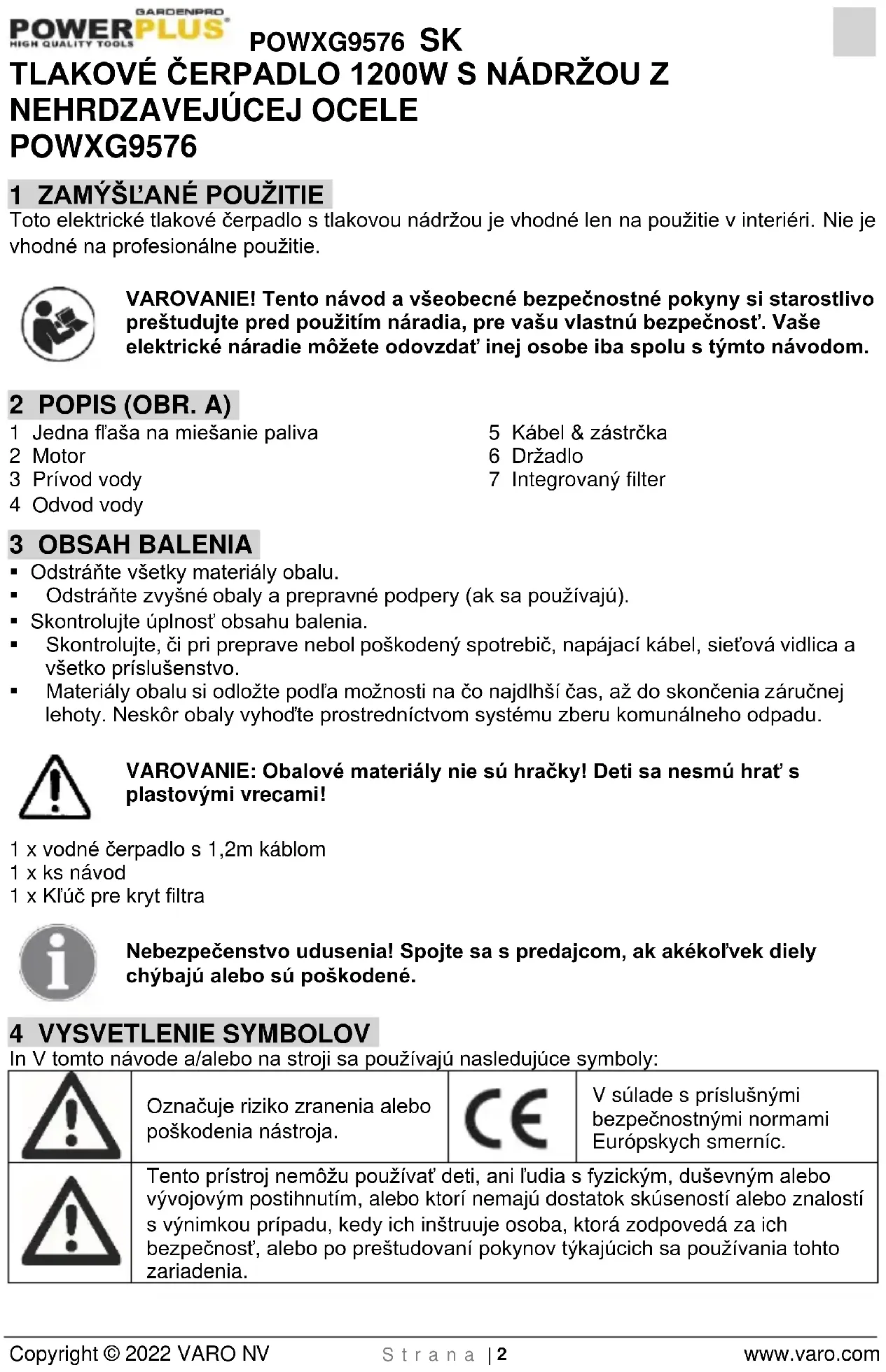 Tento prístroj nemôžu používať deti, ani ľudia s fyzickým, duševným alebo vývojovým postihnutím, alebo ktorí nemajú dostatok skúseností alebo znalostí s výnimkou prípadu, kedy ich inštruuje osoba, ktorá zodpovedá za ich bezpečnosť, alebo po preštudovaní pokynov týkajúcich sa používania tohto zariadenia.POWXG9576 SK Copyright © 2022 VARO NV S t r a n a | 3 www.varo.com